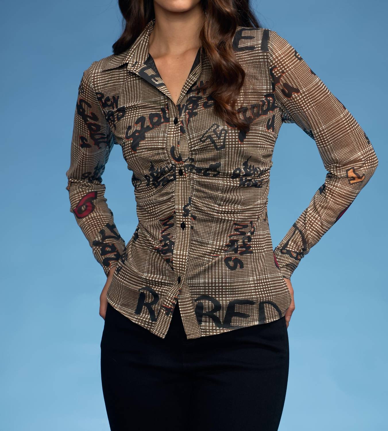This button down shirt is comfortable yet polished. Introducing the Oolala Plaid/Numbers Rouched Mesh Shirt, a striking piece in khaki designed to make a statement at any cocktail party. This mesh shirt features long sheer sleeves and a collared neckline, adorned with a unique houndstooth print that includes letters and numbers. Crafted from 95% Polyester and 5% Spandex, it offers a fitted silhouette with a ruched front and classic button closure. Care is easy with dry cleaning recommended, keeping your style effortlessly chic and on-trend with Y2K vibes.