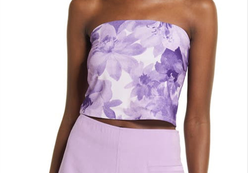 Purple Moss Bloom print | Strapless design | Relaxed fit | Elasticized tube-top neckline | Lightweight fabric | Medium size | Ideal for summer | Stylish casual look | From Nordstrom | Open Edit Brand