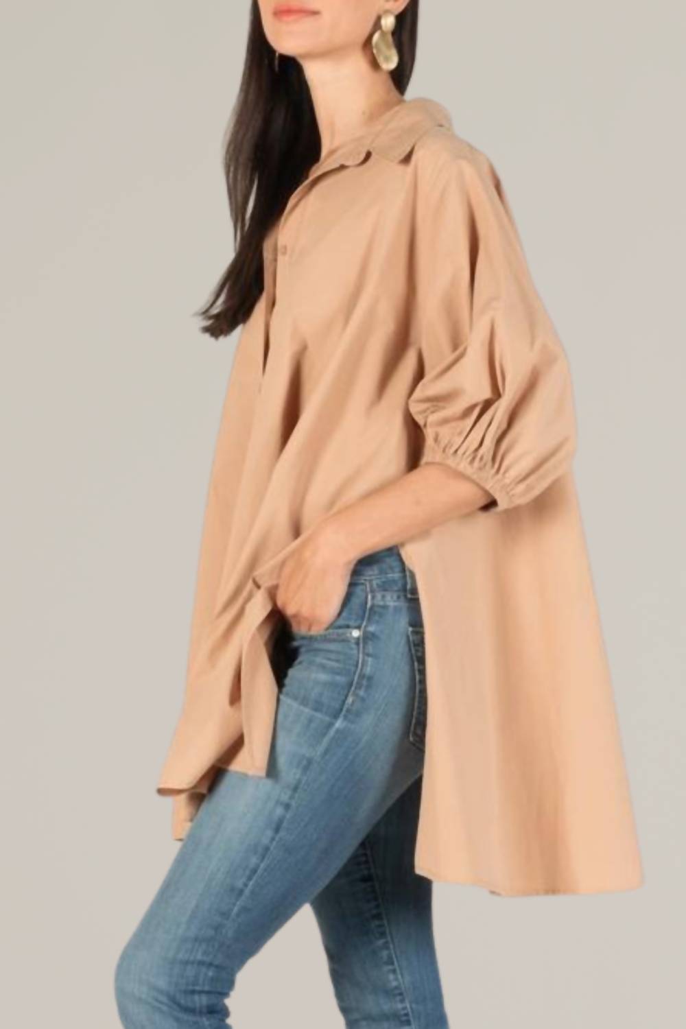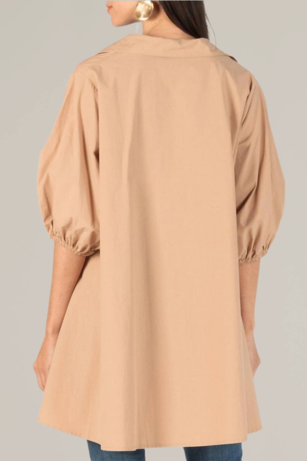 Embrace the versatility of this tunic-style blouse, expertly crafted for seamless layering or perfect to wear on its own. Its detailed design and comfortable fit make it a perfect addition to any closet. Introducing the Poplin Puff Sleeve Button Down Tunic by P.CILL, a timeless addition to any wardrobe with its classic taupe hue. This tunic offers chic elbow sleeves and a collared neckline, crafted from 100% cotton for optimum comfort. A button closure and side slits highlight its design, ideal for pairing with denim for versatile styling. Care is simple with hand wash instructions and line drying recommended to maintain its quality. Model is wearing a size small.
