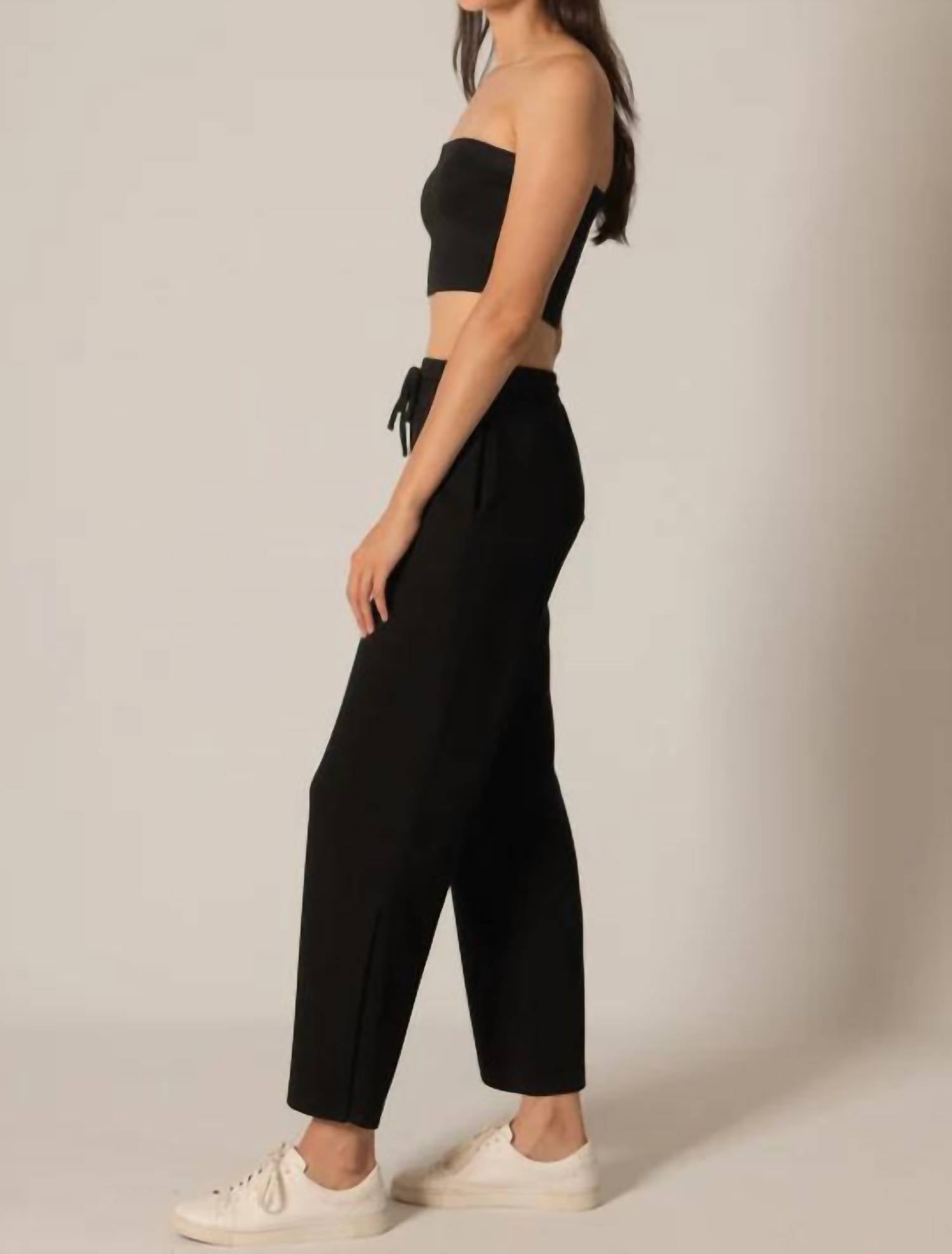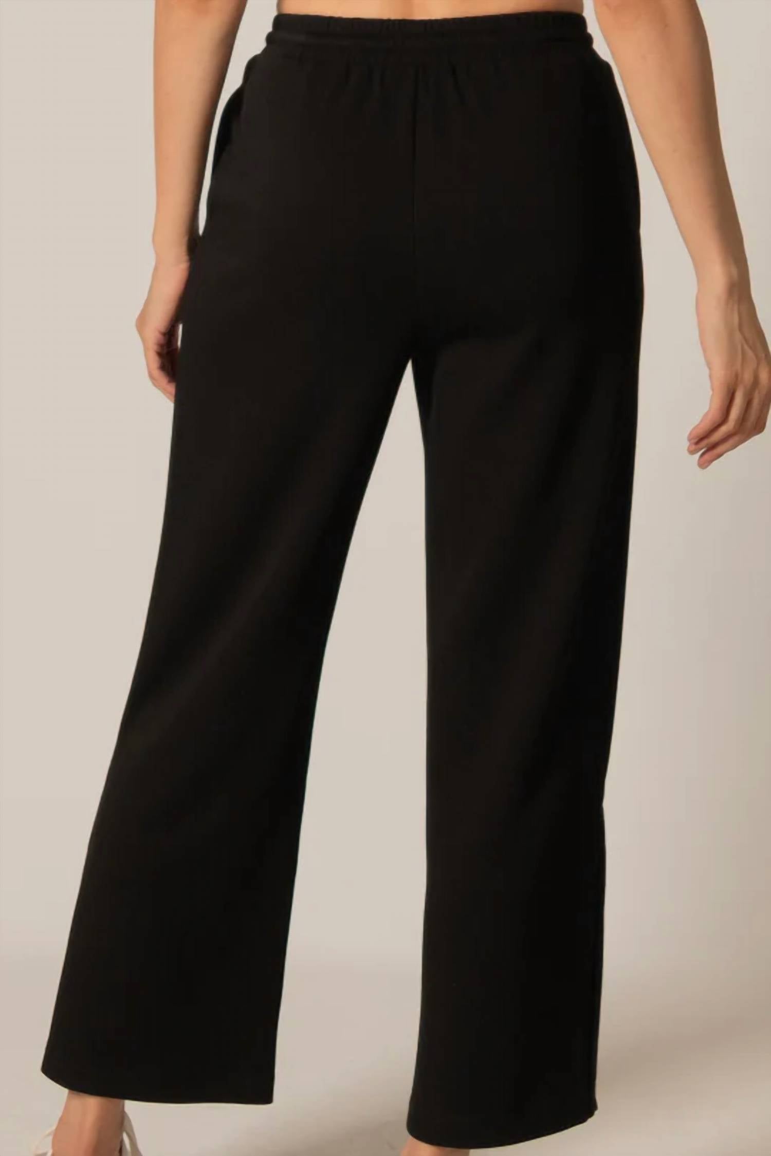 Crafted for modern women in a sophisticated black hue. Designed with a high-rise waist, these pants boast an elastic waistband with a self-tie for a personalized fit. Composition consists of 48% Modal, 48% Polyester, and 4% Spandex. Offering a soft yet structured feel. With an inseam of 27". Provide a relaxed fit, featuring wide legs and bottom slits. Pull on. Machine wash or hand wash gentle, cold or warm; hang dry.