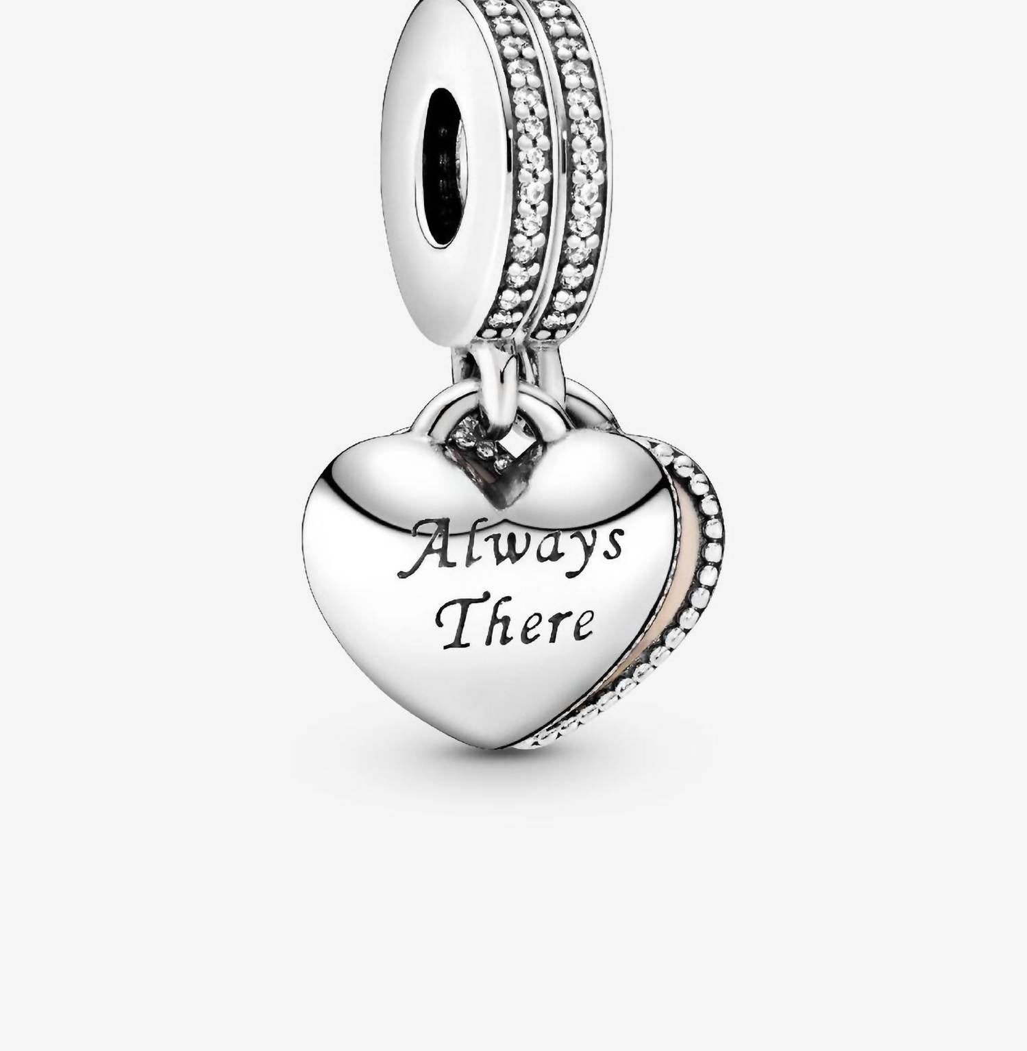 Stacked or solo - you can't go wrong with this bracelet. The Always There Heart Dangle Charm by Pandora is a heartfelt symbol of friendship, perfect for sharing with someone special. Crafted from sterling silver and adorned with cubic zirconia, this piece features a double dangle design with two hearts. One heart is inscribed with "Best Friends" on pink enamel, and the other says "Always There" on sterling silver, meant to be worn together or shared. It embodies a thoughtful gesture and a timeless keepsake.