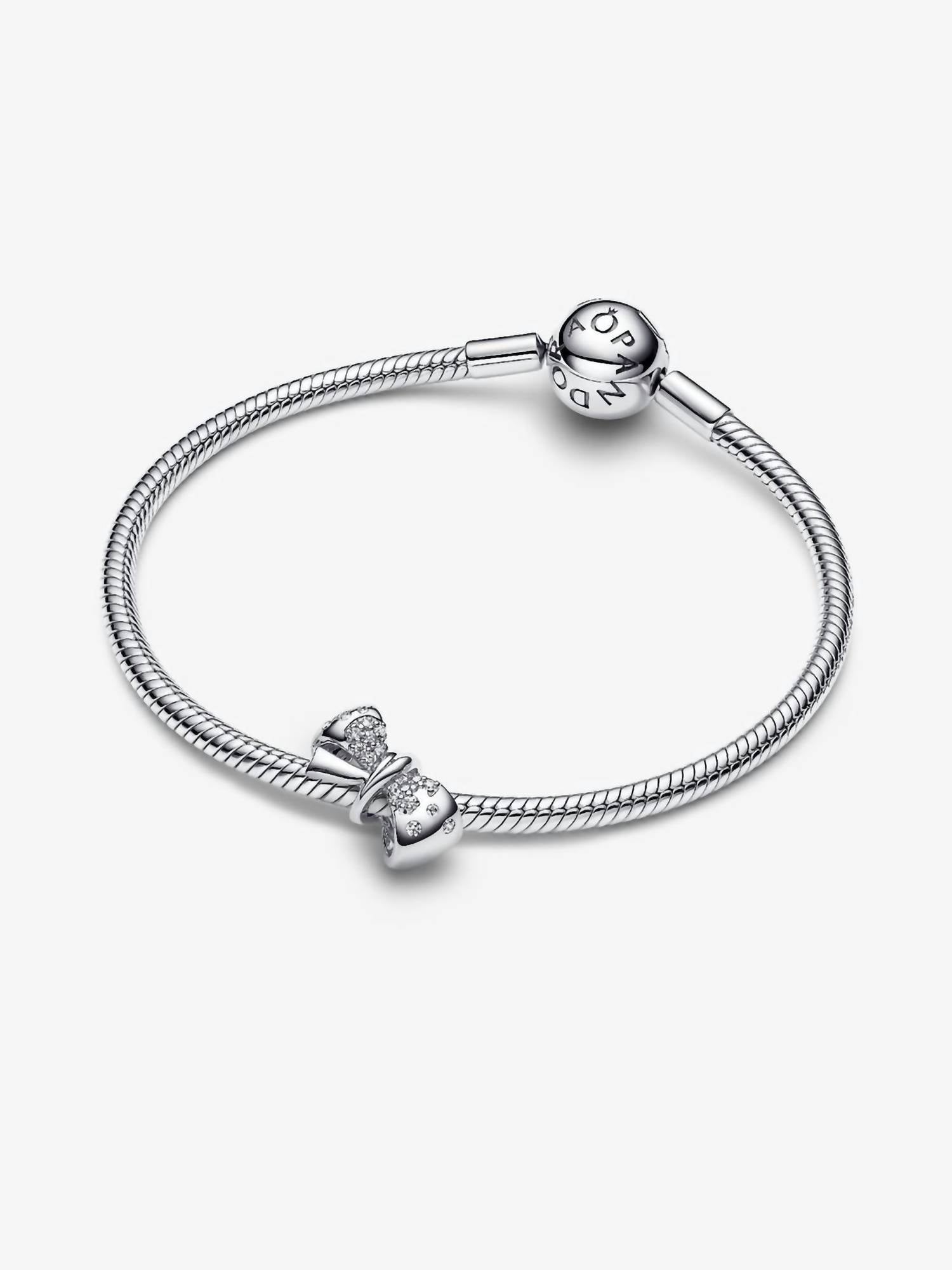Wrap up your look in our Sparkling Bow Charm. Brilliant stones and pavé shine against polished sterling silver, crafted into the shape of a classic bow. Perfect for pairing with both casual and formal outfits, this charm adds a touch of sparkle to any look. charm only