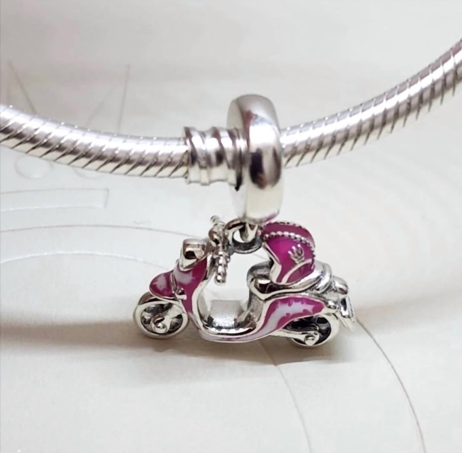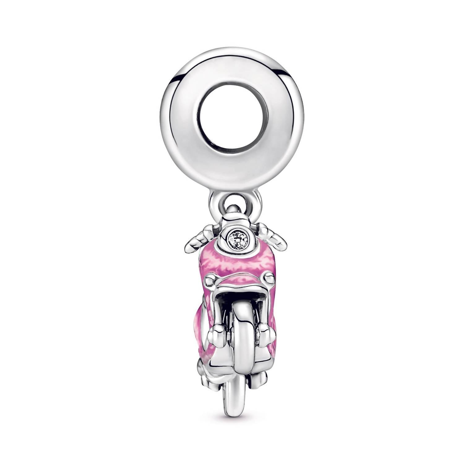 The Women's Scooter Dangle Charm by Pandora is an exquisite piece inspired by travels in Asia, crafted from sterling silver with vibrant hand-applied enamel. This charming pendant boasts delightful details like spinning wheels and intricate fire patterns, adding a touch of whimsy to your collection. The piece also features a helmet with microbeading and the signature Pandora Crown O monogram. Perfect for enhancing your personal style, this retired treasure makes a unique addition to any jewelry ensemble.