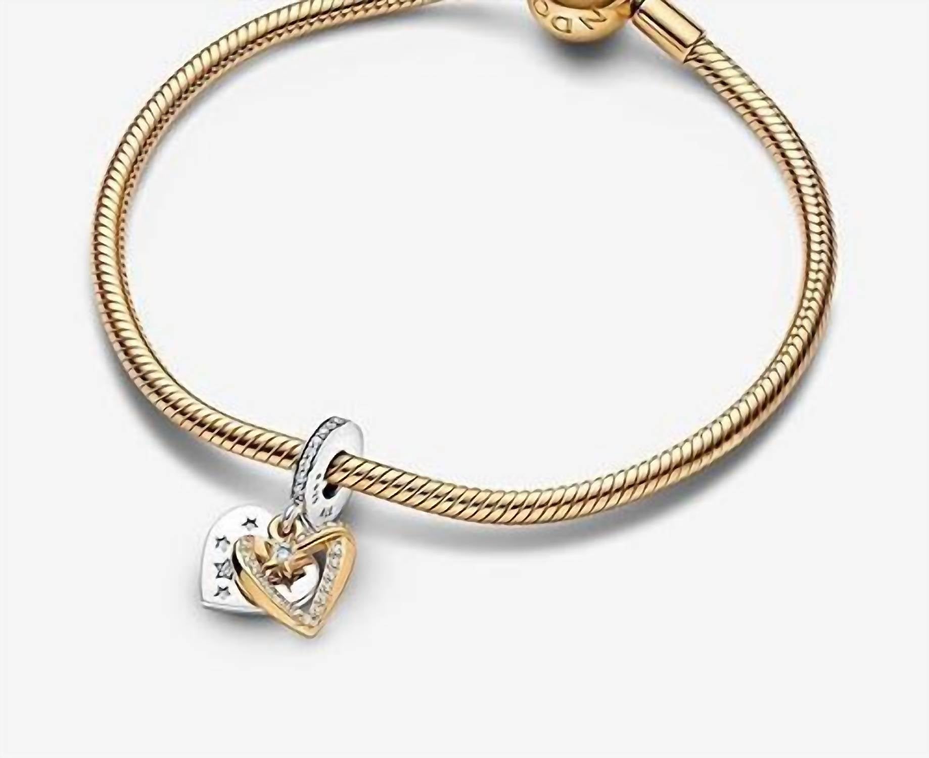 This stand-out bracelet is good enough to wear on its own, or stacked with your favorites. Experience the timeless elegance of the Women's Shooting Hearts Dangle Charm by Pandora, a two-tone symbol of romance in luxurious 14k yellow gold. Designed to add celestial allure, the charm features a gold-plated heart adorned with twinkling stars and a sterling silver heart engraved with "You are my galaxy." This piece is inspired by the legend of Zhinü and her lover, celebrating an eternal bond with charming grace. Although made for bracelets, its versatile design ensures it can complement any jewelry collection.