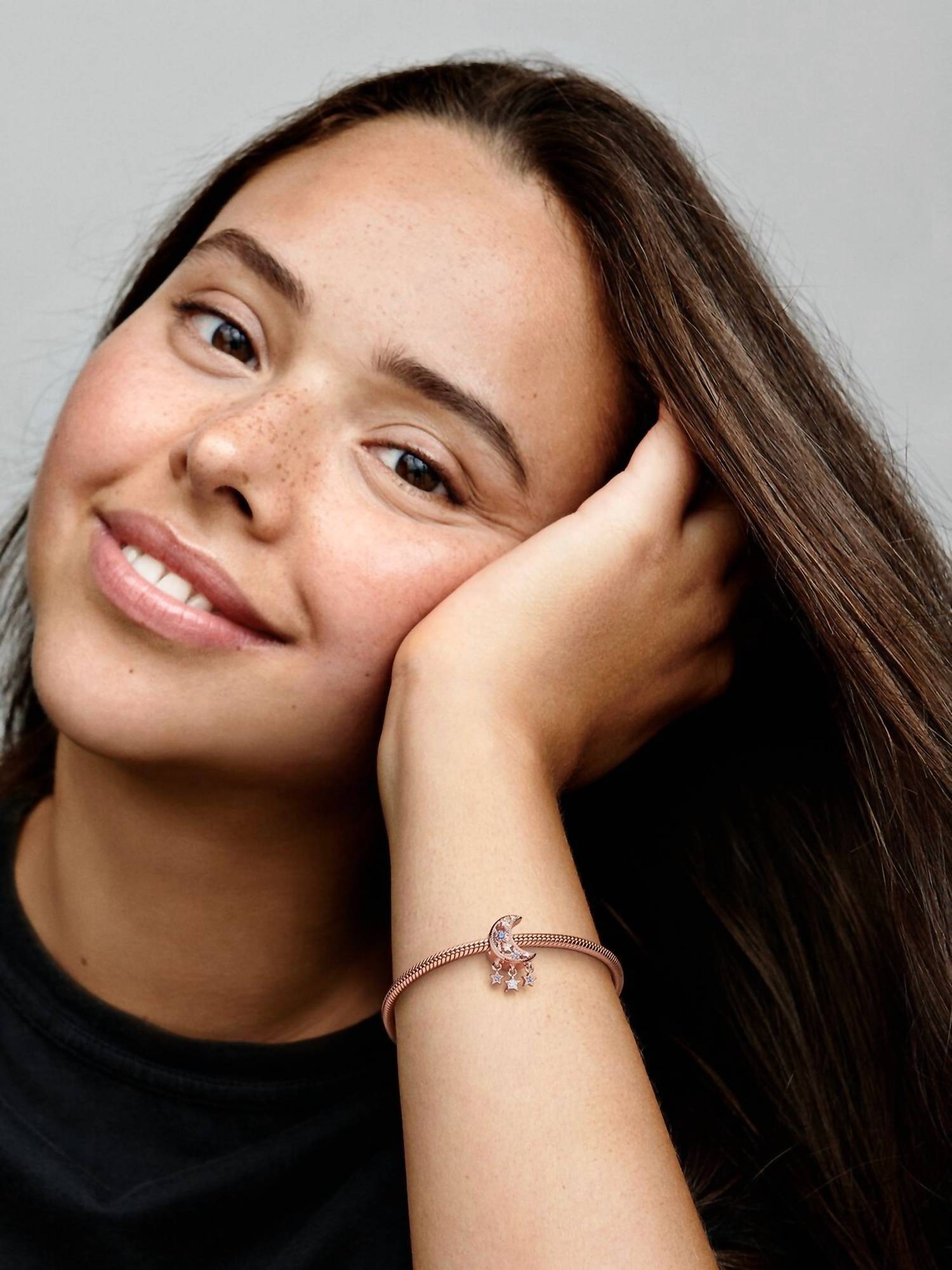 Stacked or solo - you can't go wrong with this bracelet. The Women's Star & Crescent Moon Charm by Pandora brings celestial elegance to your look with its dazzling design. Crafted from 14k rose gold, this fashion charm is adorned with rows of cubic zirconia and cut-out star and circle shapes, enhanced by microbead detailing on the edges. Asymmetric stars with stone accents and microbeads dangle gracefully from the sides, adding a whimsical touch. Embrace the inspiring engraving “Dream big” as a daily reminder to reach for the stars.