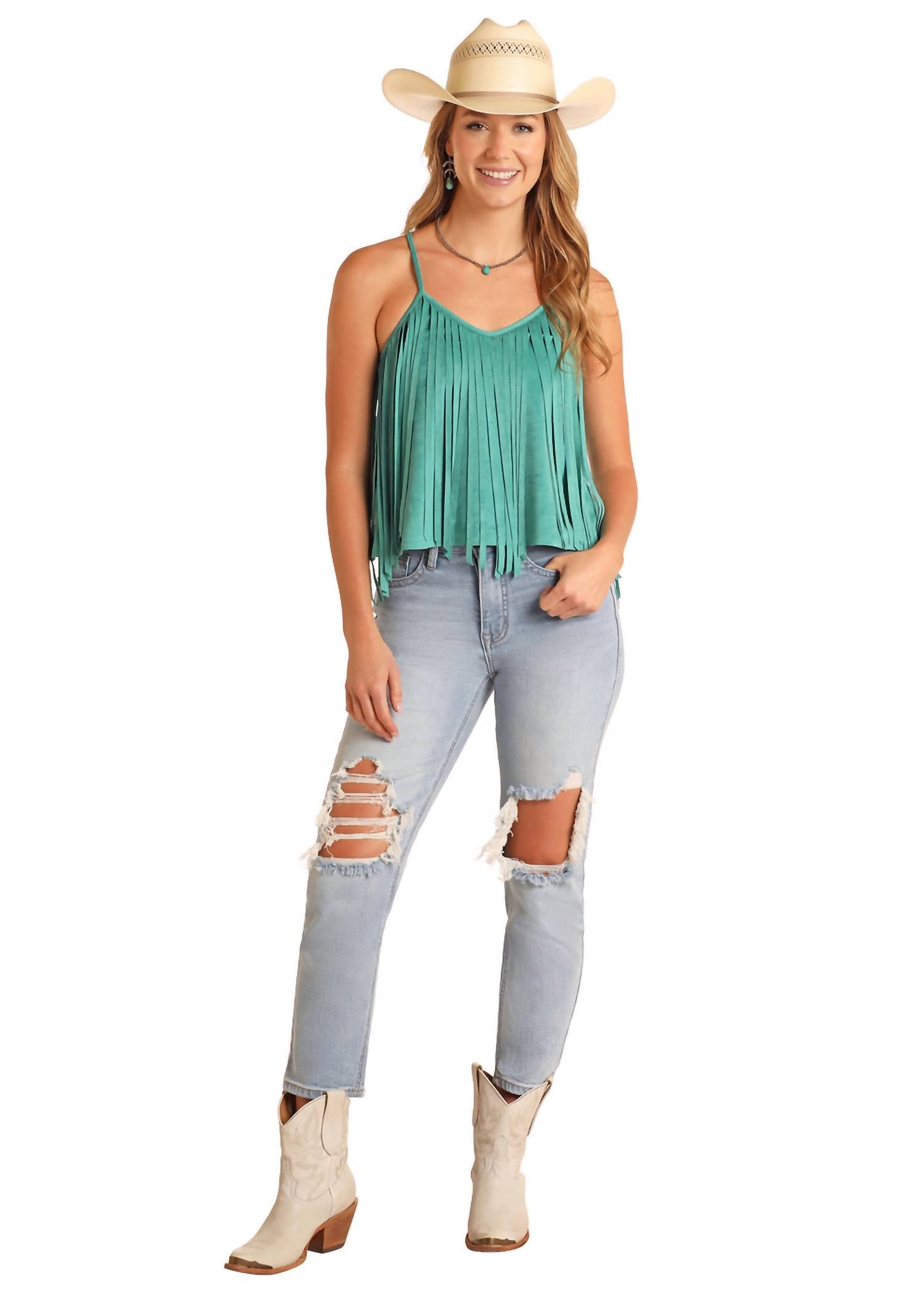 Fit, fabric and functionality. This tank top checks all the boxes. Unleash your inner cowgirl with the Panhandle Microsuede Fringe Tank Top in a striking teal hue. This sleeveless, V-neck tank is crafted from a soft blend of 92% Polyester and 2% Spandex, featuring playful front fringe details for a Western-inspired flair. Designed for pull-on ease, it's a standout piece for any summer occasion, particularly birthdays. To maintain its vibrant style, dry clean only.