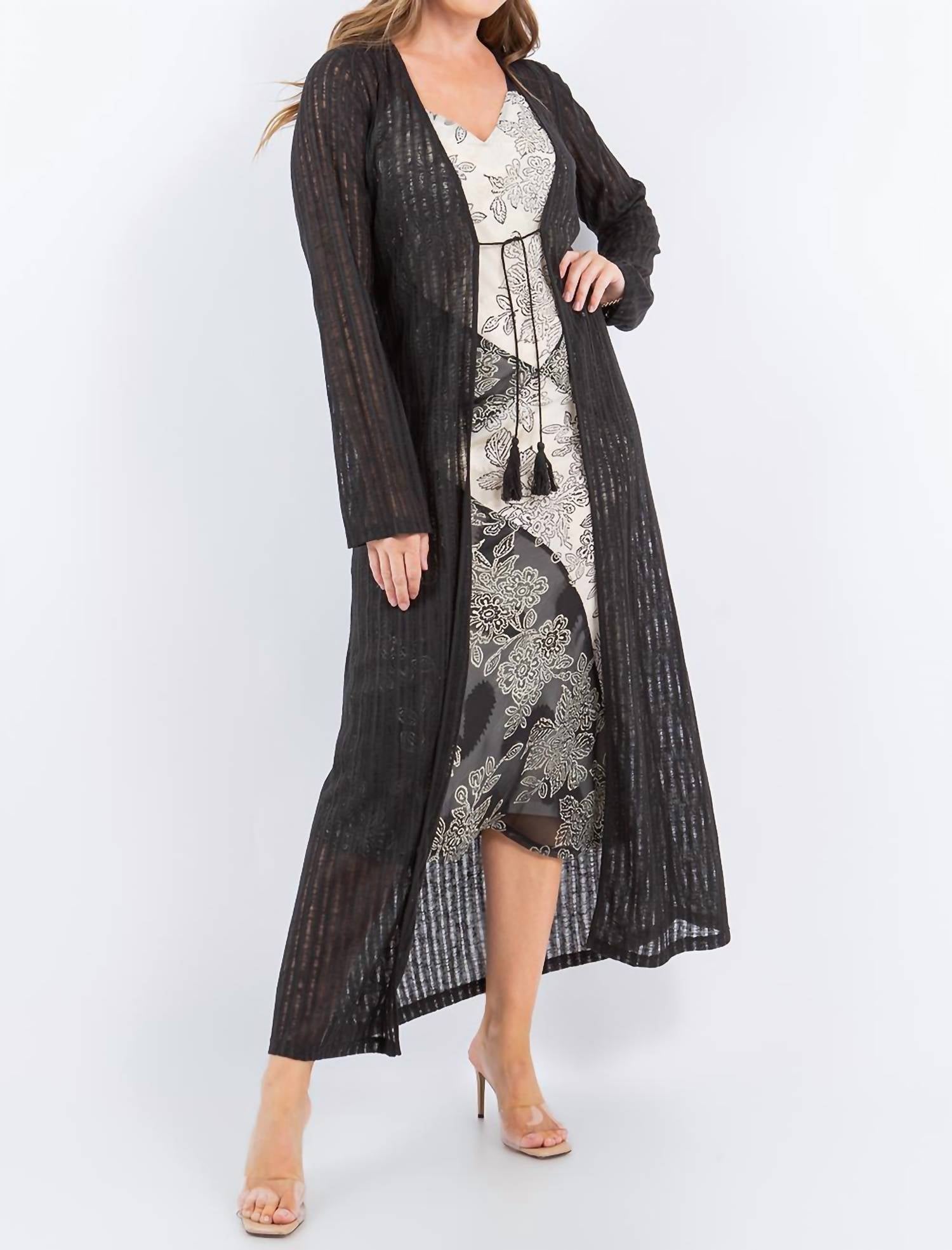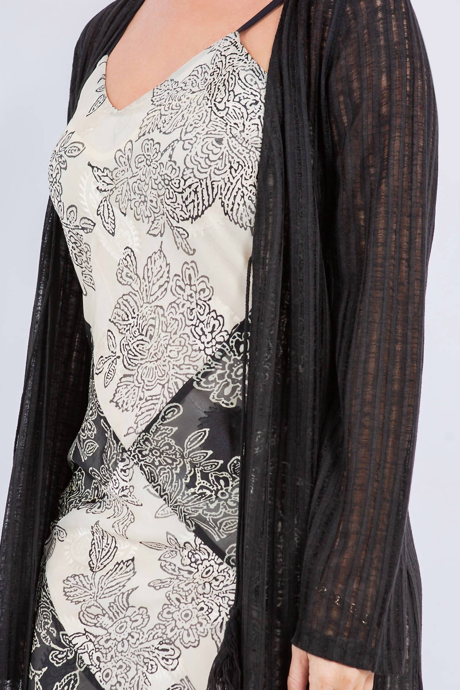 Elevate your wardrobe with the Needle Out Knit Tie Front Maxi Duster by PAPARAZZI, a contemporary piece in sleek black. This long sleeve cardigan features a tassel trim tie front and a straight hem, offering a chic silhouette. Made from 100% Polyester, it is designed to be true to size. Care: Hand wash cold, do not bleach, lay flat to dry, ensuring it retains its elegant shape.