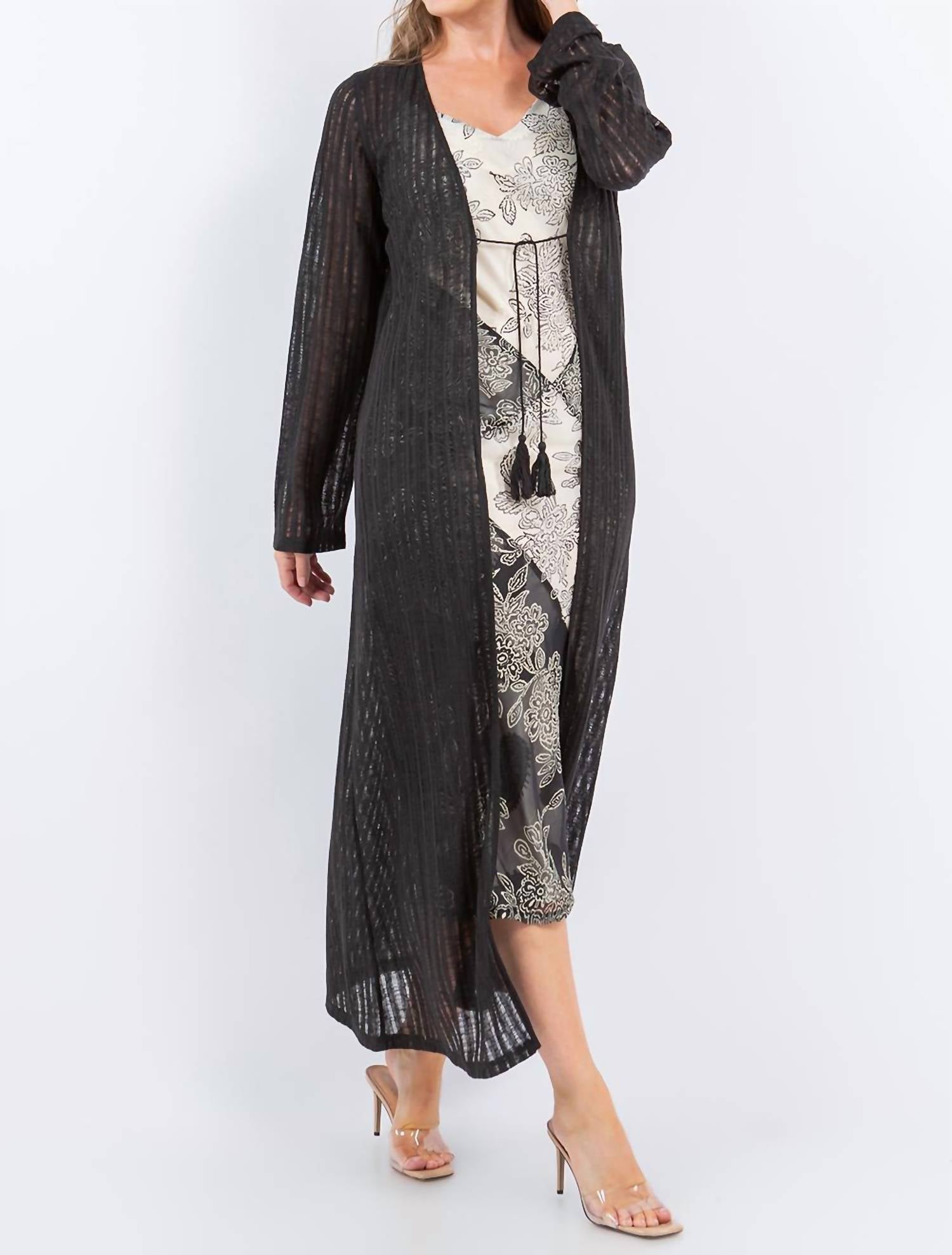 This cardigan will be a sweater-rotation favorite. Elevate your wardrobe with the Needle Out Knit Tie Front Maxi Duster by PAPARAZZI, a contemporary piece in sleek black. This long sleeve cardigan features a tassel trim tie front and a straight hem, offering a chic silhouette. Made from 100% Polyester, it is designed to be true to size. Care: Hand wash cold, do not bleach, lay flat to dry, ensuring it retains its elegant shape.