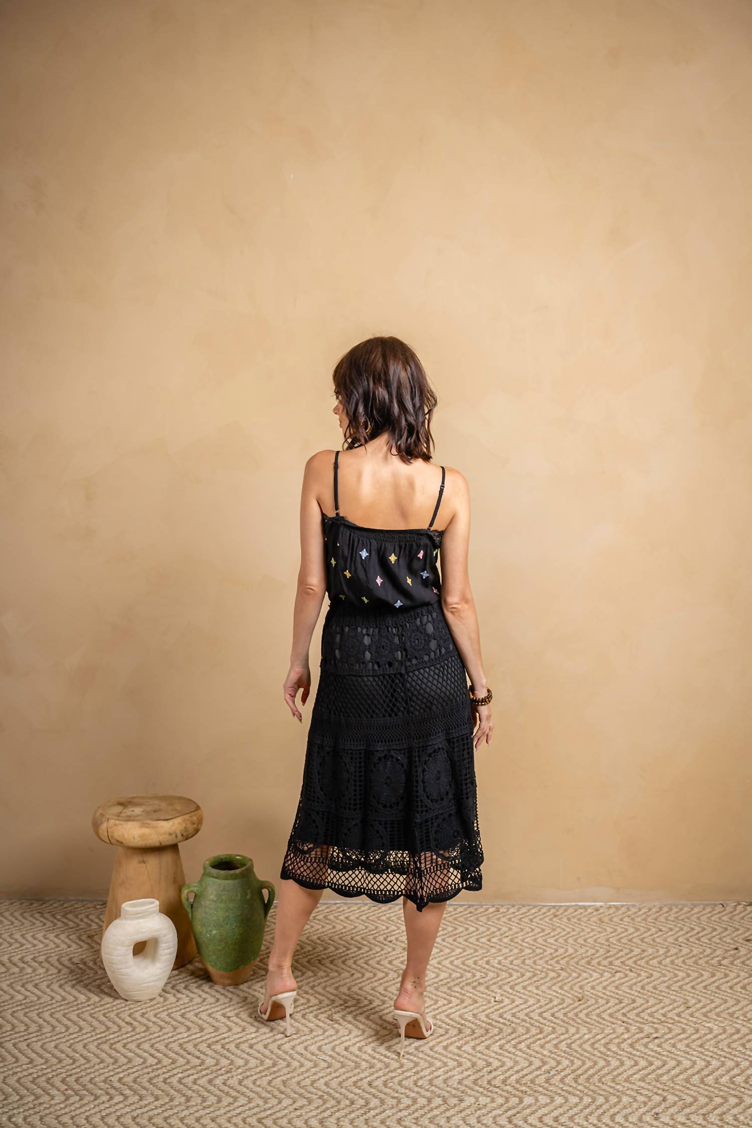 This classic tank top is perfect for layering and cute enough to wear on its own. Introducing the Viscose Woven Embroidered Tank Top by PAPARAZZI, a chic addition to your summer wardrobe. This elegant top in classic black features adjustable spaghetti straps and a v-neck adorned with lace trim, while floral embroidery enhances its charm. Crafted from viscose with an elastic back trim, it offers comfort and style in equal measure. Button front. Machine wash and tumble dry. 100%Viscose.