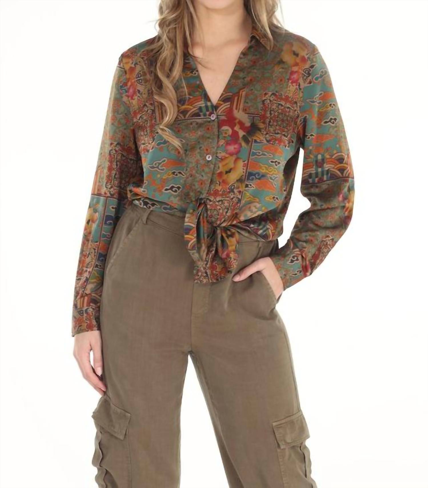 Introducing the Women's Blouse by Paparazzi, a stunning addition to your summer wardrobe with its chic patchwork design and boho vibes. This textured blouse features long sleeves and a flattering V-neckline, perfect for vacation outings. Closure: Button closure. Origin details and care instructions are not provided.