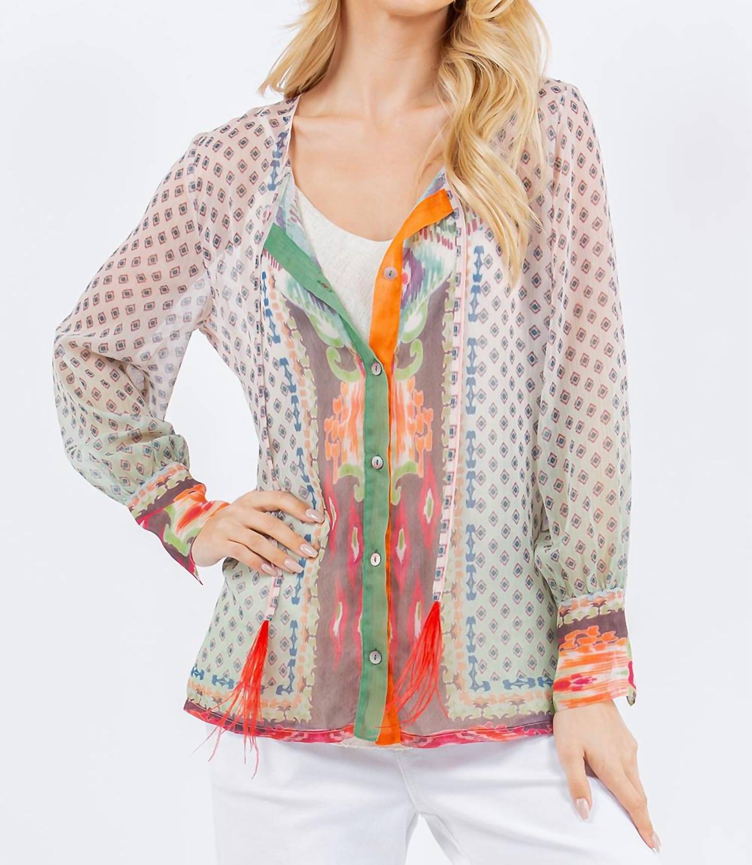 The perfect long sleeve tee that goes with just about anything. Georgette sheer woven ikat print blouse, full button front with feather trim tassels, long sleeve with button cuff, straight hem with side slits. Unlined