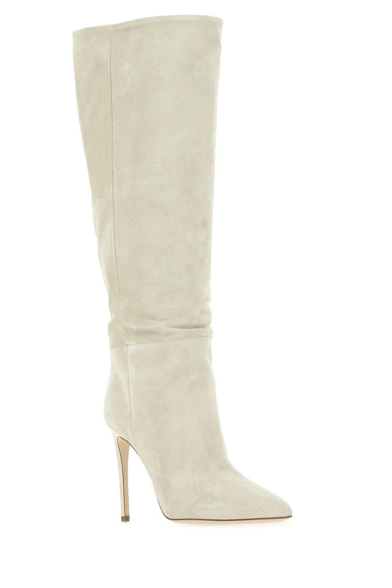 Step into style with the Women's Pointed Toe Knee-high Boots by Paris Texas in a chic Angora hue. These boots are crafted from luxurious suede and feature a striking 4.13-inch croc-embossed leather stiletto heel that effortlessly adds bold flair to your ensemble. Made in Italy, they balance the label's fashion-forward sensibilities perfectly. Ideal for pairing with mid-length hemlines, these boots are a must-have for elevating your wardrobe.