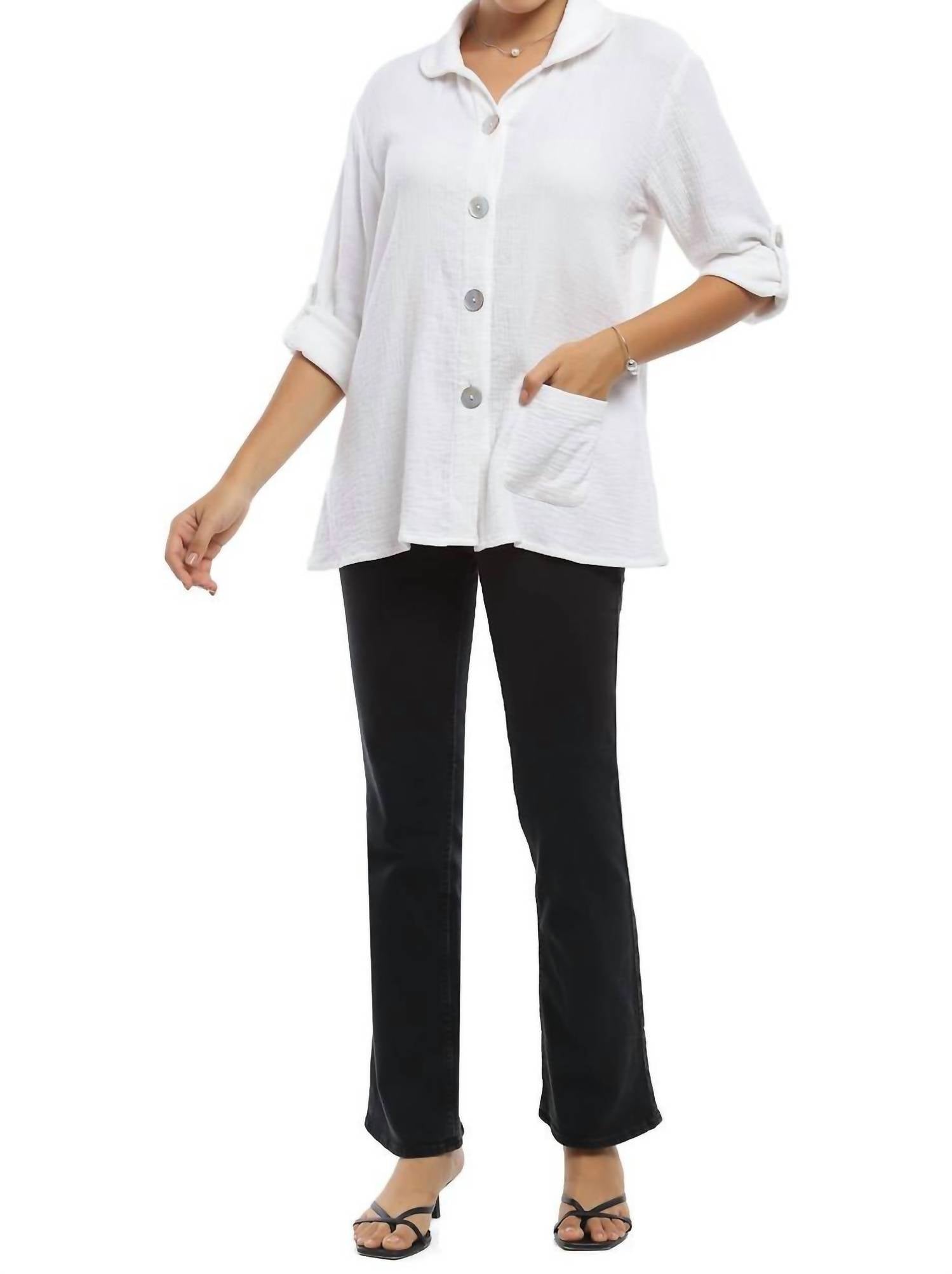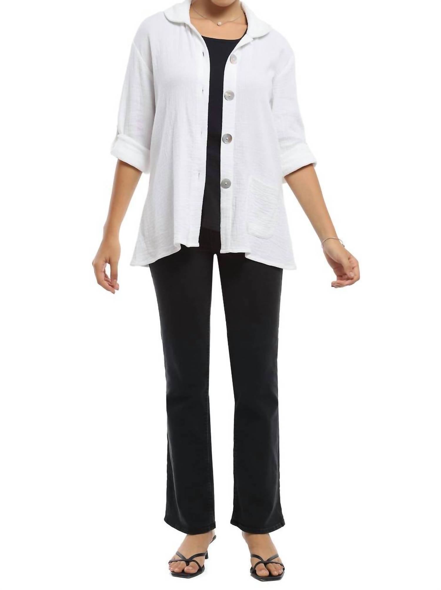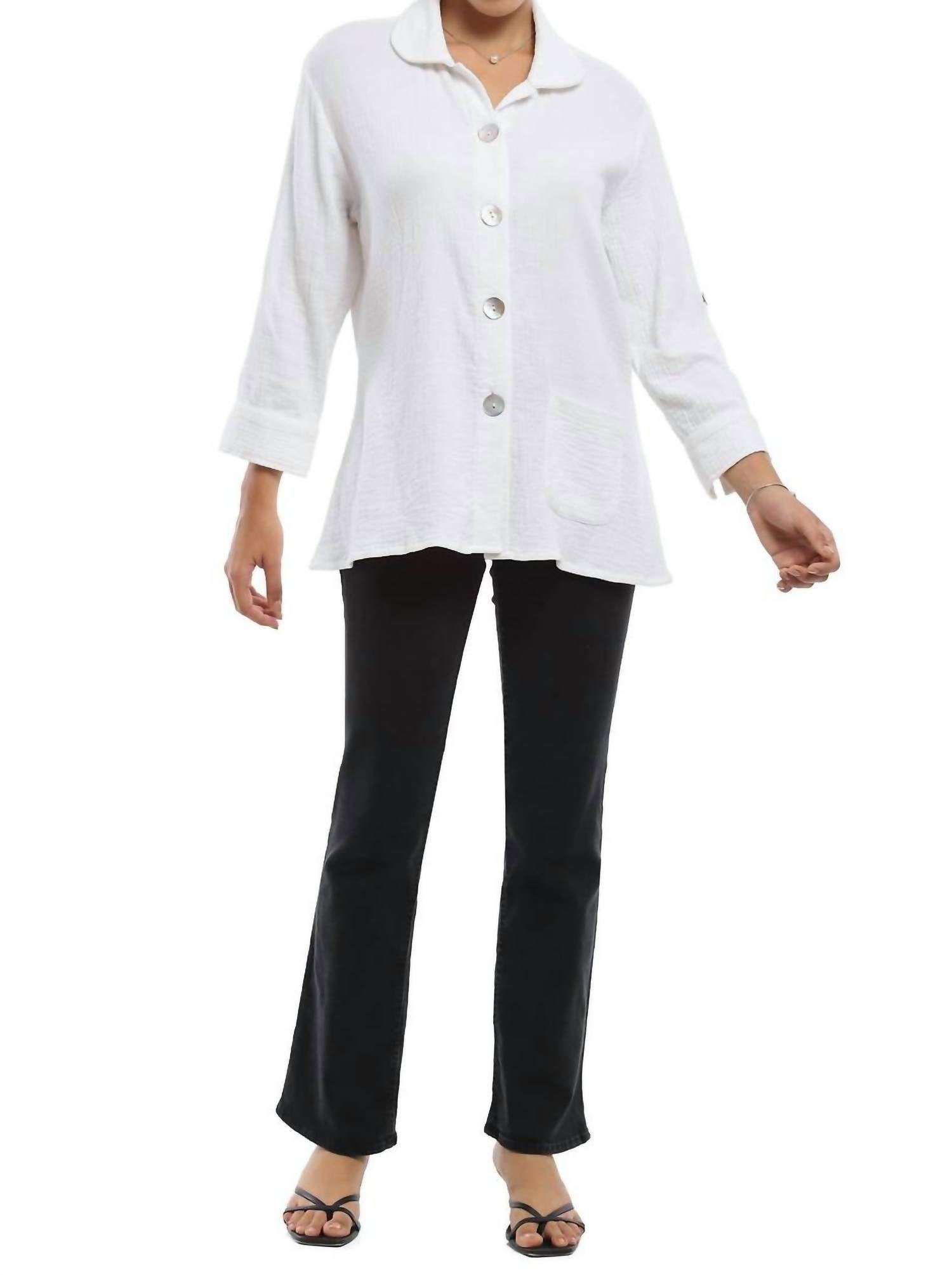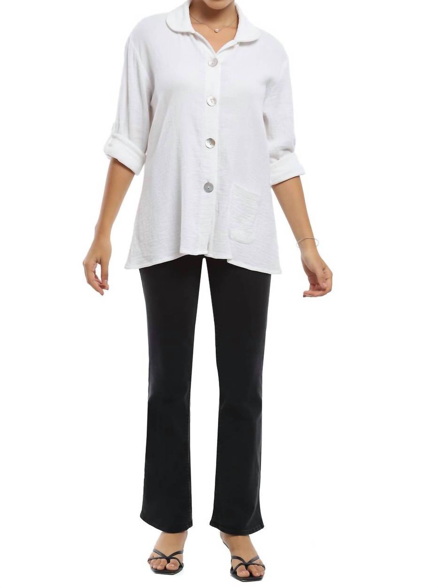 A casual yet cool jacket that every closset needs. Embrace minimalist style with the Shawn Jacket by Parsley & Sage, crafted entirely from soft, textured cotton. This casual, white jacket is perfect for spring travels, offering functionality with pockets and a classic collar. It features a long sleeve design with a practical button closure. Care instructions include machine washing and tumble drying.