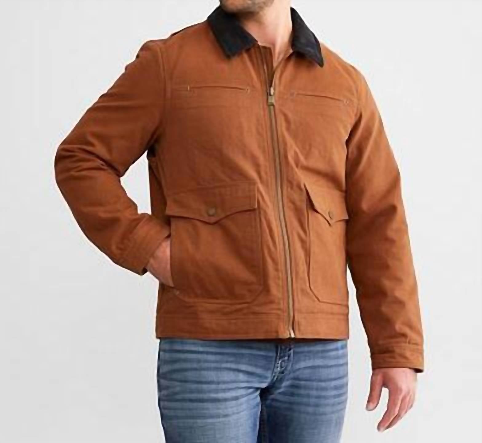 Introducing the Carson City Canvas Ranch Coat by PENDLETON, perfect for your travel and workwear needs this fall. This men's coat in a rich Whiskey color features long sleeves and is crafted from sturdy 12-oz. Big Sky Canvas. Comfortably lined with a wool blend plaid upper, cotton lower, and polyester-lined sleeves, this coat offers a corduroy collar and versatile zip closure. Enjoy ample functionality with multiple pockets, and maintain its rugged appeal with easy machine wash and tumble dry care.