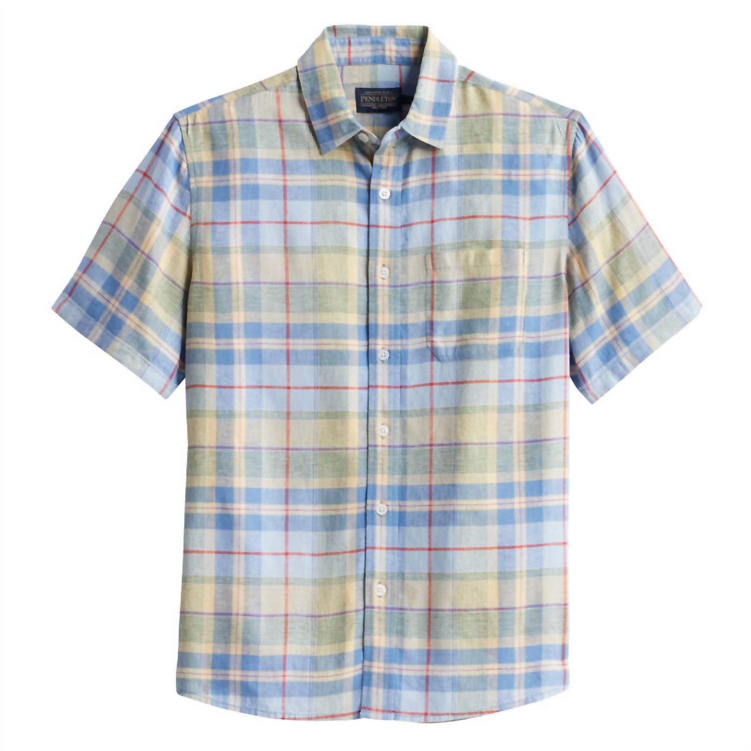 Achieve effortless style with the Pendleton Dawson Plaid Linen Shirt, designed for casual menswear in a refreshing blue multi plaid. This short-sleeve shirt combines a breathable 55% linen and 45% rayon blend with a button closure for an airy, comfortable fit. Featuring a spread collar and a functional chest pocket, this shirt showcases a slightly rounded shirttail hem, perfect for summer outings. Originating from imported materials, it offers convenience with machine wash and tumble dry care instructions.