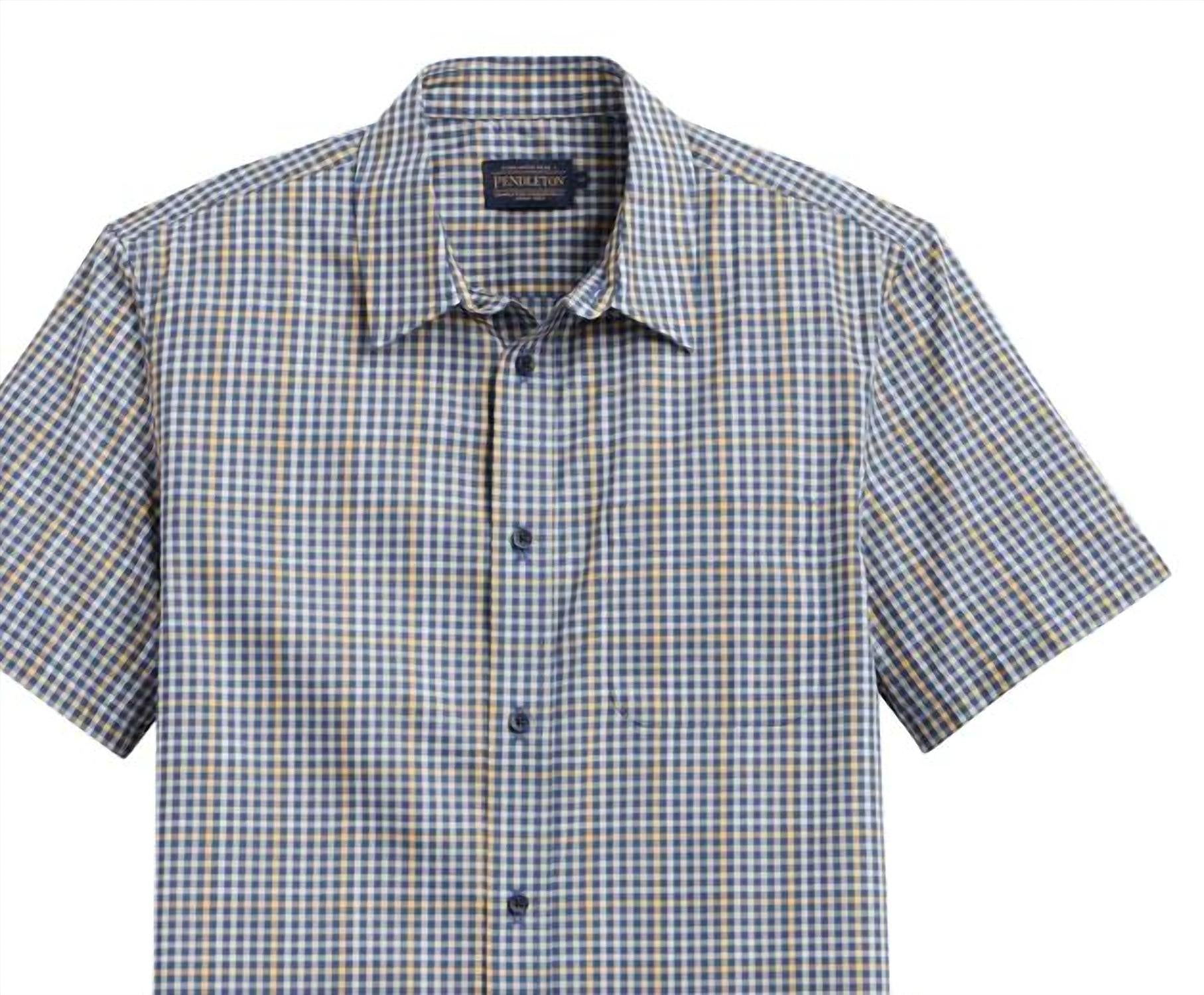 Elevate your casual wardrobe with the Men's Academy Short Sleeve Shirt by Pendleton, a stylish choice in navy and natural plaid. Crafted from 100% Pima Cotton, this shirt offers both comfort and a sleek look. Featuring a classic collar and convenient button closure, it's ideal for everyday wear. Imported for quality, this plaid & check design is the perfect blend of form and function.