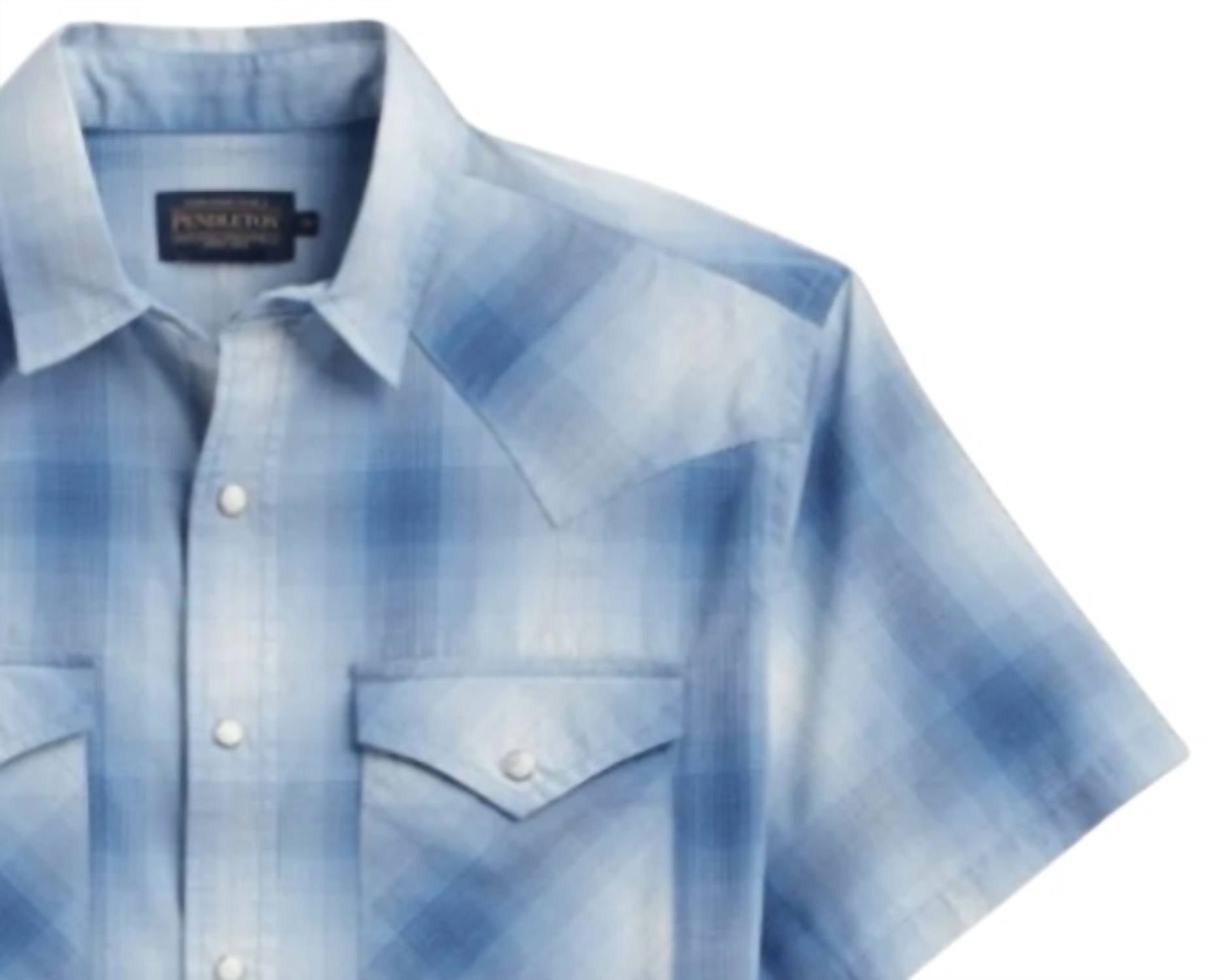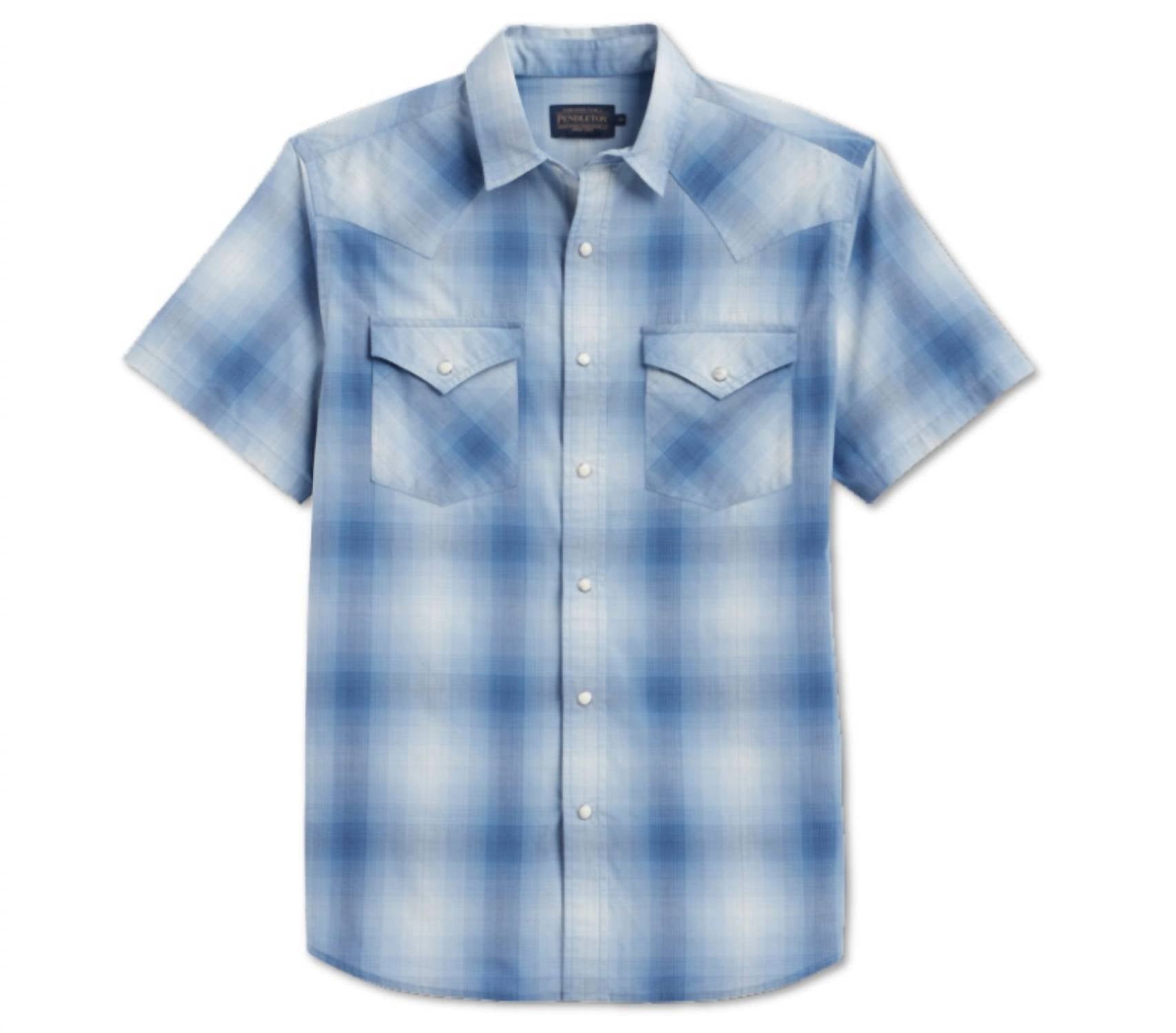 The Frontier Short Sleeve Snap Shirt by Pendleton is an effortlessly stylish addition to any wardrobe, crafted in a versatile Blue Hombre hue. Made from a breathable cotton blend of 60% cotton and 40% polyester, this shirt features a classic plaid and check pattern with short sleeves and a western-style with peaked, bias-cut yokes and flapped pockets. The snap closure offers easy wear and adds a rugged touch, making it perfect for summer parties and casual outings. It’s conveniently machine washable and can be tumble dried, embodying both tradition and ease in care.
