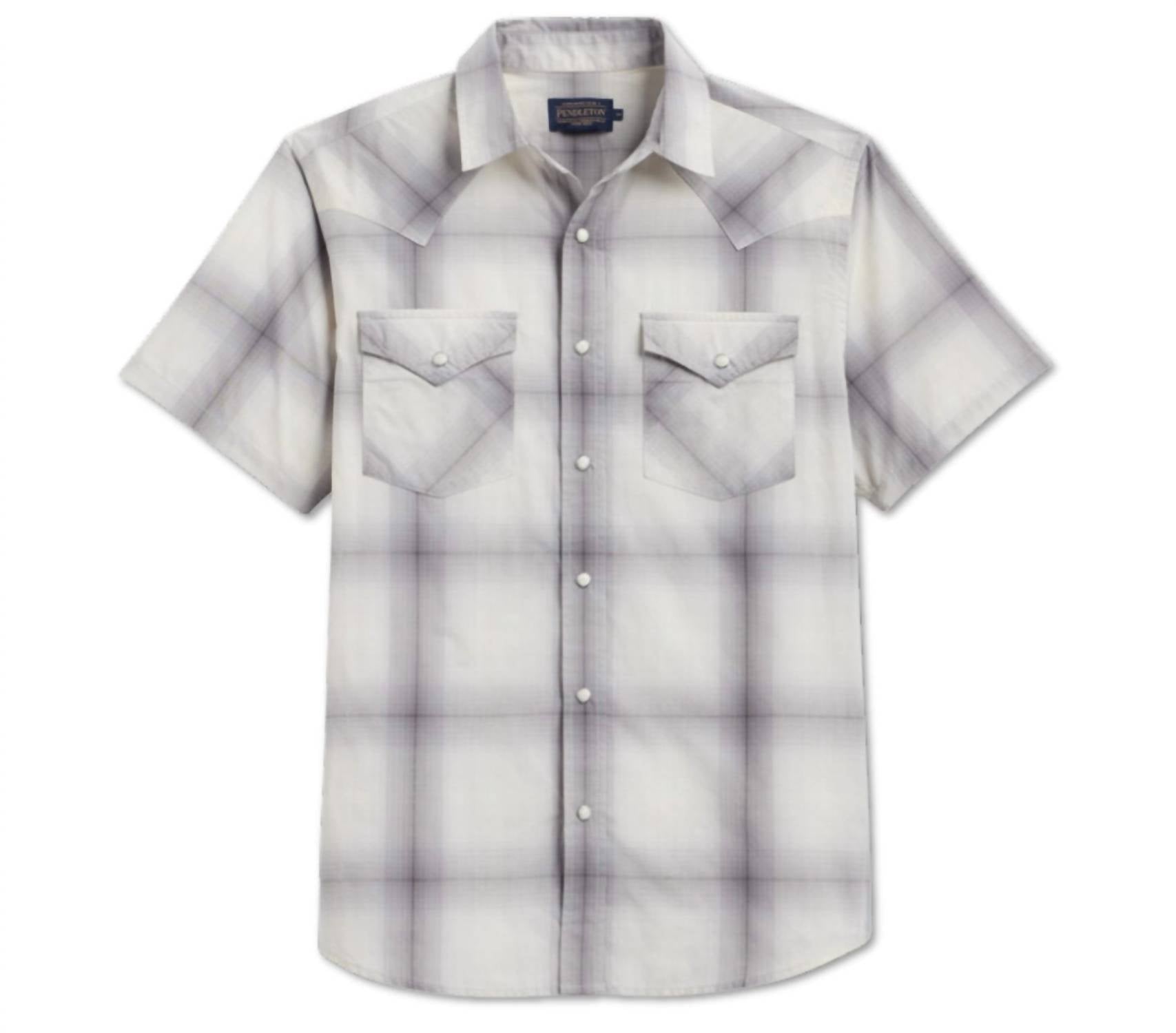 The Men's Frontier Short Sleeve Snap Shirt by Pendleton is a quintessential piece for any casual wardrobe. Crafted from a breathable cotton blend, this grey ombre shirt features a western-style snap-front for easy closure and a classic collar. Its plaid and check pattern enhances its workwear-inspired style, making it ideal for summer outings such as a 4th of July holiday party. Care instructions recommend hand washing and laying flat to dry, ensuring lasting quality and comfort.