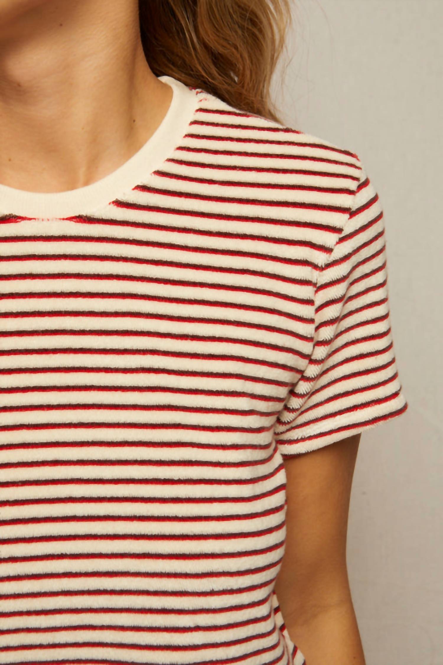 Embrace the ultimate comfort with the Bree Loop Terry Stripe Crew Neck by perfectwhitetee, crafted for effortless style. This women's short sleeve tee, in vibrant poppy and chocolate stripes, combines a regular fit with a natural waistline for a vintage-cool vibe. Its sustainable fabric is composed of 97% Recycled Cotton and 3% Spandex, offering a stretch for that dreamlike feel. Care is simple with a pull-on closure; just hand wash cold to keep it looking fresh. Measurement from size small includes a chest of 18 inches and a length of 19 inches.