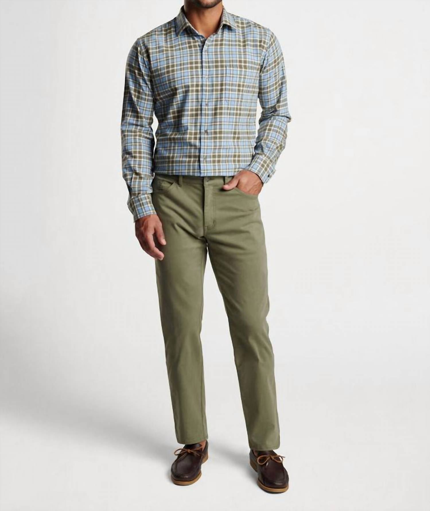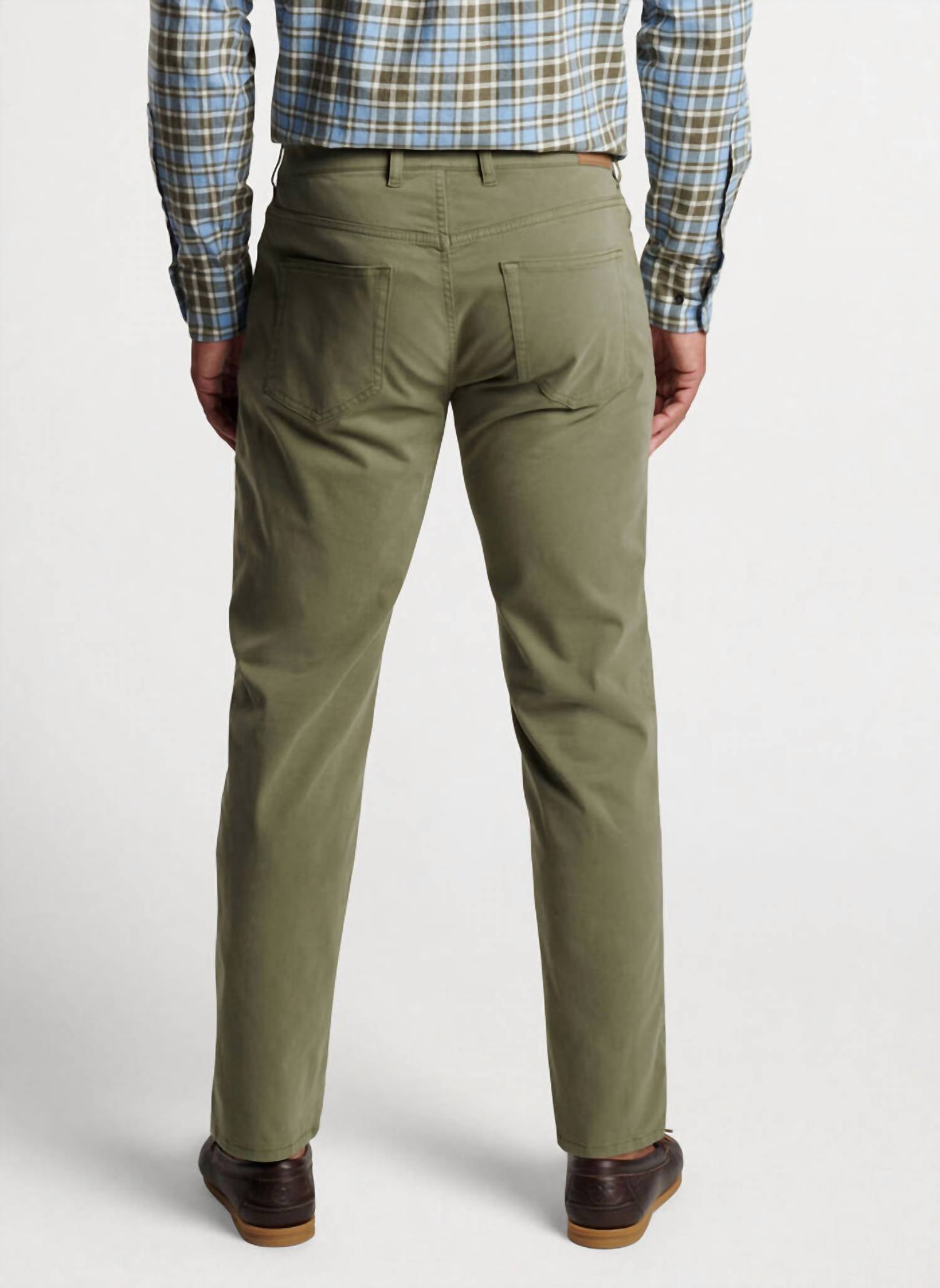 Introducing the Signature Sateen Five-pocket Pant by PETER MILLAR, crafted for style and durability in a military hue. These men's chinos feature a luxe cotton blend, consisting of 79% cotton, 13% tencel, 5% polyester, and 3% spandex, providing a comfortable fit. Designed with a classic fit and convenient zip closure, these imported pants combine practicality and sophistication. Care is easy with machine wash cold instructions and the option to lay flat to dry or dry clean.