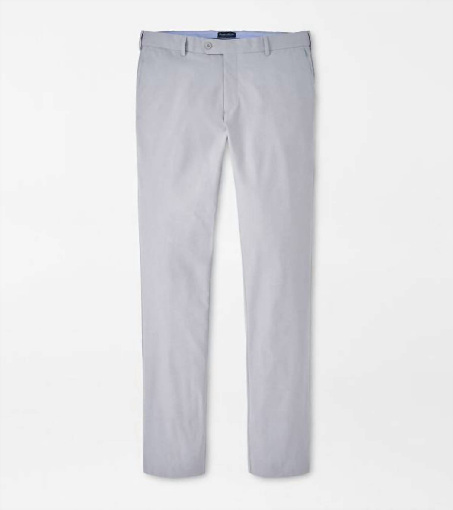 The Surge Performance Trouser is a men's 100% polyester pant with a tailored fit, a 10-inch rise, and 34-inch length. It features water resistance, four-way stretch, and moisture-wicking properties. The design includes belt loops, quarter-top pockets, a zip fly with a button closure, and a matte finish that resists wrinkles. It is machine washable in cold water, tumble dry low, and should not be ironed or dry cleaned. The model is 6'2" and wears size 32. (Style #: ME0XB00FB)