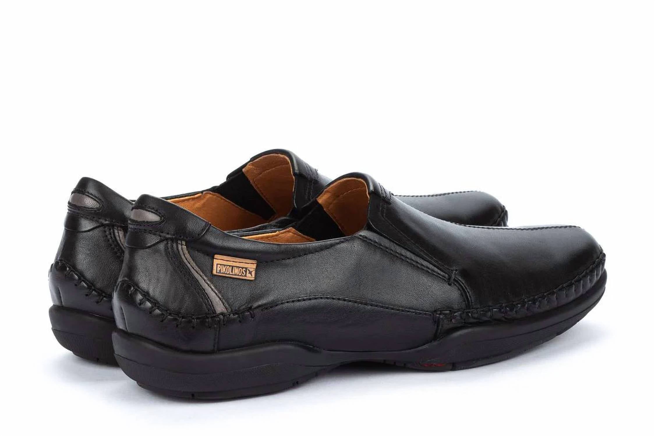 Discover the Men's San Telmo Slip-on Shoes by PIKOLINOS, crafted for ultimate comfort and style in black leather. These shoes feature hand-stitched seams for flexibility and an elastic closure for an easy fit. The upper is made from 100% cowhide, complemented by an inner lining of 75% pigskin and 25% textile. With a heel height of 0.98 cm and a durable 2 cm synthetic sole, these loafers are designed for non-stop walking and workwear fashion. The padded, removable insole adds to the extra comfort, ensuring support throughout the day.