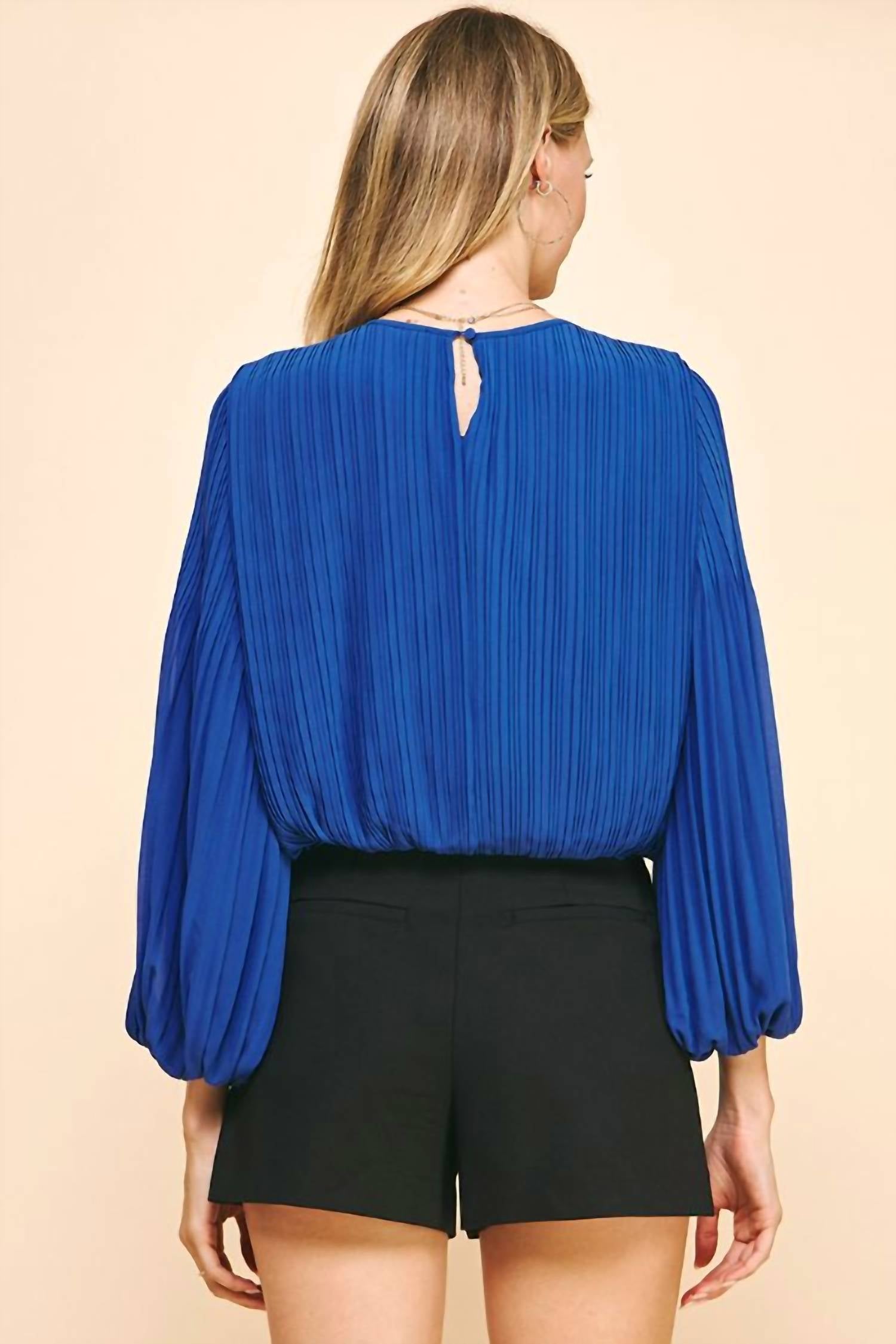 Embrace sophisticated style with the Karson Pleated Top by PINCH, crafted for the fashionable woman. This royal blue blouse boasts elegant long bishop sleeves and a round neckline, offering a chic silhouette that falls just above the waistline. Made entirely from 100% Polyester, it features a keyhole back with an elastic hemline, ideal for pairing with high-waisted pants. Button closure. Machine wash for easy maintenance.