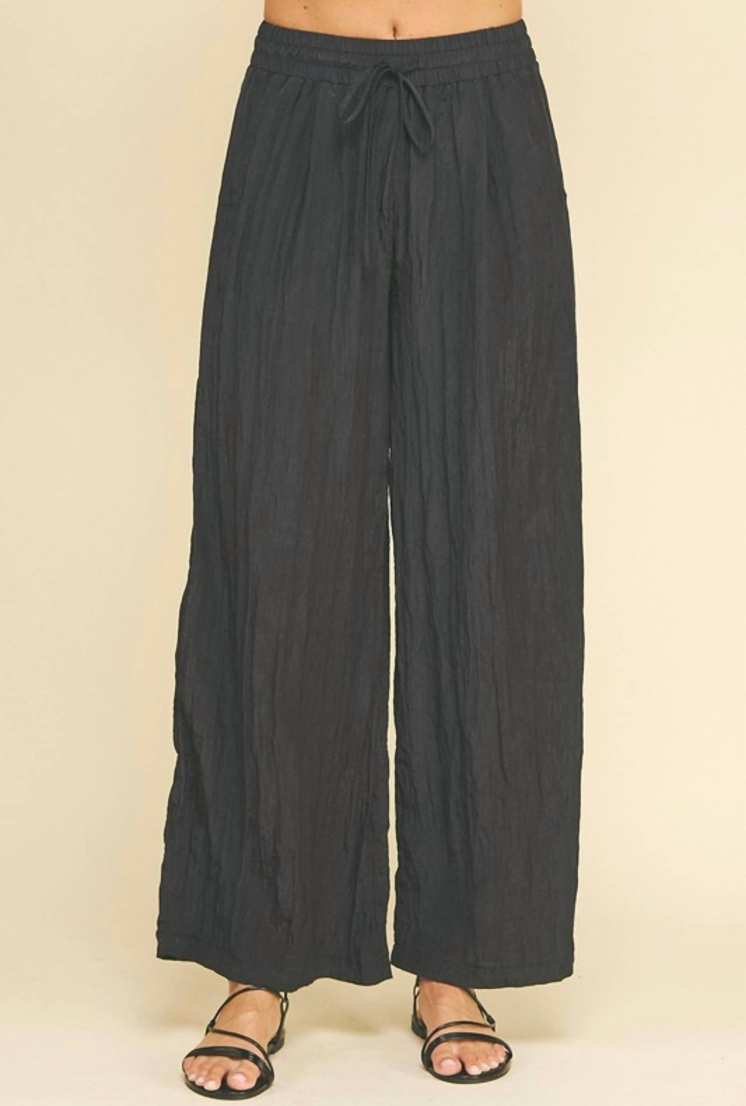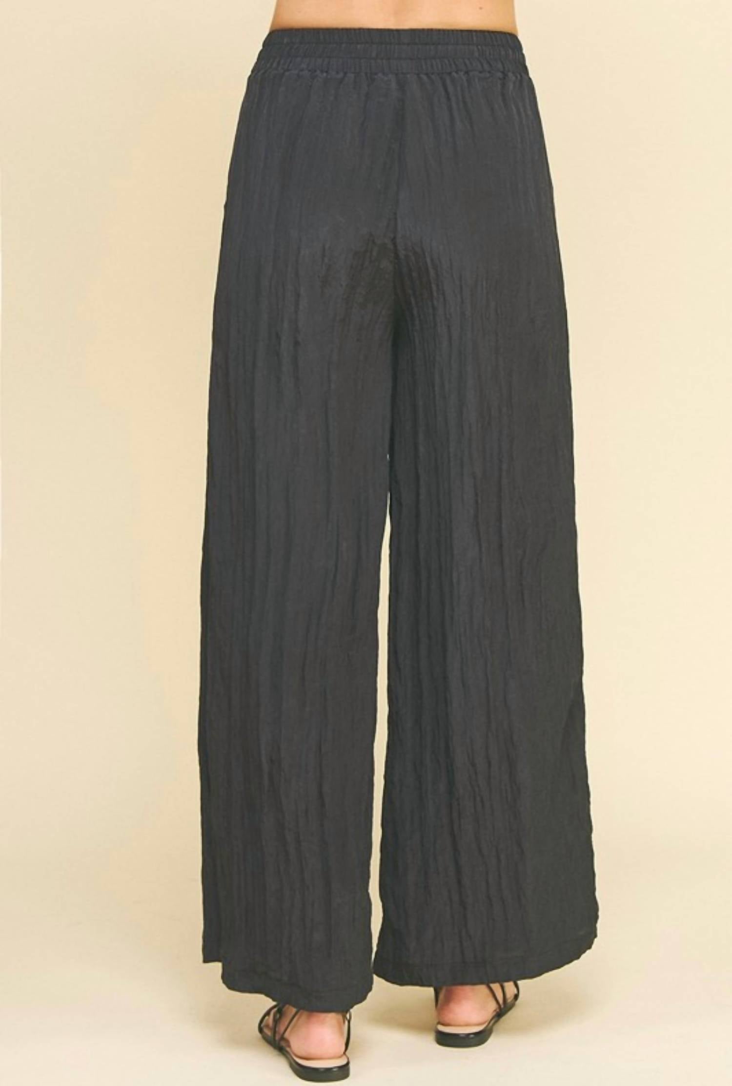 Stylish choice in a deep ink hue. Feature a relaxed fit with a high-rise waist and wide leg style, finished with a pull-on closure for ease. Lightweight fabric boasts a playful texture and practical pockets, making them perfect for travel and year-round style. Hand wash.