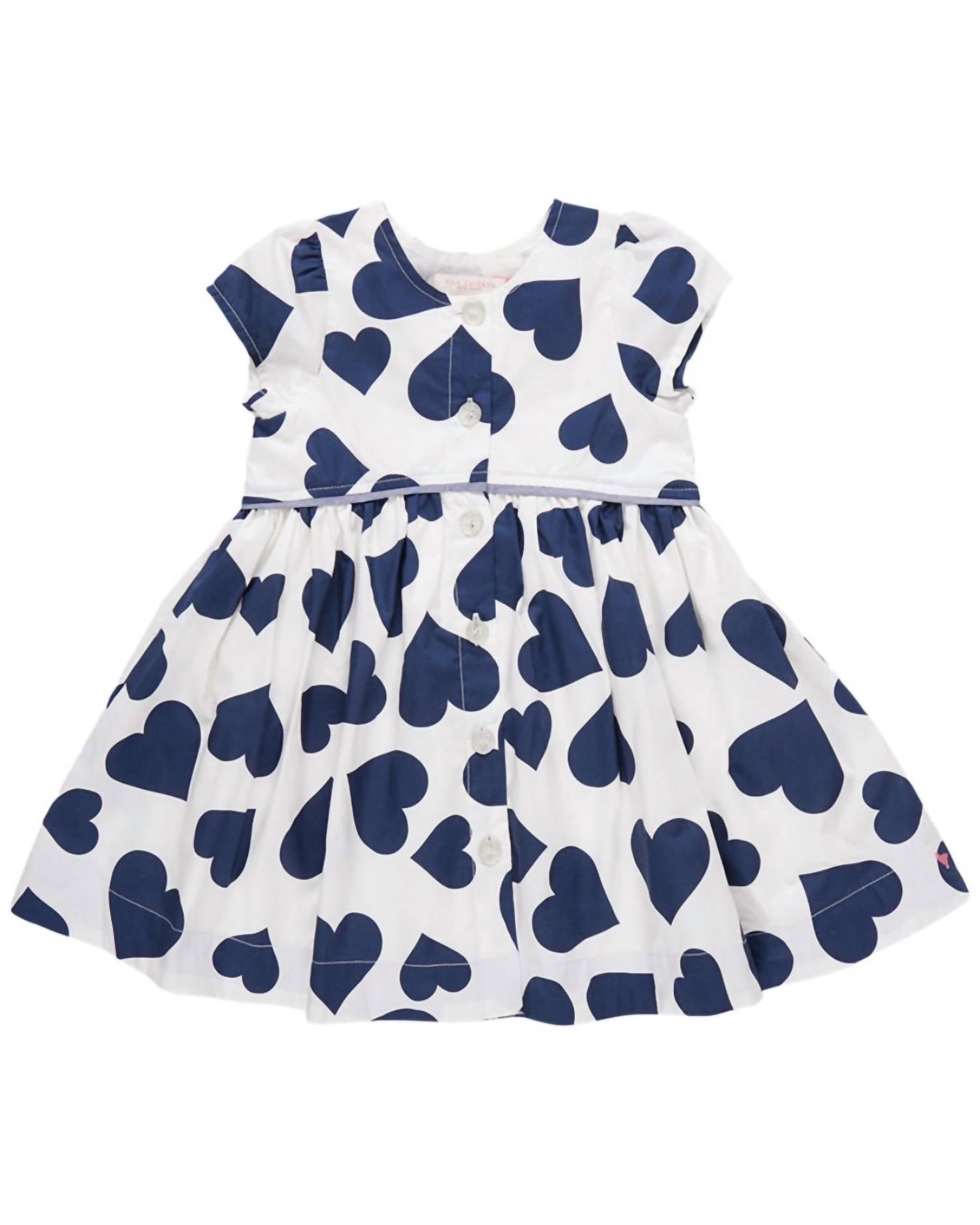 The Girls Fatima Dress by Pink Chicken is the perfect summer piece for your little fashionista. Designed from 100% cotton, it features a charming navy and white tossed heart pattern with a practical button front. This casual dress showcases a minimalist graphic style, perfect for a vacation wardrobe. Care instructions recommend hand washing to maintain its quality.