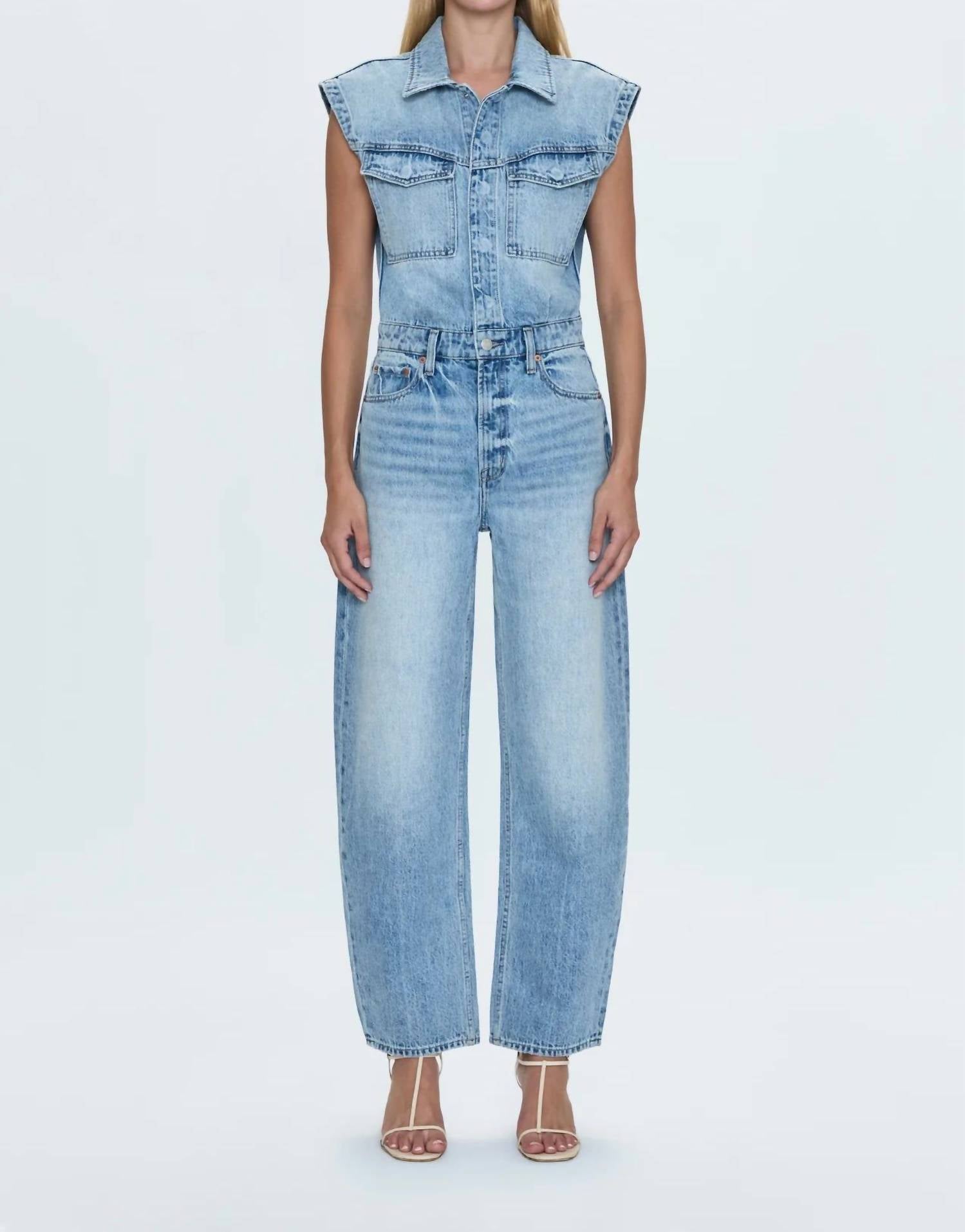 It doesn't take much for this one piece to look effortlessly cool. Add some statement jewelry to dress it up, or throw on some sneakers for a more casual vibe. Pistola Ace Sleeveless Barrel Leg Jumpsuit Color: Rally Size: XS, S, M Description The Ace jumpsuit boasts a strong shoulder, nipped waist and barrel leg silhouette, cut in rigid indigo denim and washed in a light vintage wash. • Inseam: 30”• Leg Opening: 16 1/2"• Model is wearing size small• 100% Cotton• Imported Wash cold