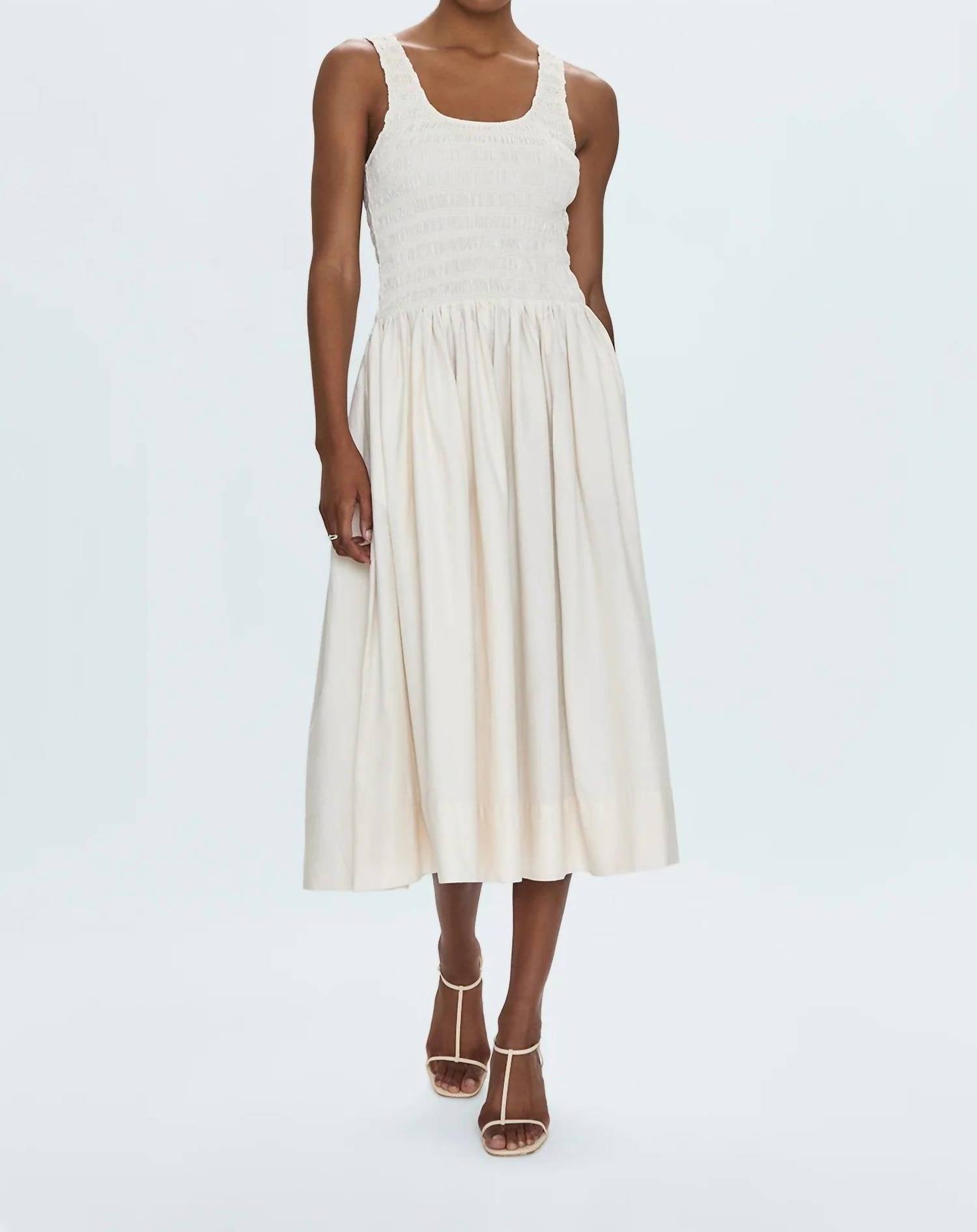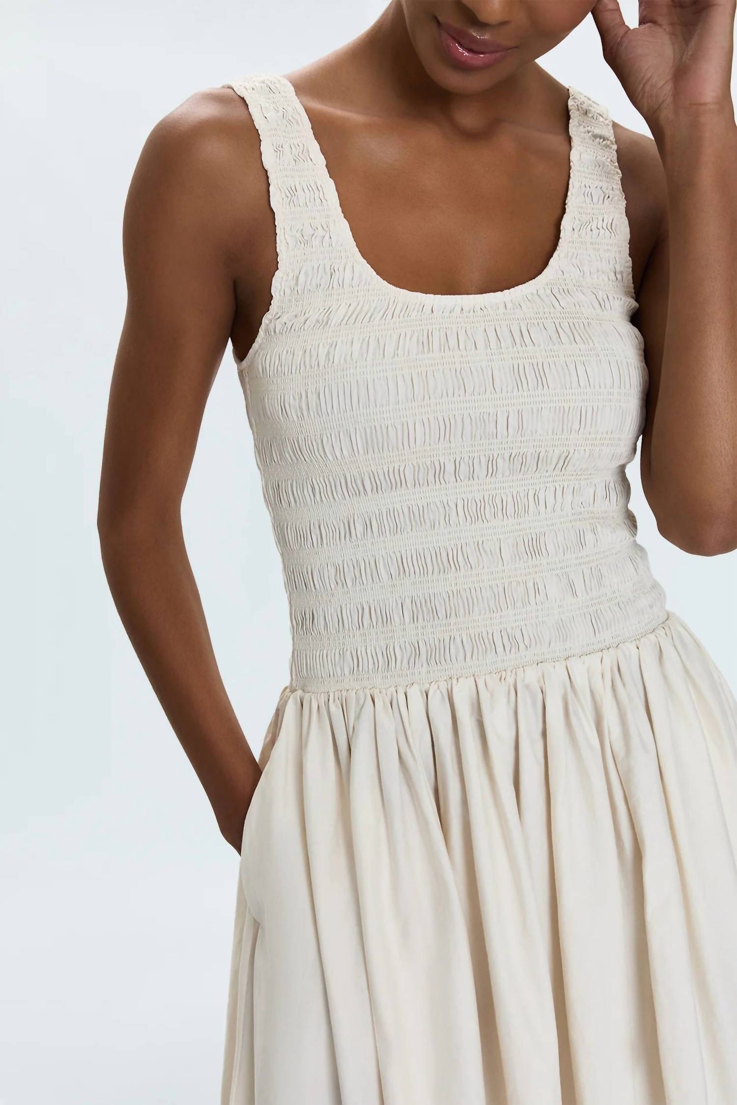 The perfect length dress does exist. Discover the Alessia Smocked Drop Waist Dress by PISTOLA, a perfect choice for spring in a delicate shell hue. This sleeveless day dress boasts a textured cotton blend composition of 97% cotton and 3% spandex, offering both comfort and stretch. Designed with a smocked tank style bodice, this pull-on midi dress features a ruched waistband and a fully proportioned skirt for an elegant silhouette. Care instructions include hand washing and line drying to preserve its quality, completed with a stylish squareneck.