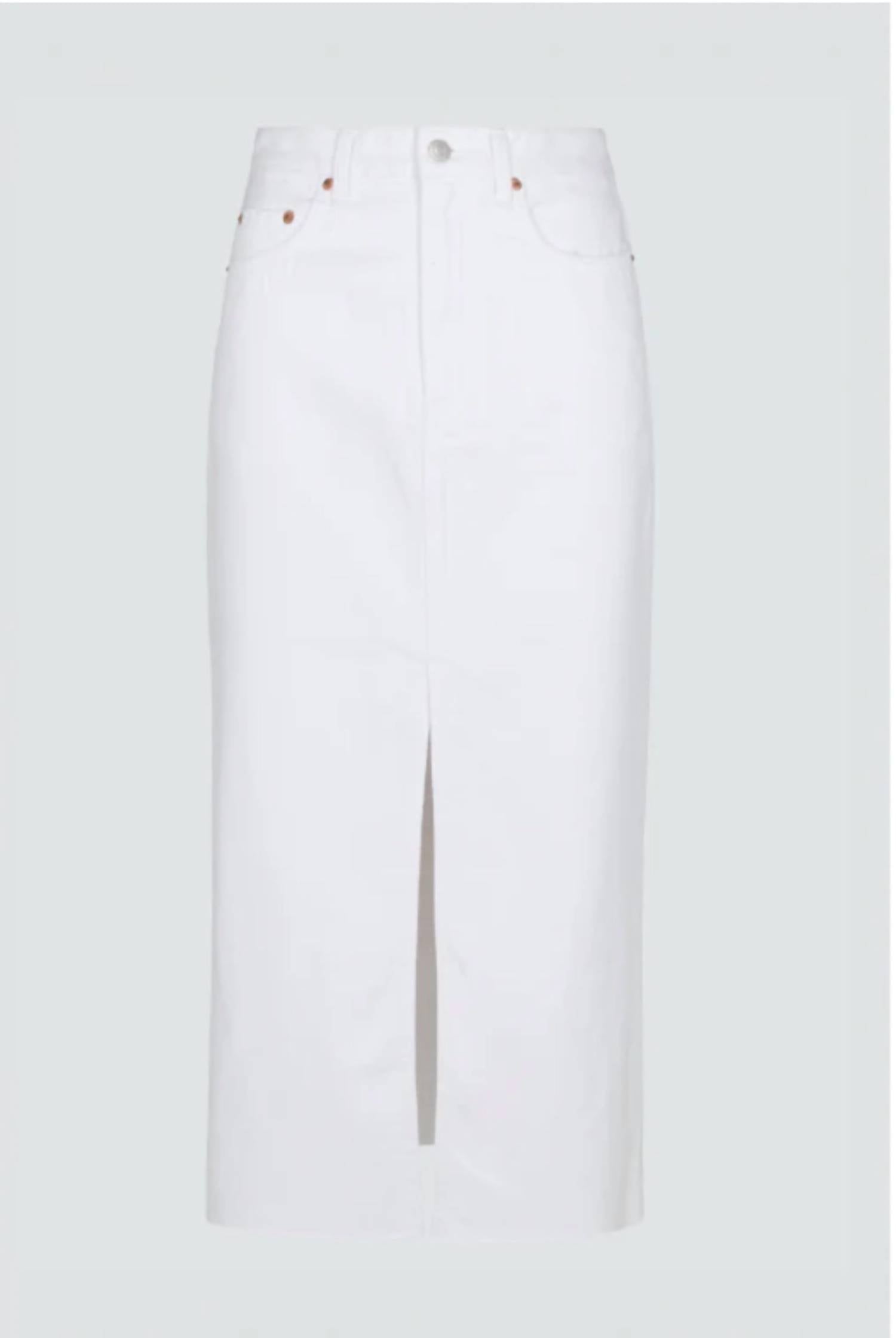 The midi length skirt is here to stay and we especially love this style. Fashionable addition to your wardrobe, perfectly suited for a minimalist fall style. Midi-length skirt is crafted from a rigid cotton blend, featuring 77% cotton and 23% rayon, ensuring a sophisticated fit and fall. Designed with a button closure and a five-pocket configuration, offers both style and functionality. Care for this solid white piece by machine washing and tumble drying as needed.