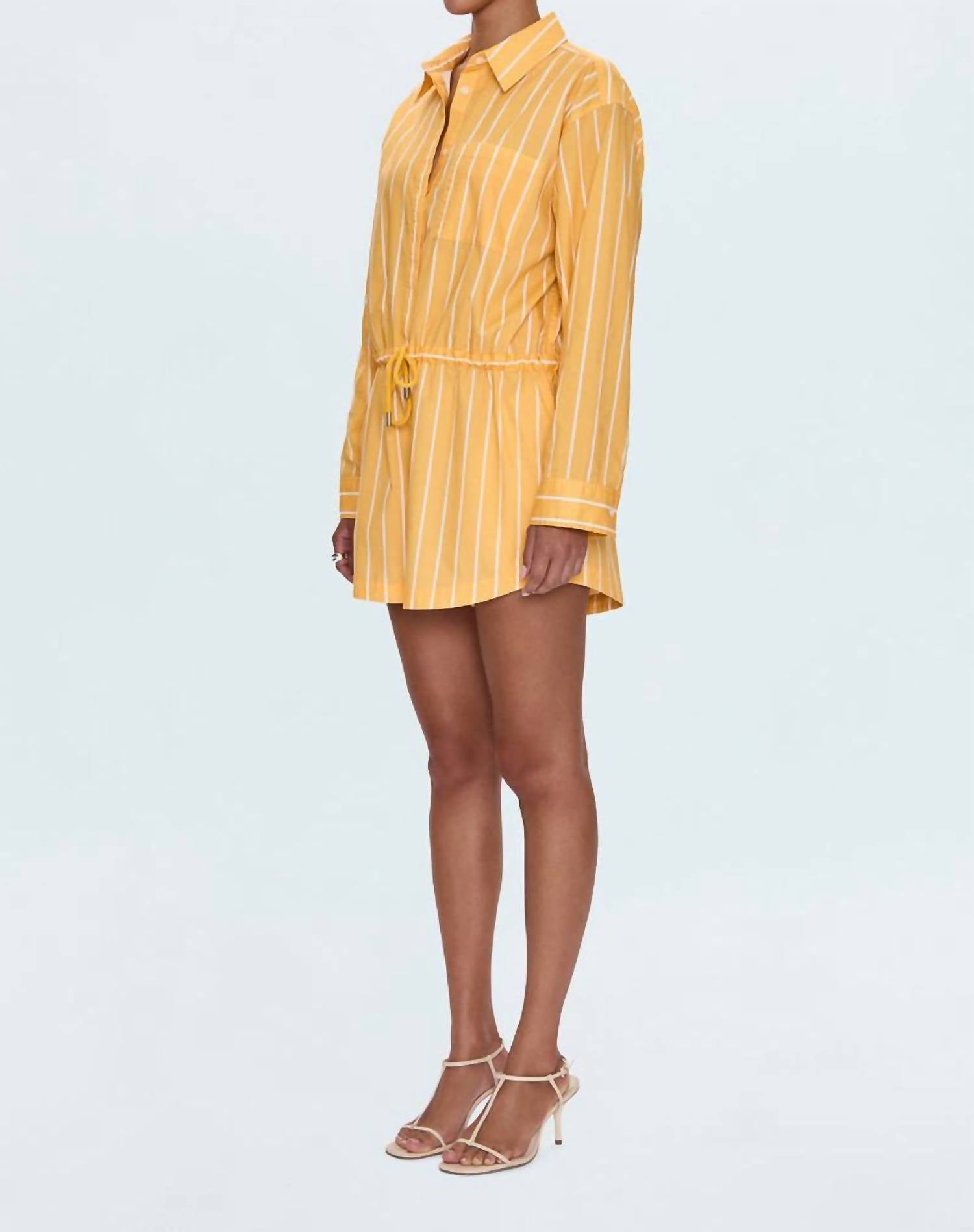 Meet the Amelie Long Sleeve Romper by PISTOLA, a perfect blend of style and comfort for your summer adventures. Crafted from a lightweight cotton blend, it features a collared, button-up bodice and a relaxed short silhouette. Its bright Papaya Stripe pattern adds a pop of color, while the adjustable drawstring waist ensures a flattering fit. Care is easy with machine wash instructions, making it ideal for travel and boho chic trends.