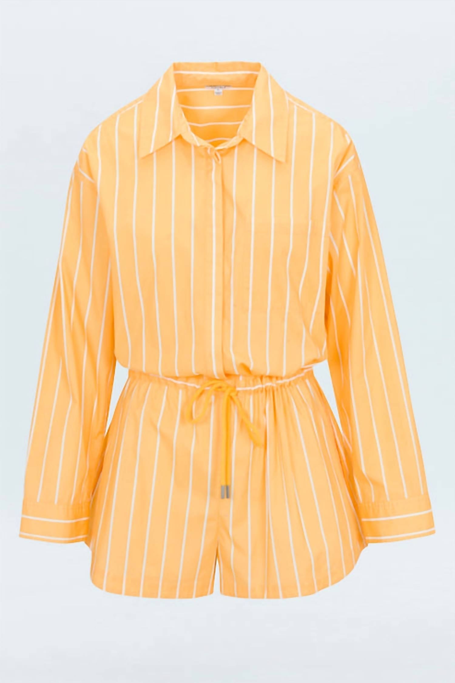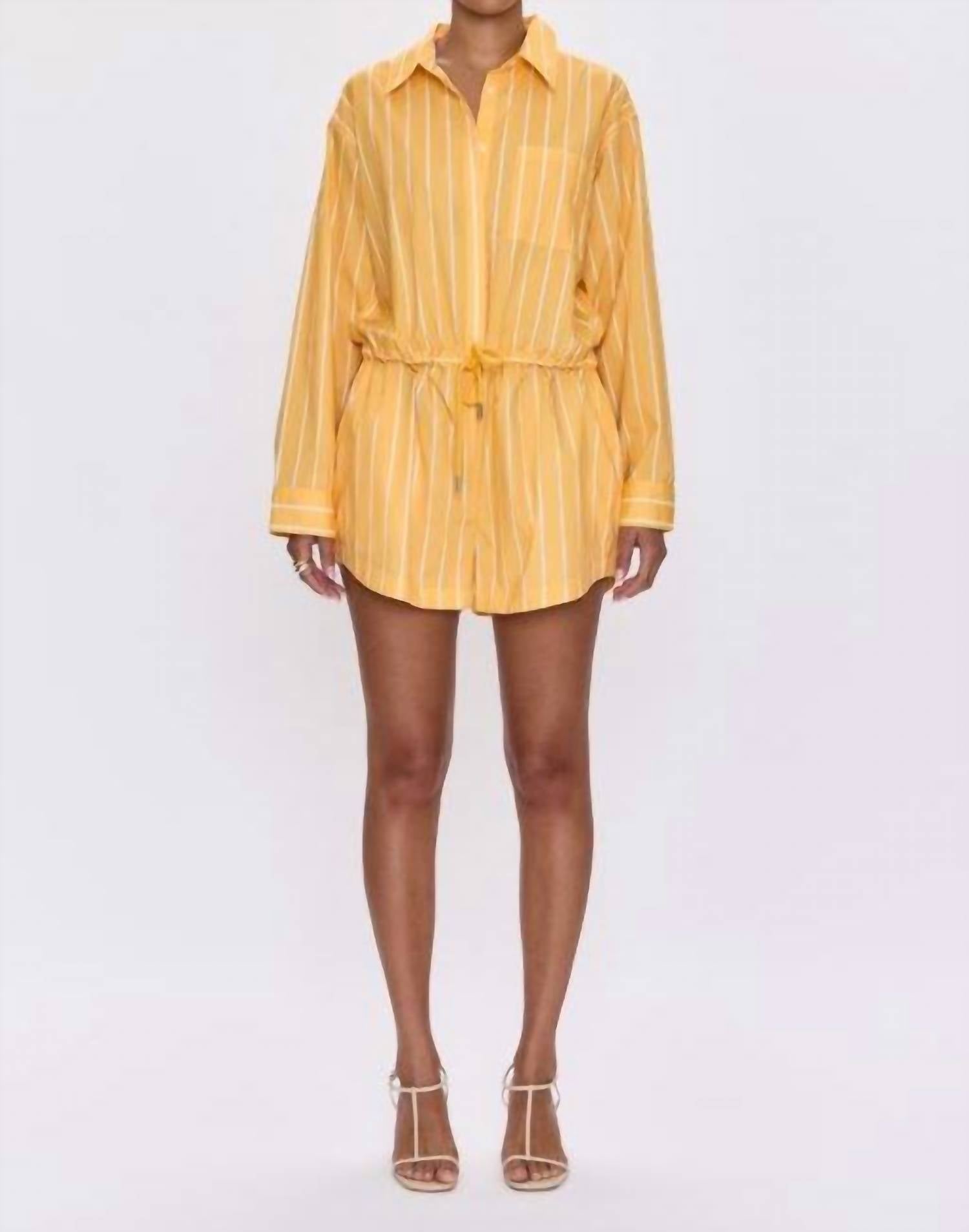 The Amelie Romper by PISTOLA introduces a splash of vibrant style with its Papaya Stripe pattern, featuring a lively pop of yellow contrasted by a crisp white pinstripe. This transitional romper offers a relaxed, flattering fit with a collared, button-up bodice and adjustable drawstring waist. Crafted from a breathable cotton blend, it includes practical pockets and a short 2.75” inseam, perfect for spring adventures. Closure: Button closure. Care instructions: Machine wash cold. Imported, this piece embodies effortless streetwear flair ideal for travel occasions.