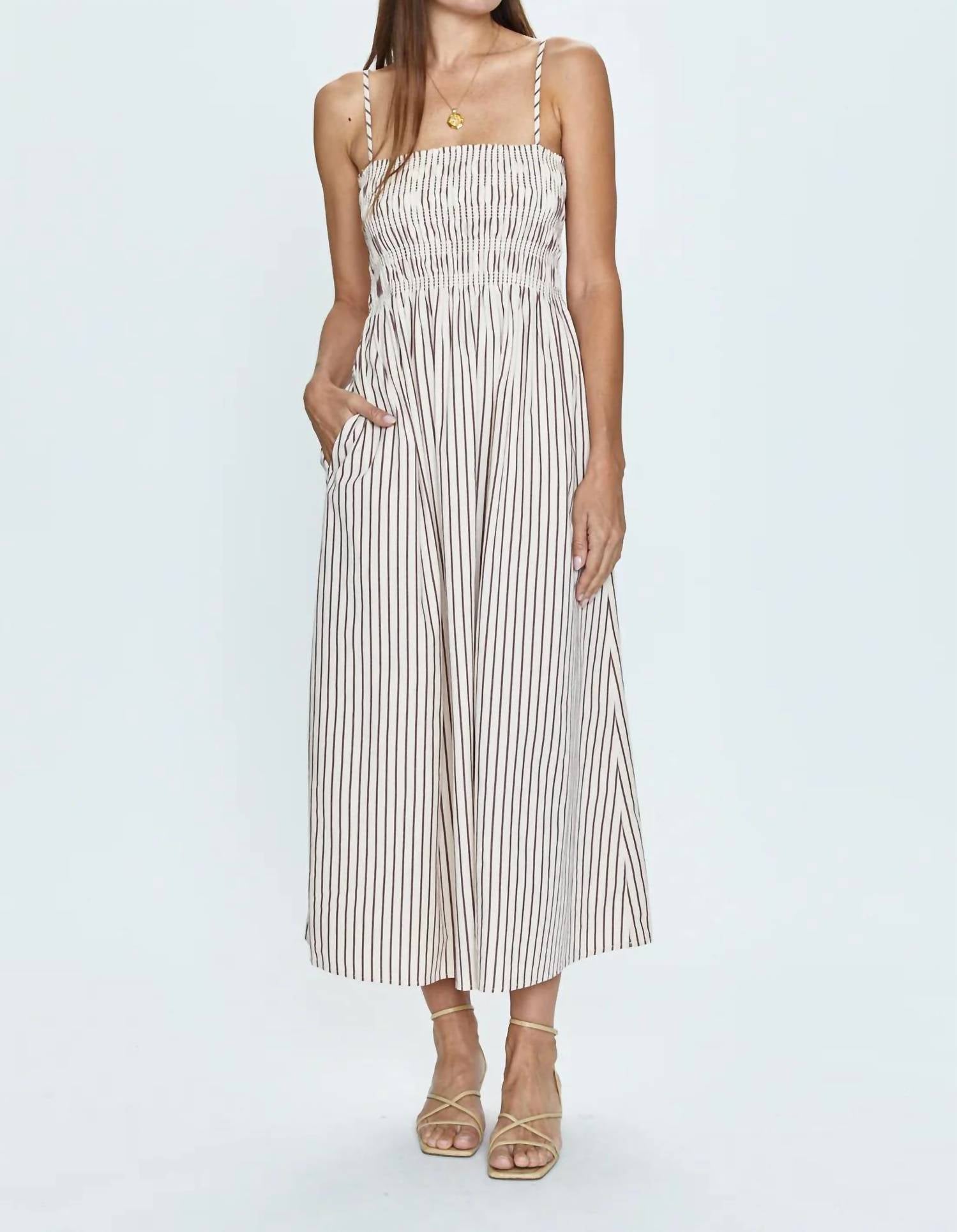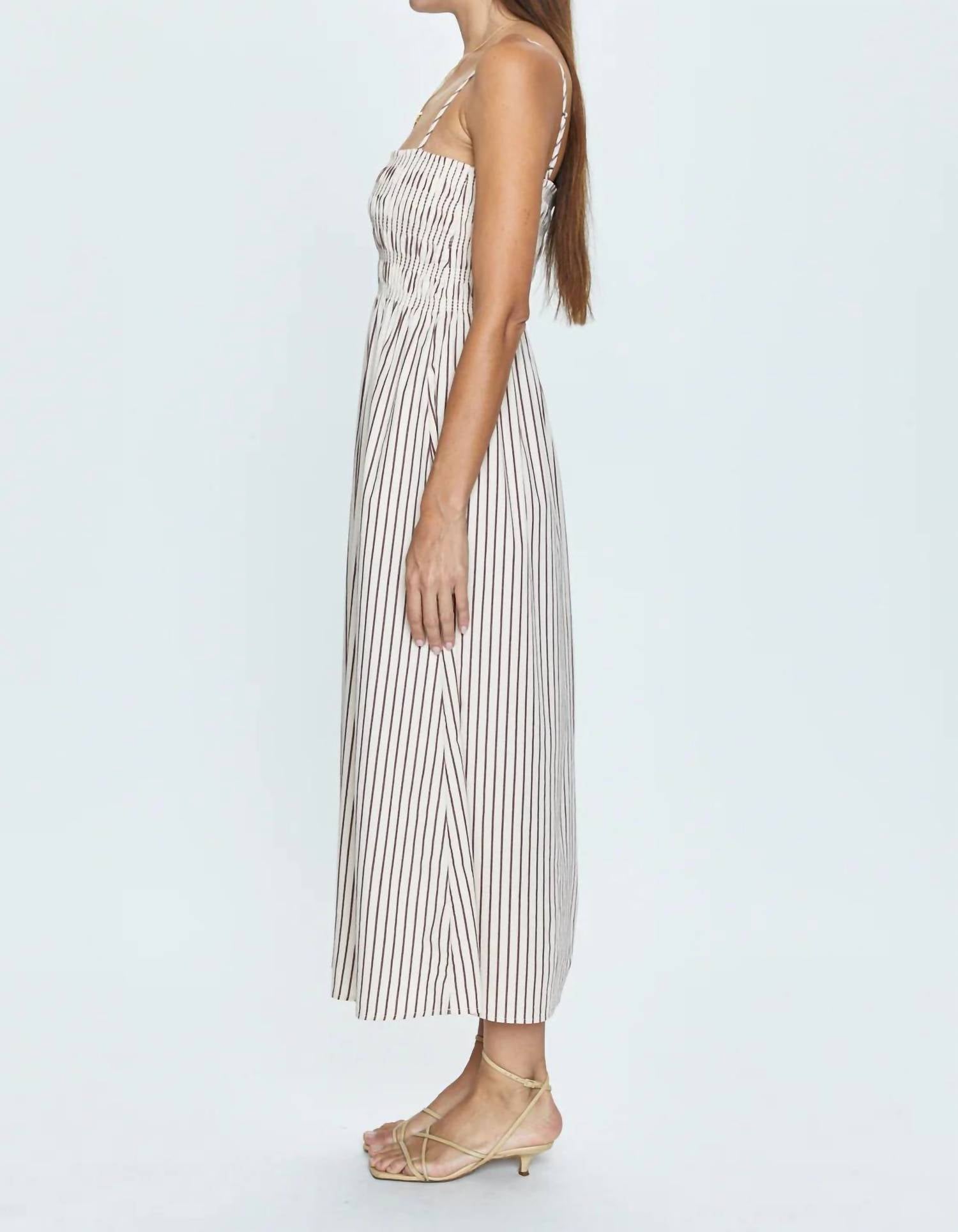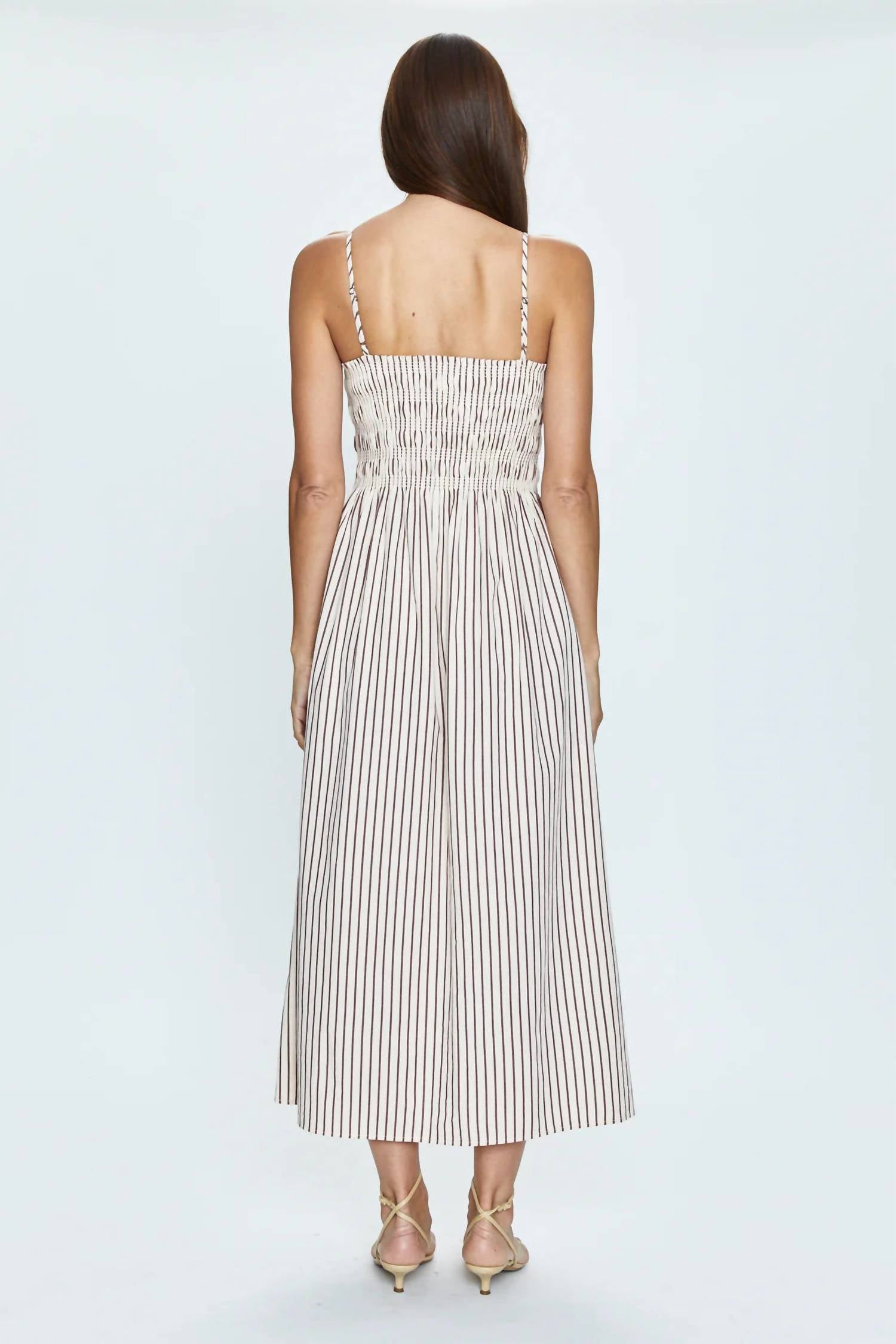 The perfect length dress does exist. Introducing the Bianca Smocked Bodice Dress by PISTOLA, your go-to choice for warm weather elegance. This midi dress in a delightful Tiramisu Stripe pattern is crafted from a lightweight Cotton Blend and features adjustable spaghetti straps for a perfect fit. Designed with a smocked bodice and ruched details, it offers both style and comfort. Pull-on. Hand wash and line dry are recommended. 97% cotton / 3% spandex.