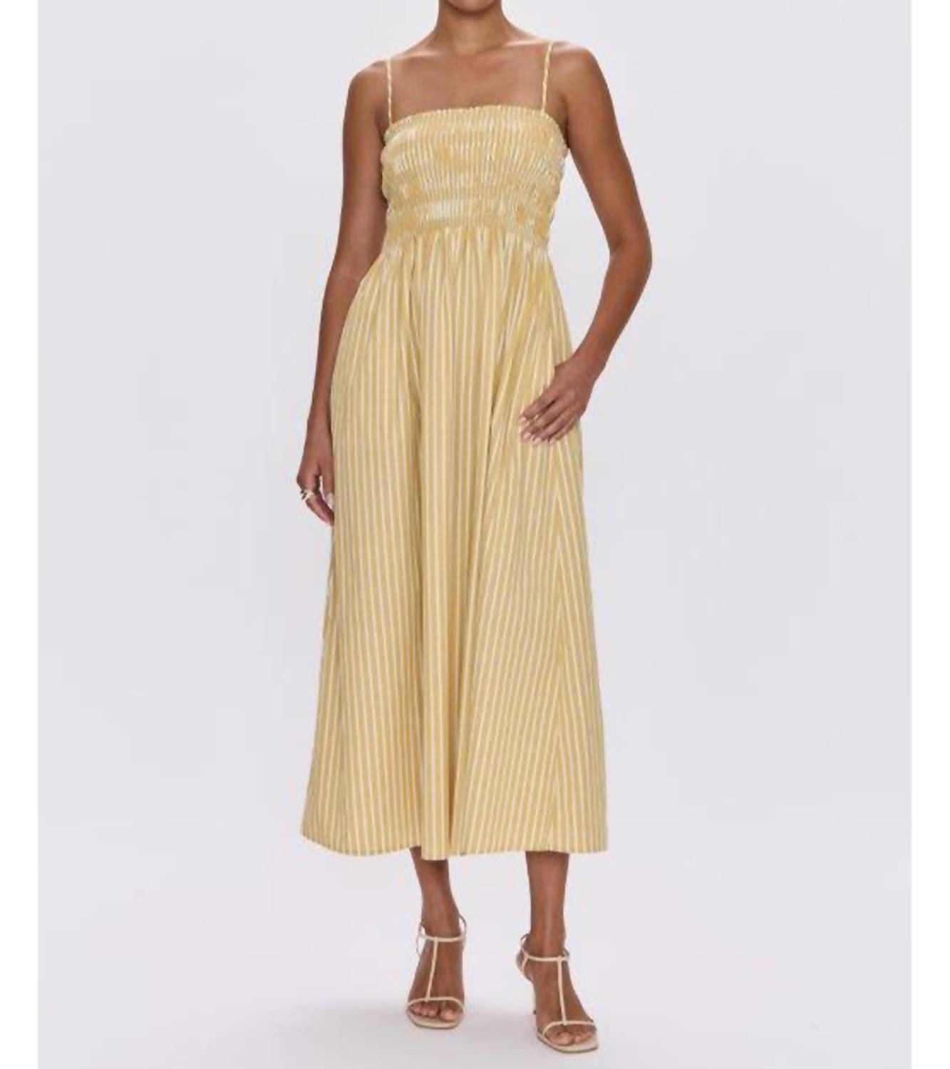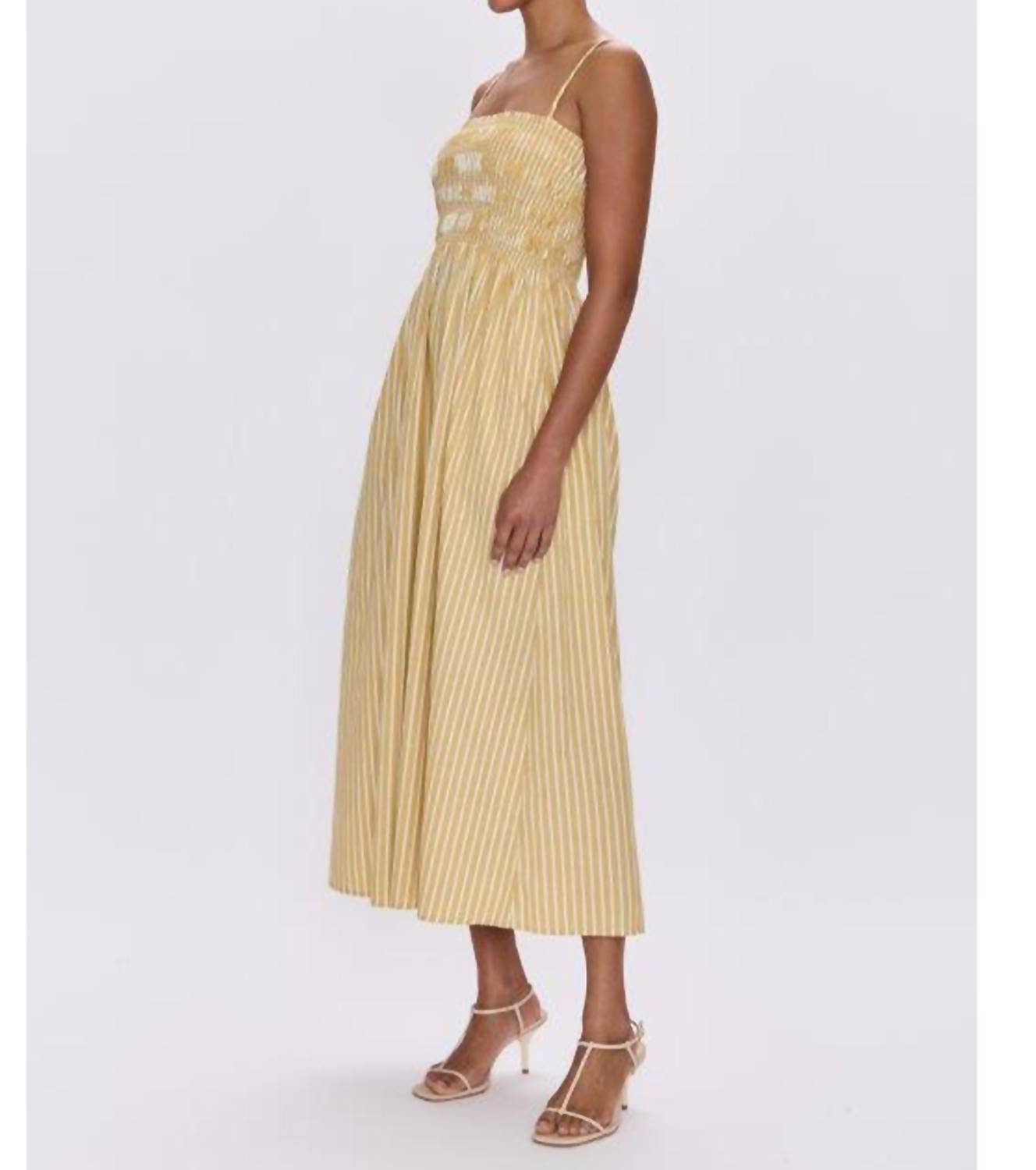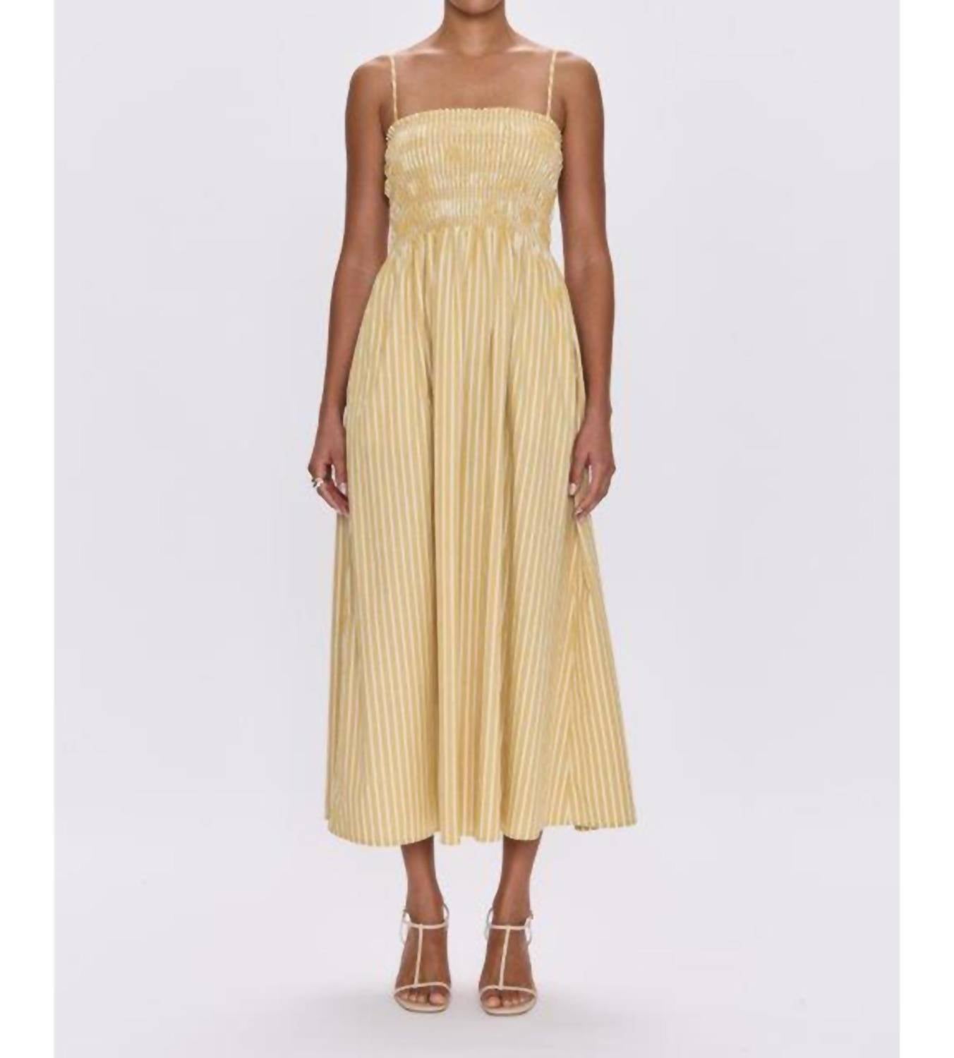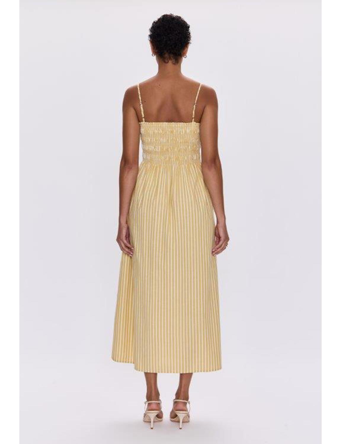 Embrace the summer season with the Bianca Smocked Bodice Dress by PISTOLA, a vacation-ready piece in a chic Beach Sand Stripe pattern. This sleeveless A-line midi dress features a squareneck and adjustable shoulder straps for a tailored fit. Crafted from a comfortable cotton blend composition of 97% Cotton and 3% Spandex, it ensures a breezy feel throughout the day. Closure Type: Pull on. Care: Machine wash and lay flat to dry, making it an easy addition to your wardrobe.