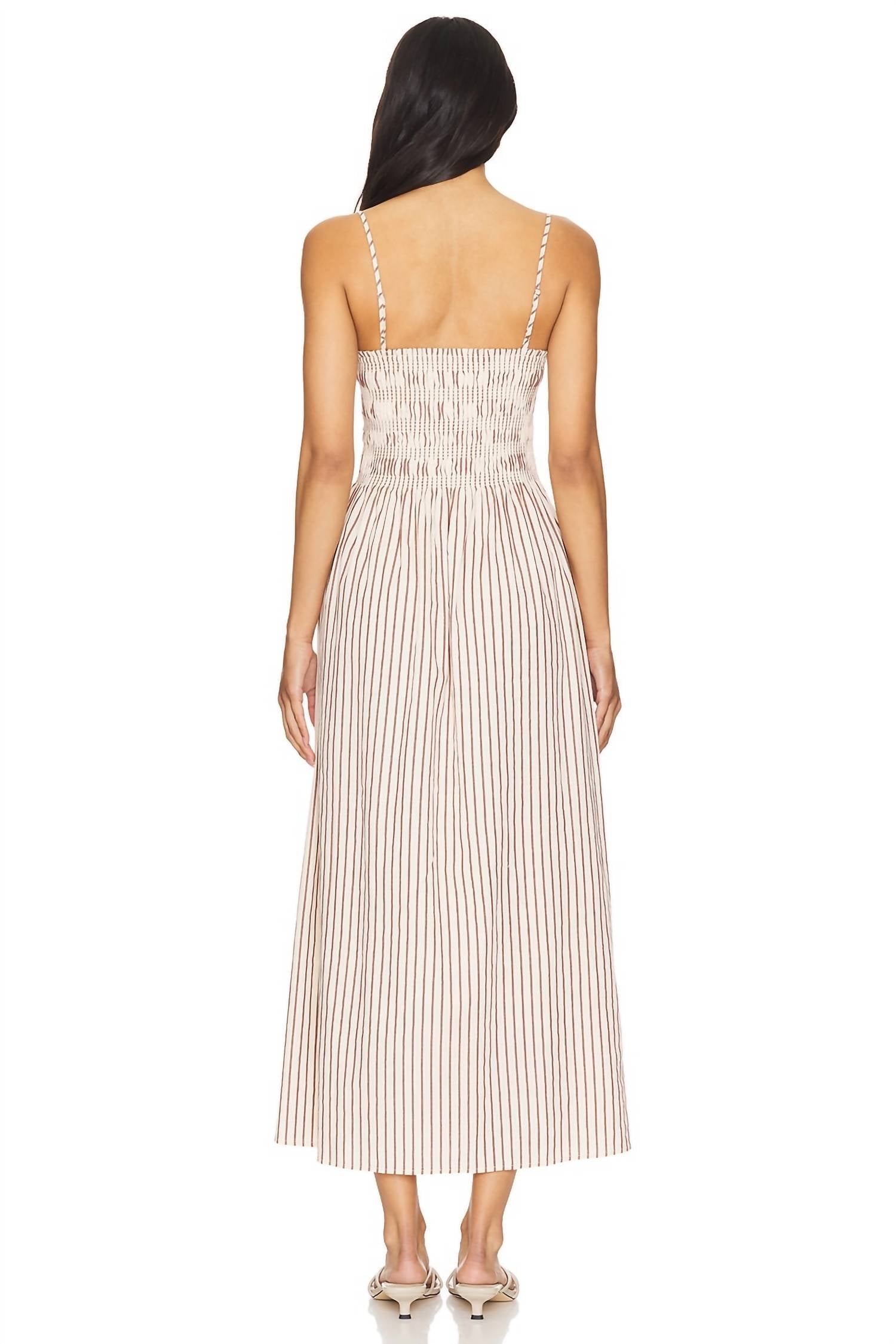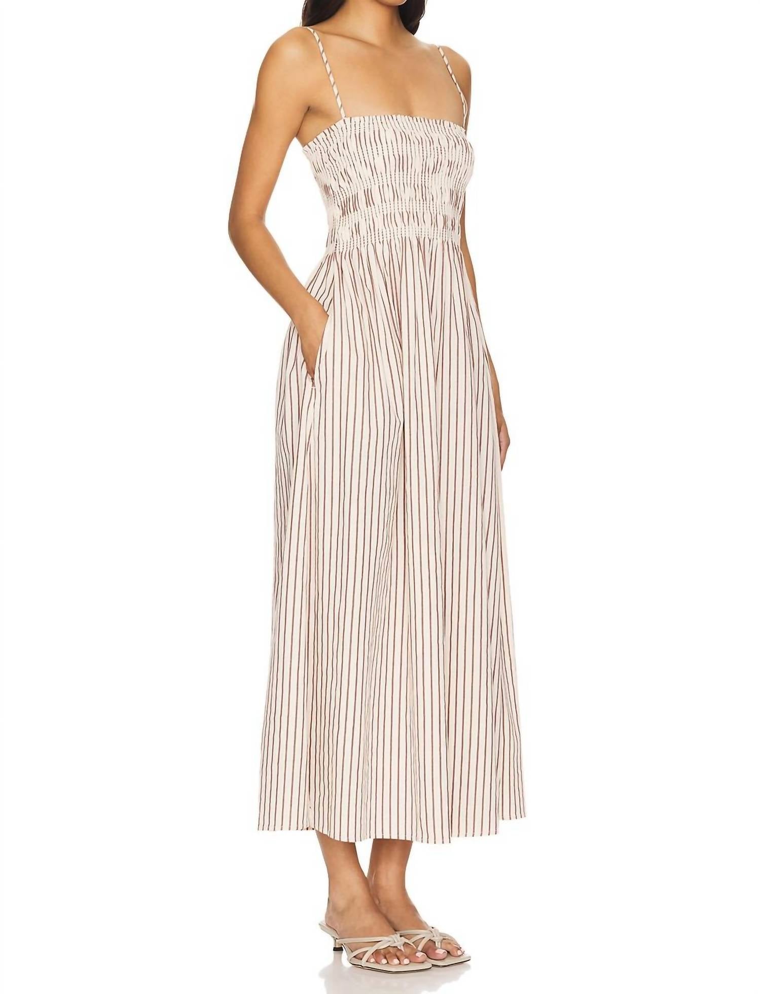 Discover the Bianca Smocked Bodice Dress by PISTOLA, perfect for a breezy summer day. This maxi dress in Tiramisu Stripe features adjustable spaghetti straps and a flattering A-line silhouette. Made from a blend of 97% cotton and 3% spandex, it offers a comfortable fit and has a length of 45.5 inches. Designed with a pull-on closure and suitable for machine wash, this dress is crafted in China.