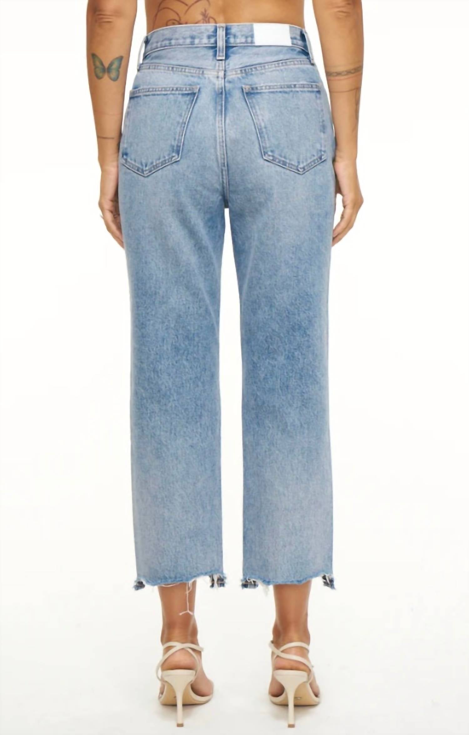 Meet the Cassie Super High Rise Crop Jeans by PISTOLA, designed to offer both style and comfort in the color UNIVERSITY. These slim-fit jeans feature a straight-leg design crafted from 100% cotton and include a button closure. Perfect for a relaxed yet chic look, they come with pockets and a trendy distressed detail at the knees, hitting just above the ankle. Care instructions are effortless: machine wash and tumble dry, making them a perfect choice for a spring dinner party.