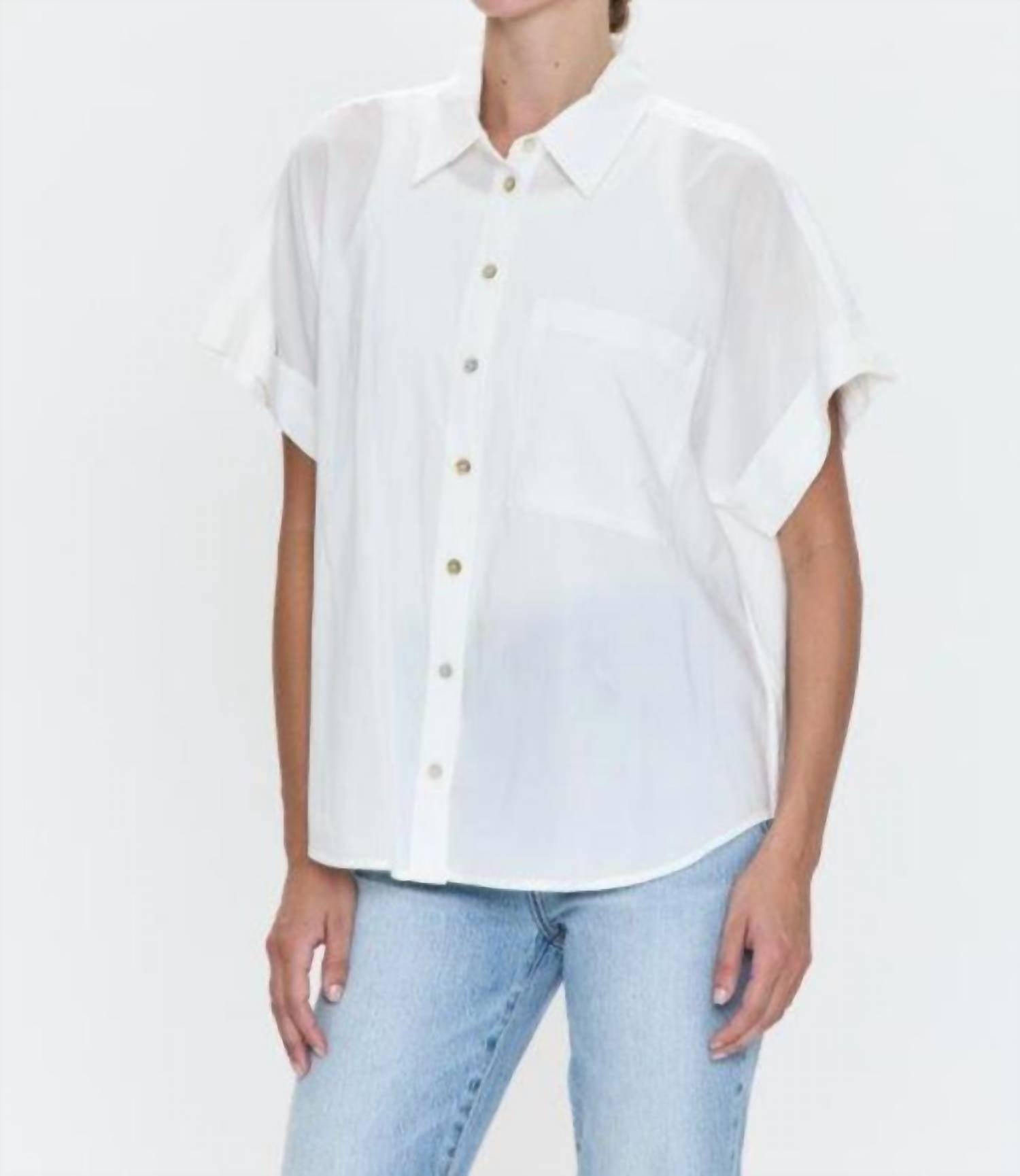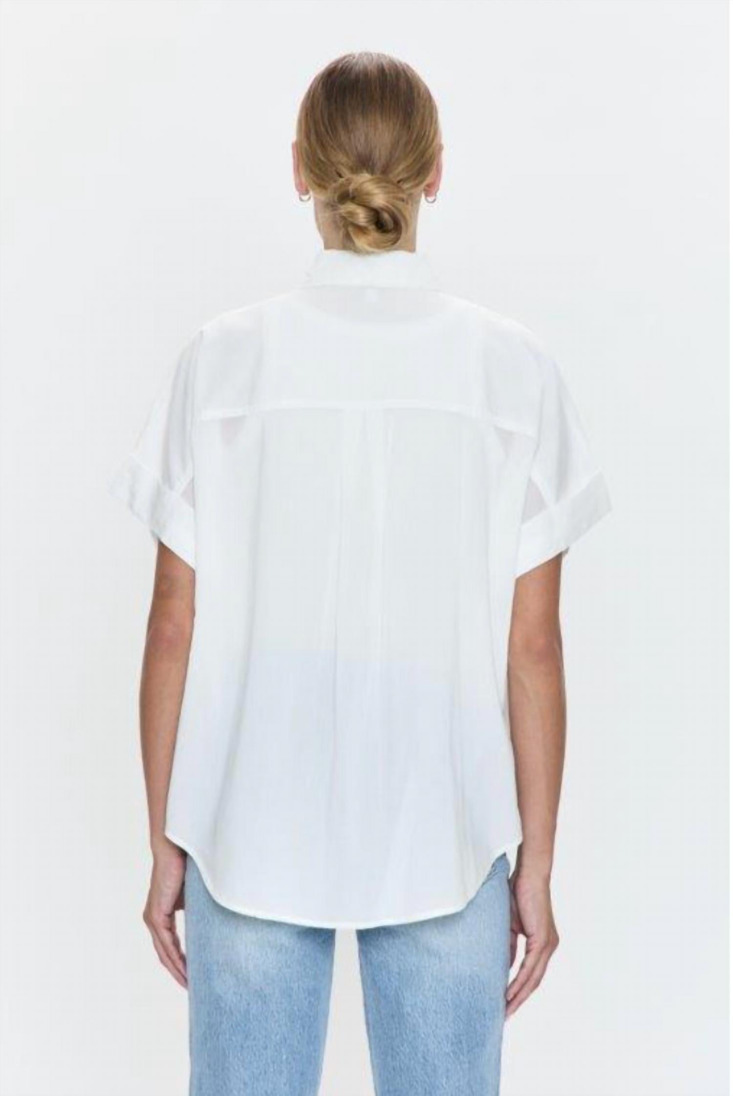 A classic button down shirt that will never go out of style. The Donnie Short Sleeve Button Up Top by PISTOLA in Le Blanc offers a perfect blend of comfort and style. Crafted from 55% cotton and 45% rayon, this solid-button-down shirt features a collar neckline and convenient pockets, ideal for everyday wear. Closure is effortless with a button system. This versatile piece is designed for women seeking casual sophistication without the fuss.