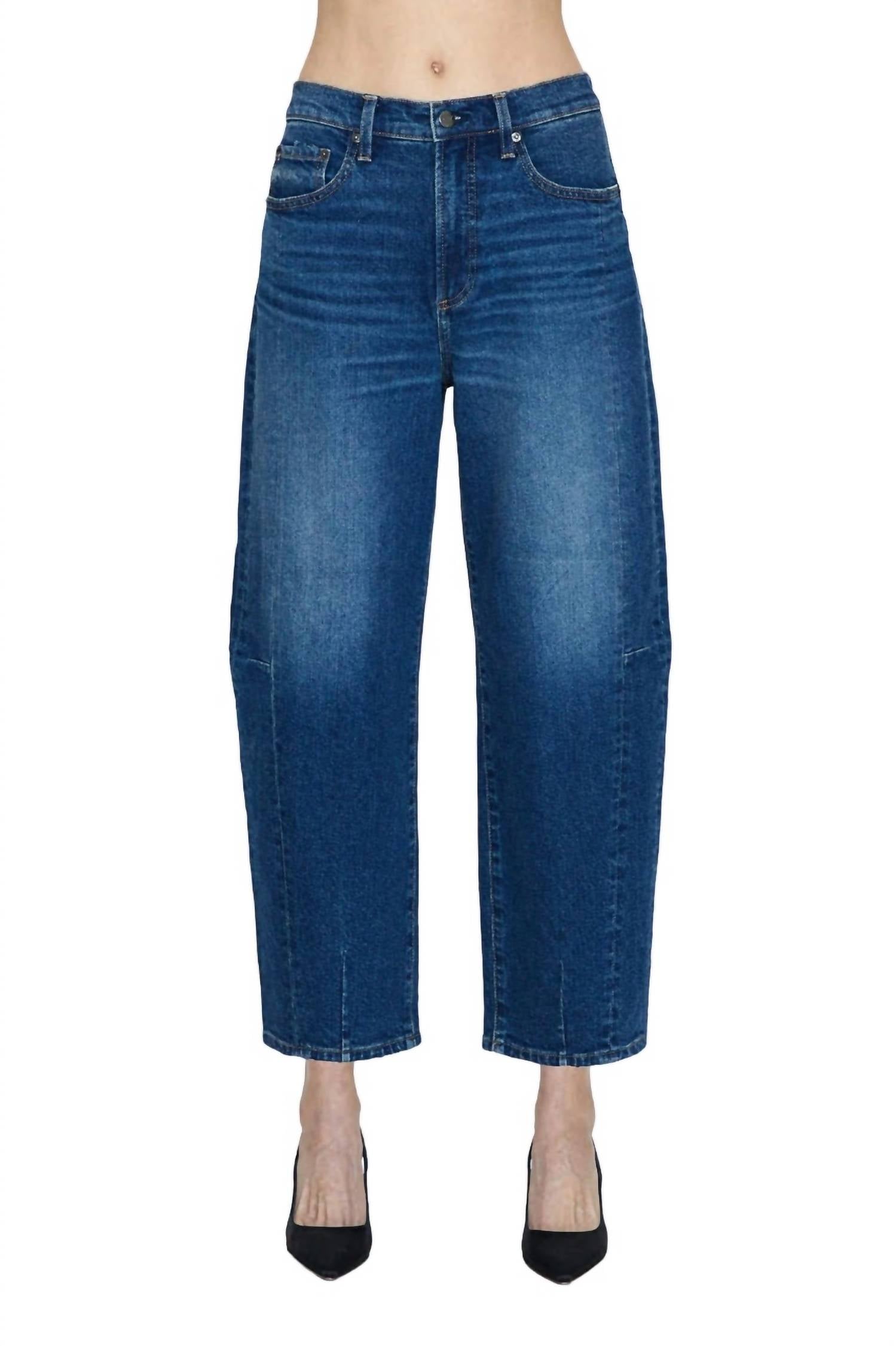Fit to perfection, we love these high-waist jeans and you will too.Modern silhouette with subtle bowing and a relaxed fit. Dimensional seaming and a cropped hem. 98% Cotton / 2% Spandex. Machine Wash Cold.