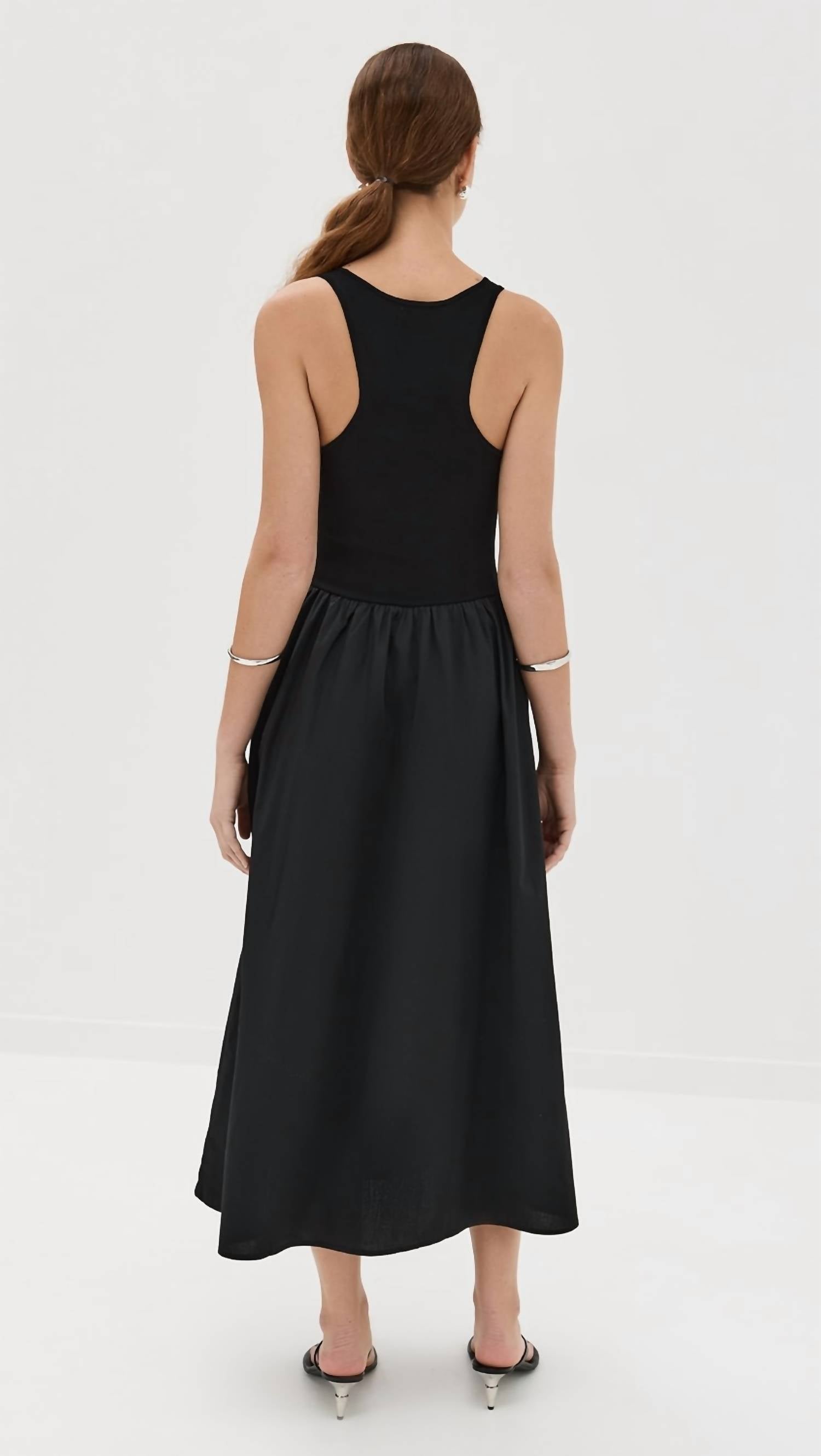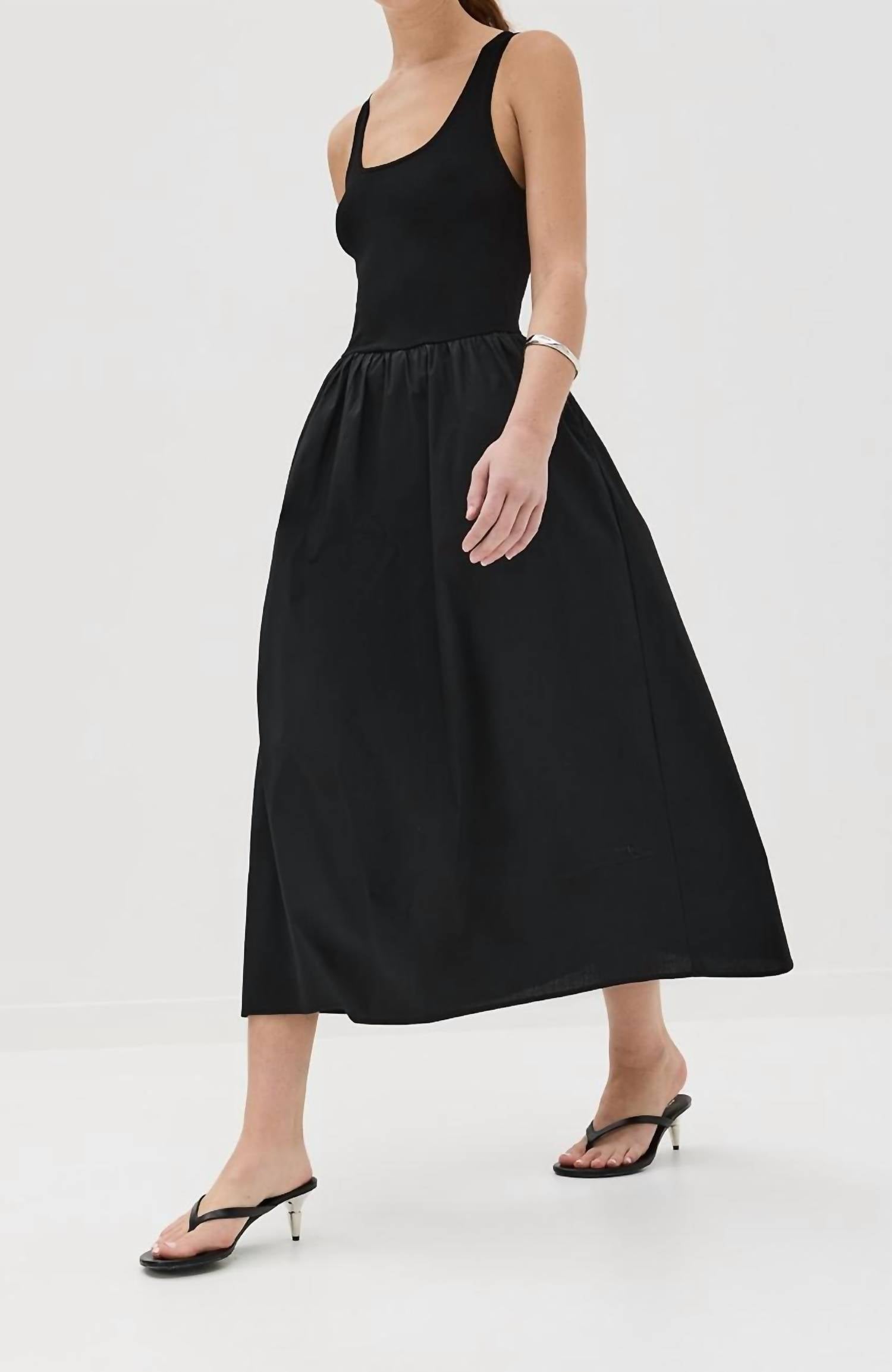 The perfect length dress does exist. The Faye Tank Dress by PISTOLA in Noir combines minimalist sophistication with unmatchable comfort. This sleeveless A-line dress, made with a blend of 61% viscose, 37% nylon, and 2% spandex, features a scoop neck and a compact knit bodice that cascades into a flounced wide midi-length skirt measuring 49.5 inches. Designed with practical on-seam hip pockets, it offers a pull-on closure for easy wear. Care is simple with machine wash cold instructions, and this versatile piece is imported.