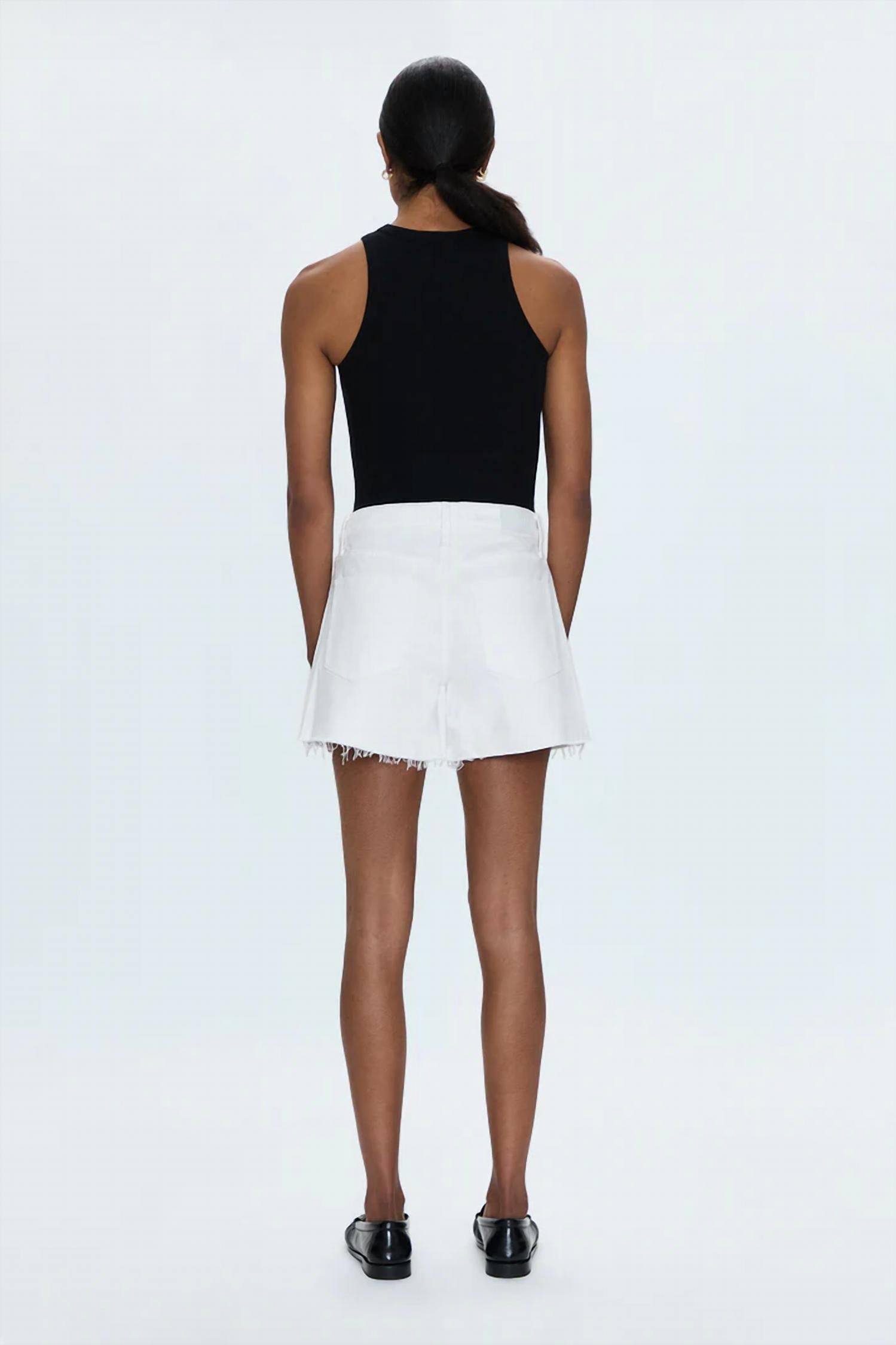 Not only cute but extremely comfortable. The jean shorts you will be reaching for all season long. Introducing the Kennedy Relaxed Cut Off Short by PISTOLA, a stylish addition to your summer wardrobe. These women’s mid-rise shorts made from comfortable cotton feature a medium-length inseam of 3 inches. With a solid white color and moderate distressing, this piece offers a trendy, relaxed fit, enhanced by its raw scissor cut hem. Ideal for vacation and streetwear occasions, the shorts are versatile with pockets and easy to care for with machine washing. Material: 100% cotton.