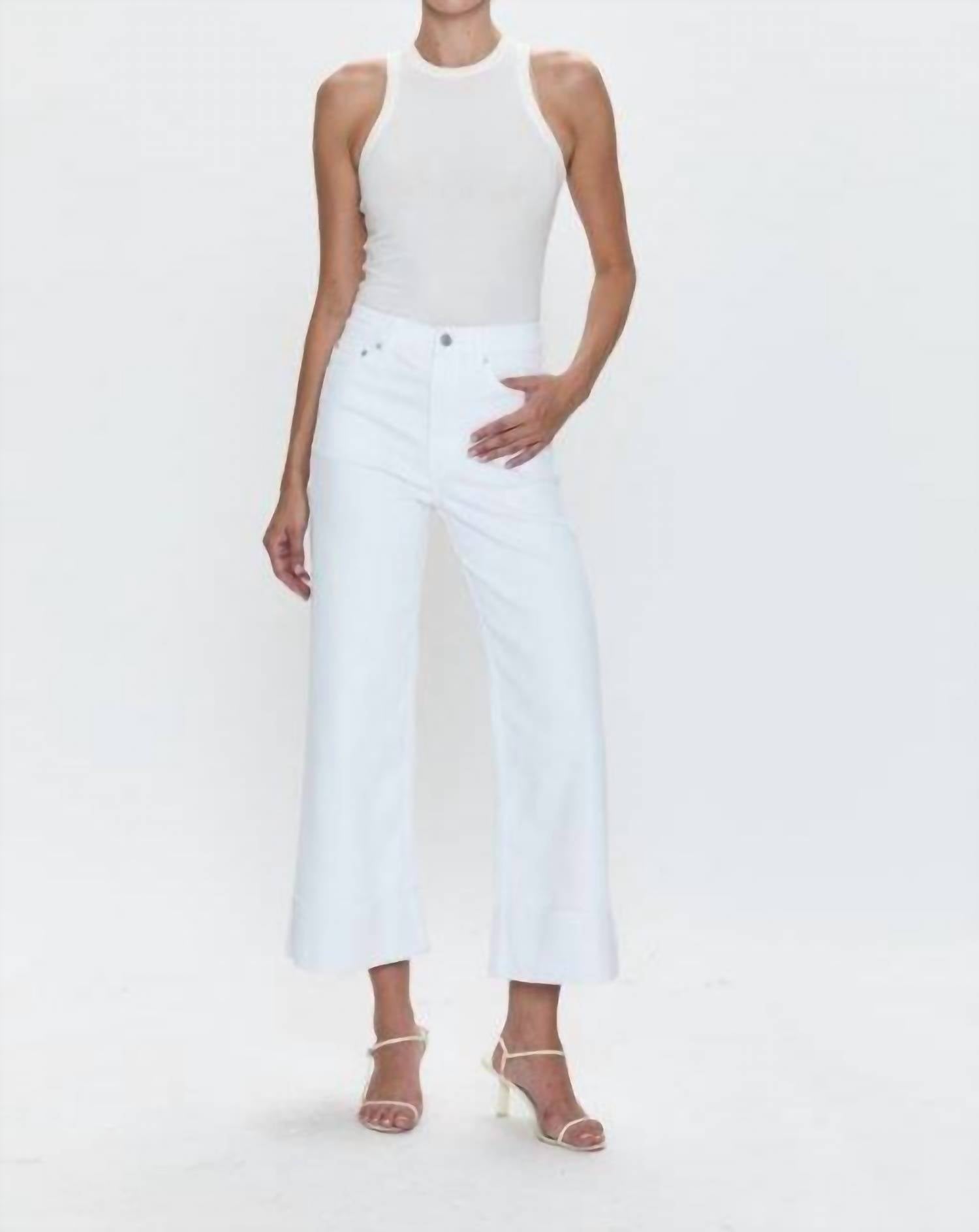 Pair these wide leg jeans with mules, slides or your favorite strappy sandals. Elevate your spring wardrobe with the Lana Cuffed Crop Wide Leg by PISTOLA, crafted in a crisp white cotton blend for a minimalist appeal. These high-rise pants feature a solid pattern with a flattering wide leg silhouette and practical pockets. The button closure ensures a secure fit, perfect for vacations or holiday gatherings like Thanksgiving. Embrace timeless style with these versatile women's pants.
