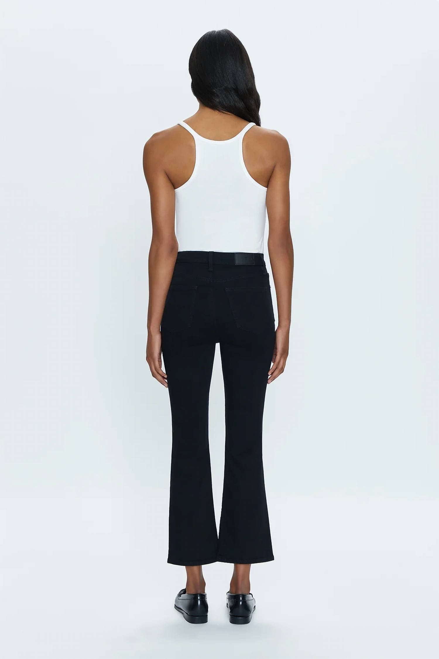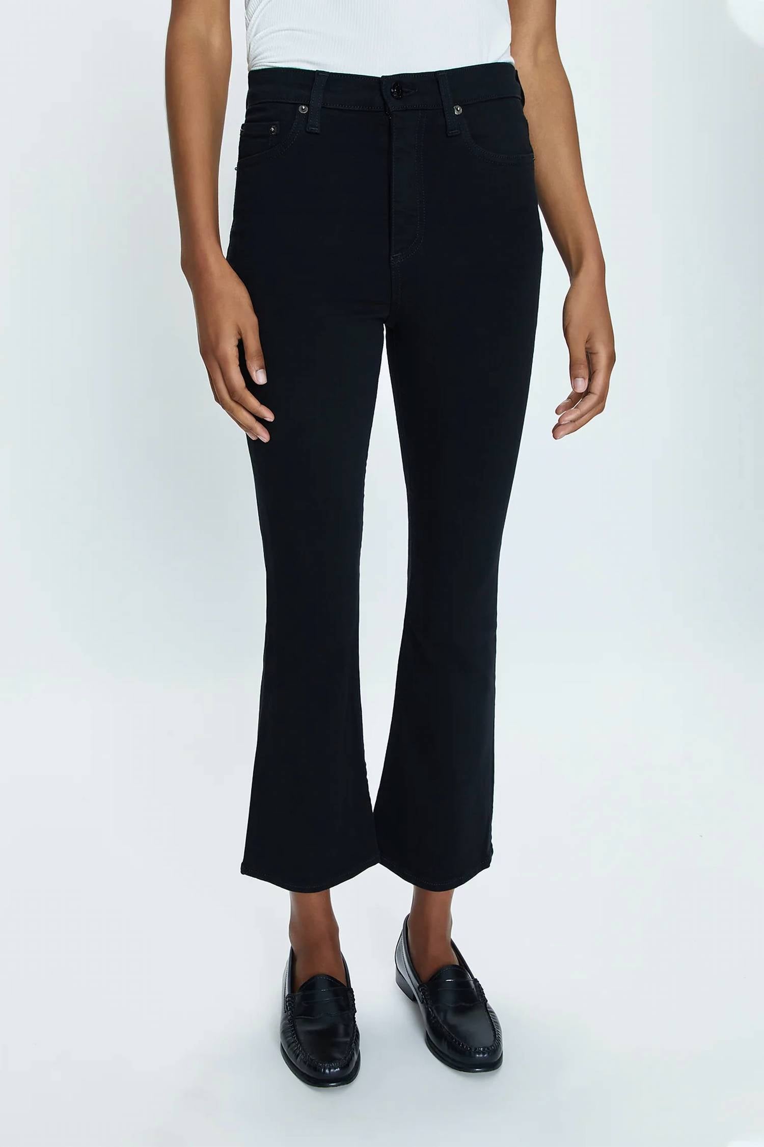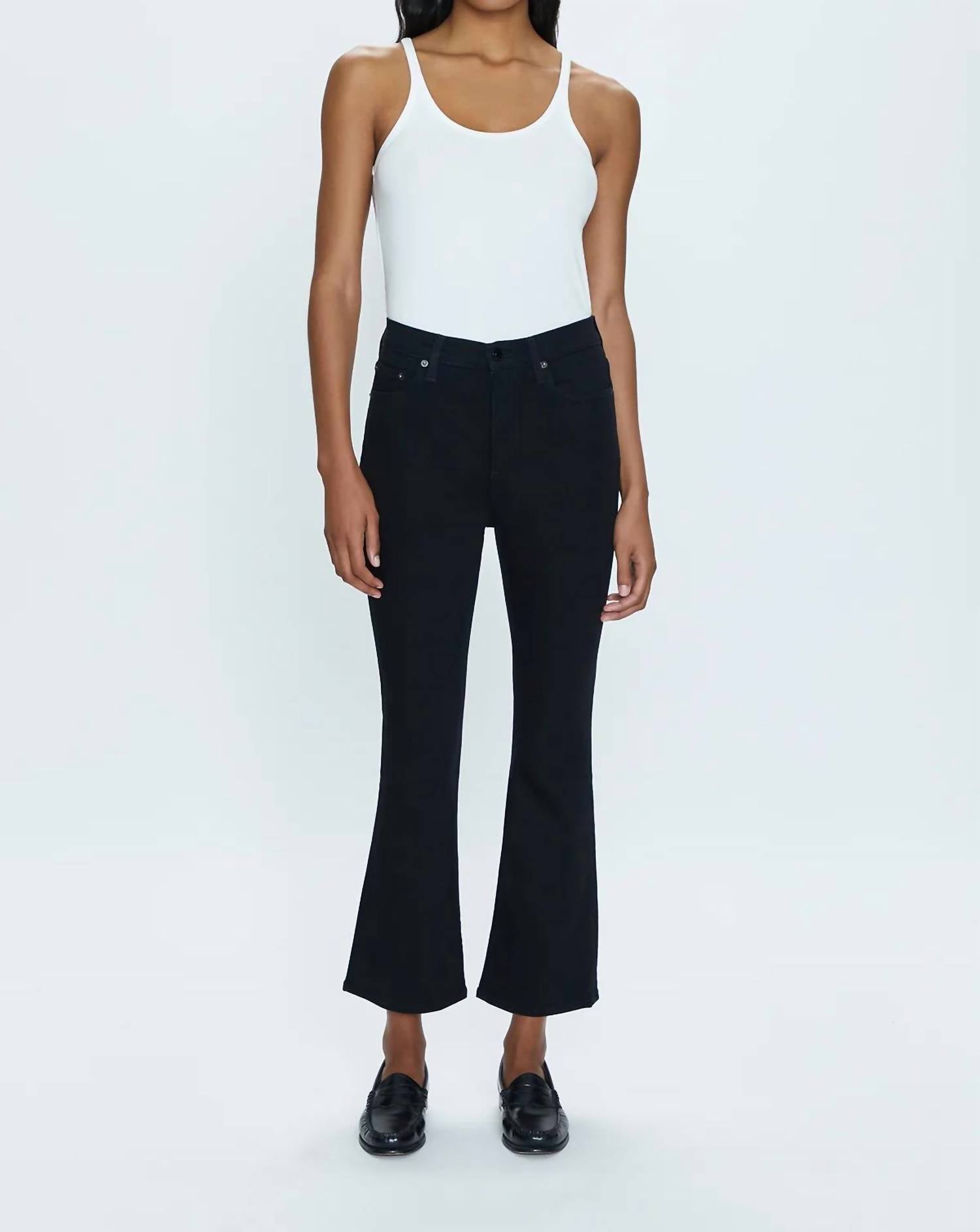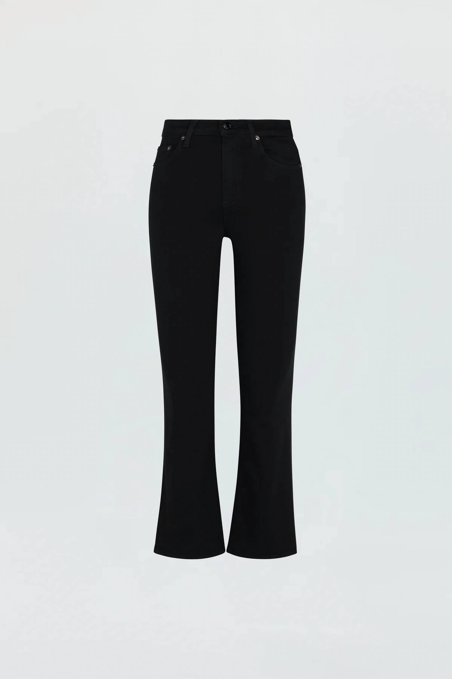 If you're looking for boot-cut, this is the jean for you. Featuring a high-rise waist and cropped ankle hem in a noir solid finish. Boot cut jeans are crafted from 98% cotton and 2% elastane. Ensuring comfort with a comfort fit and comfort-stretch material. Include practical pockets and a classic button closure. Offering both functionality and elegance. With a rise of 11 inches and a 27-inch inseam. Machine washable for easy care.