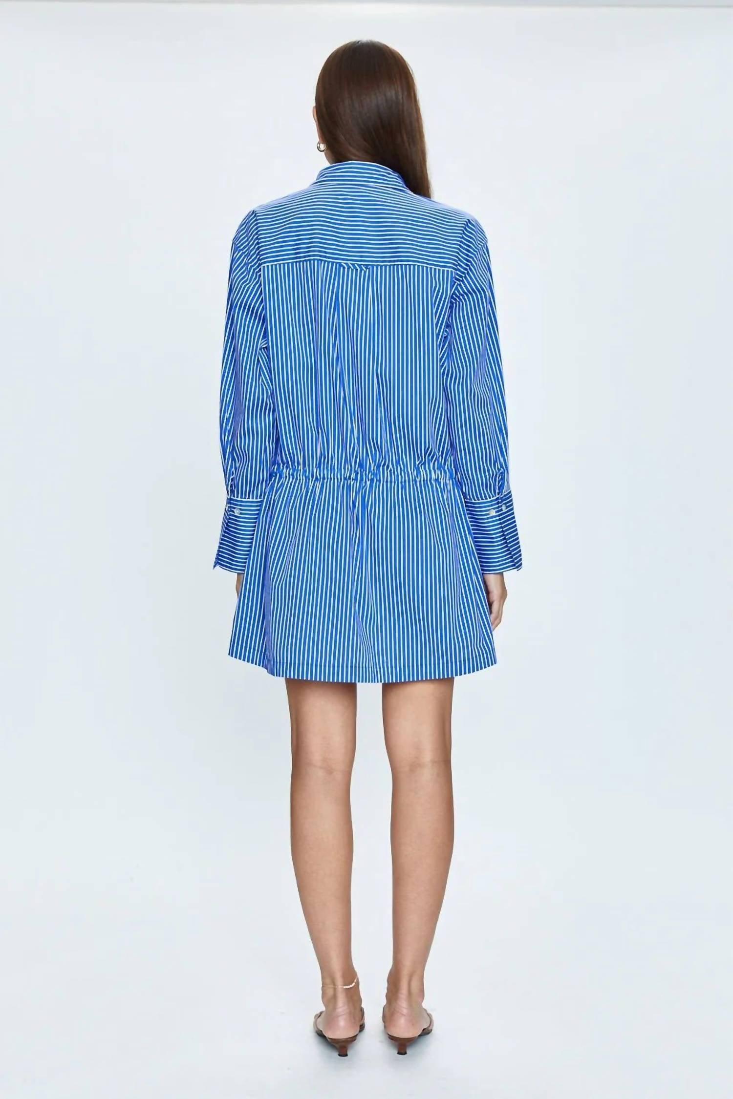 Comfortable and cute, this casual day dress has it all. The Lucinda Cinched Waist Dress by PISTOLA is a captivating choice for any occasion, exuding sophistication with a playful flair. Designed with long sleeves and a flattering A-line silhouette, this ultramarine stripe dress is crafted from a cotton blend for comfort and style. It features a cinched waist, a stylish collar, and functional pockets, all enhanced by a button closure. Care instructions: hand wash only.