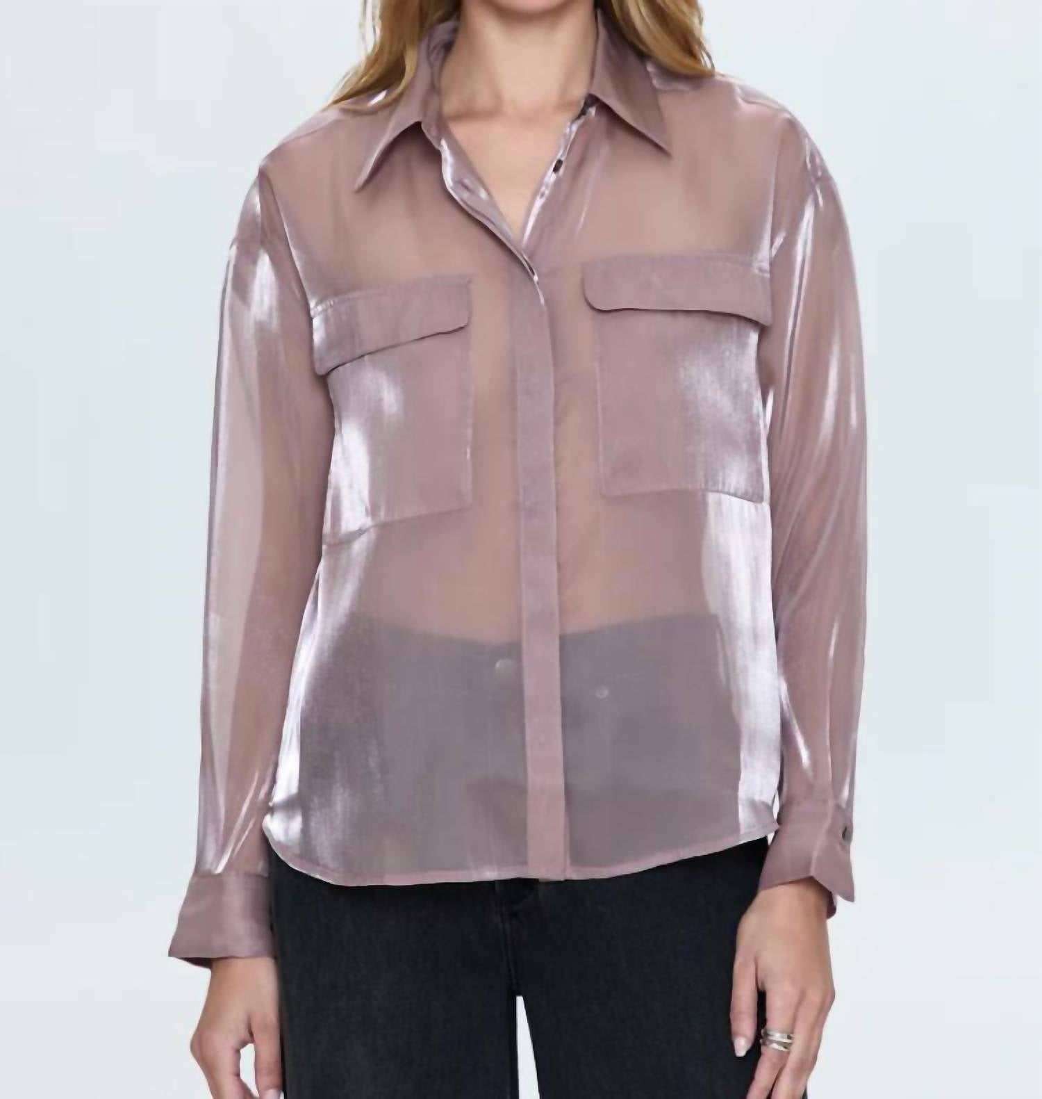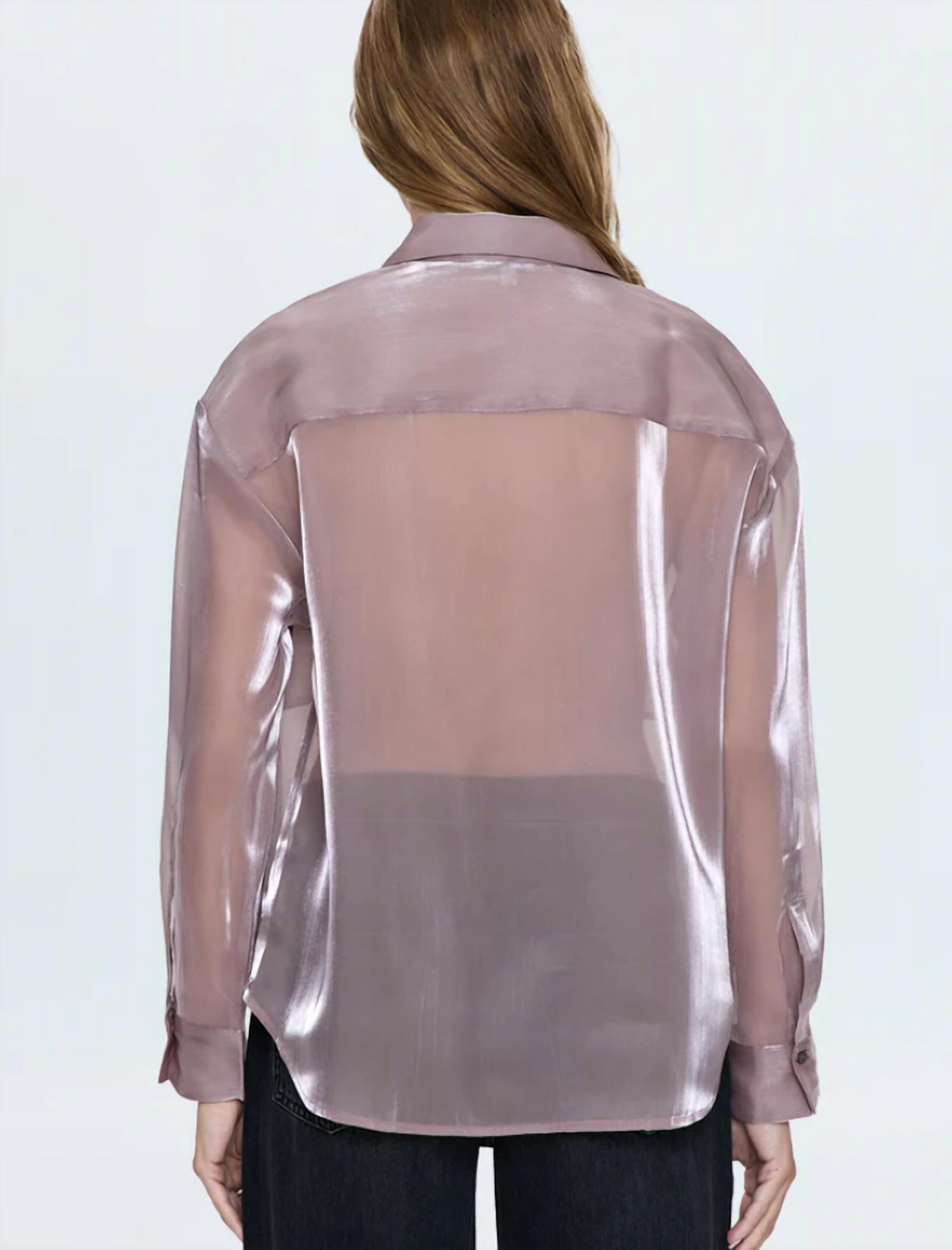 This button down shirt is comfortable yet polished. Discover the Miranda Sheer Organza Shirt by PISTOLA, a luxurious addition in a striking Sugar Plum hue. This button-up top features long cuffed sleeves, a collared neckline, and practical front flap pockets. Crafted from 100% polyester with a high sheen finish, it elevates any outfit with its metallic rose gold-inspired neutral tones. Closure: Button closure.