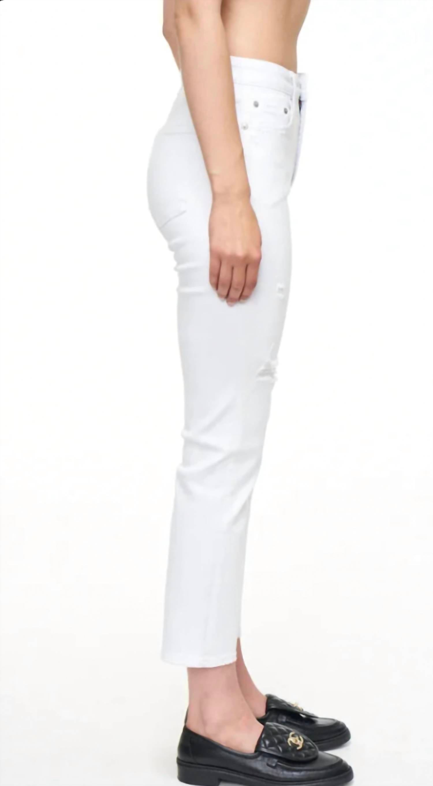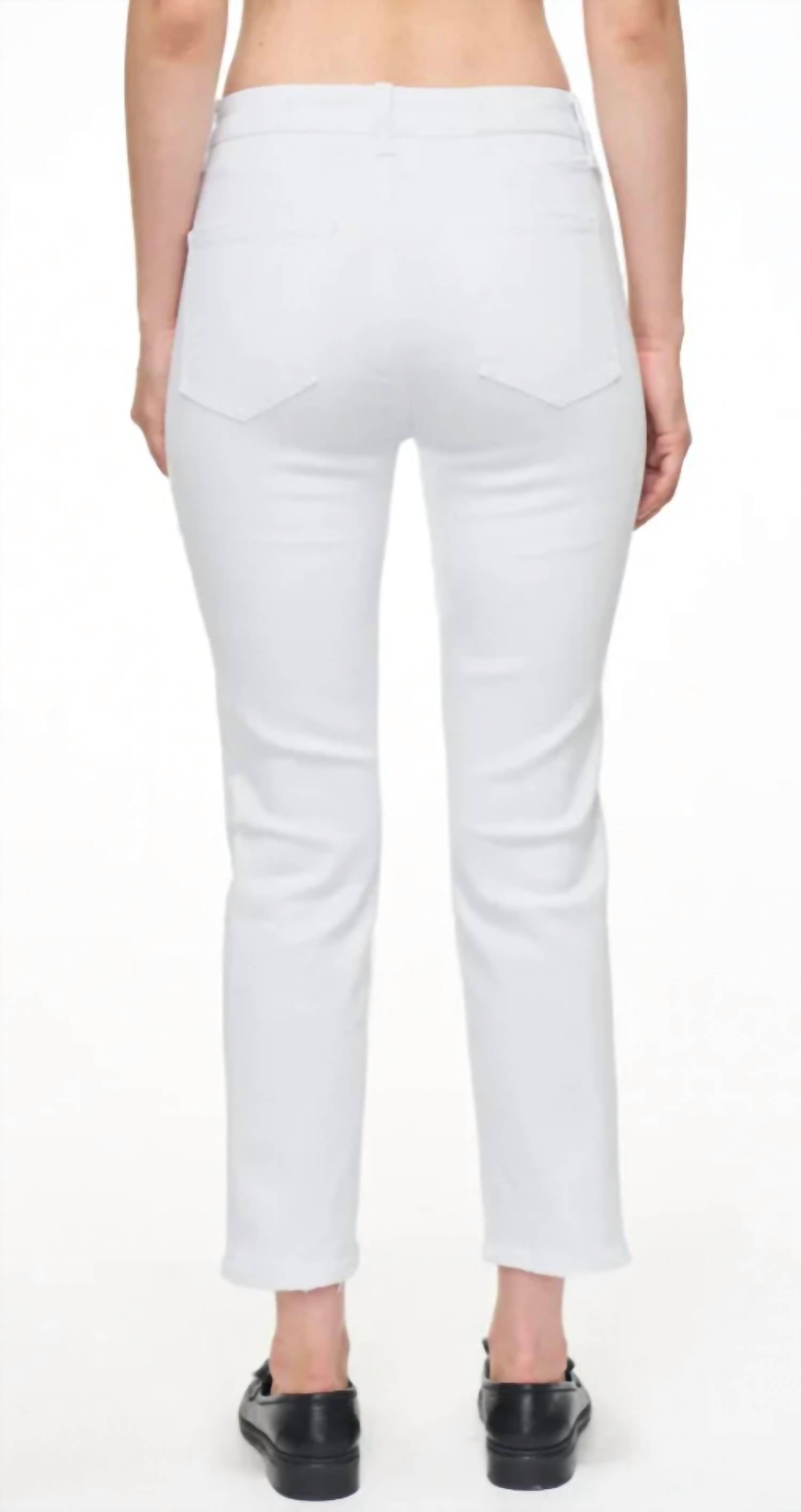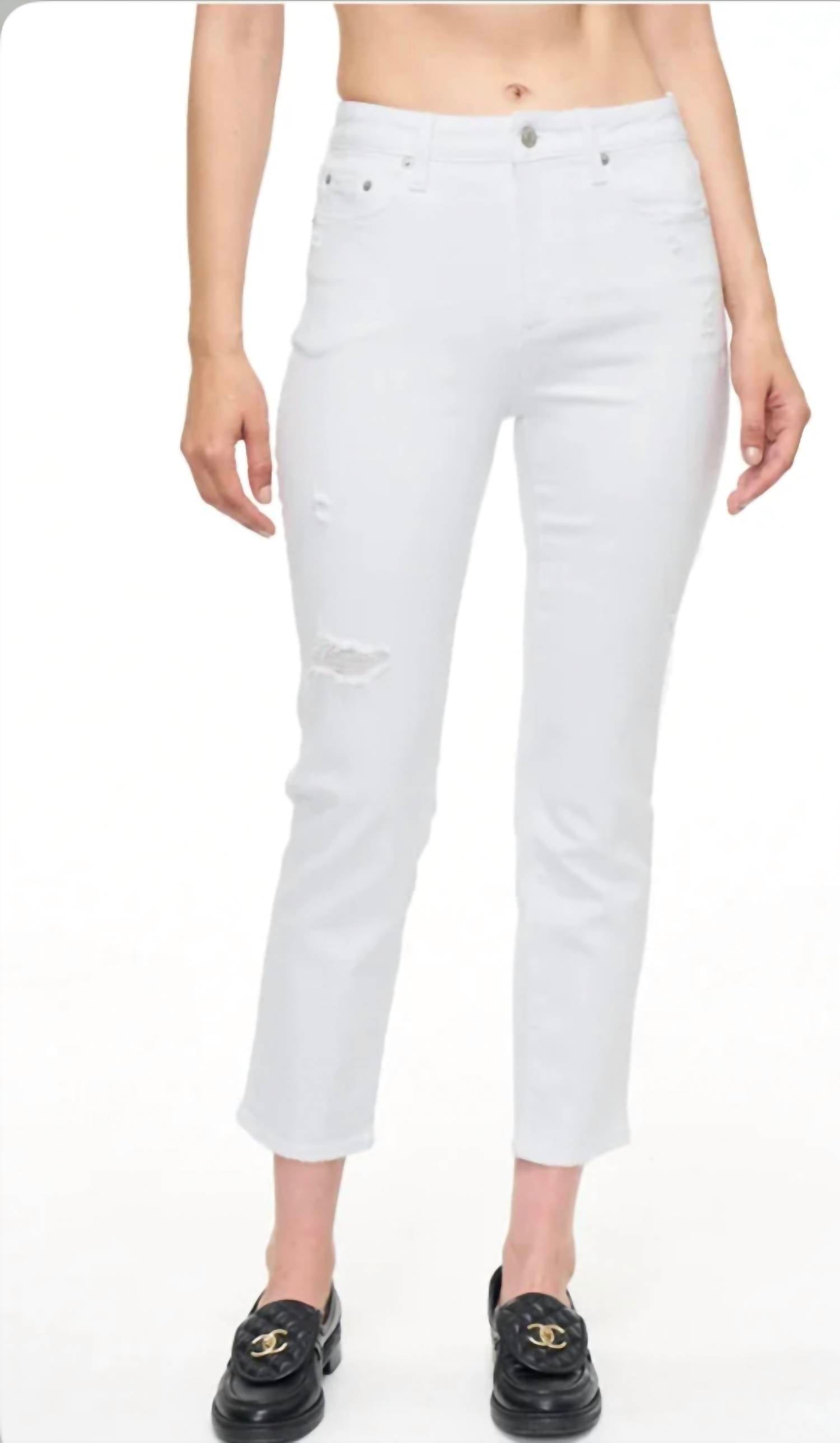 The Monroe is a high-rise cigarette crop. This style features super stretch Seashell Distressed wash, and slight distressing at the knees.