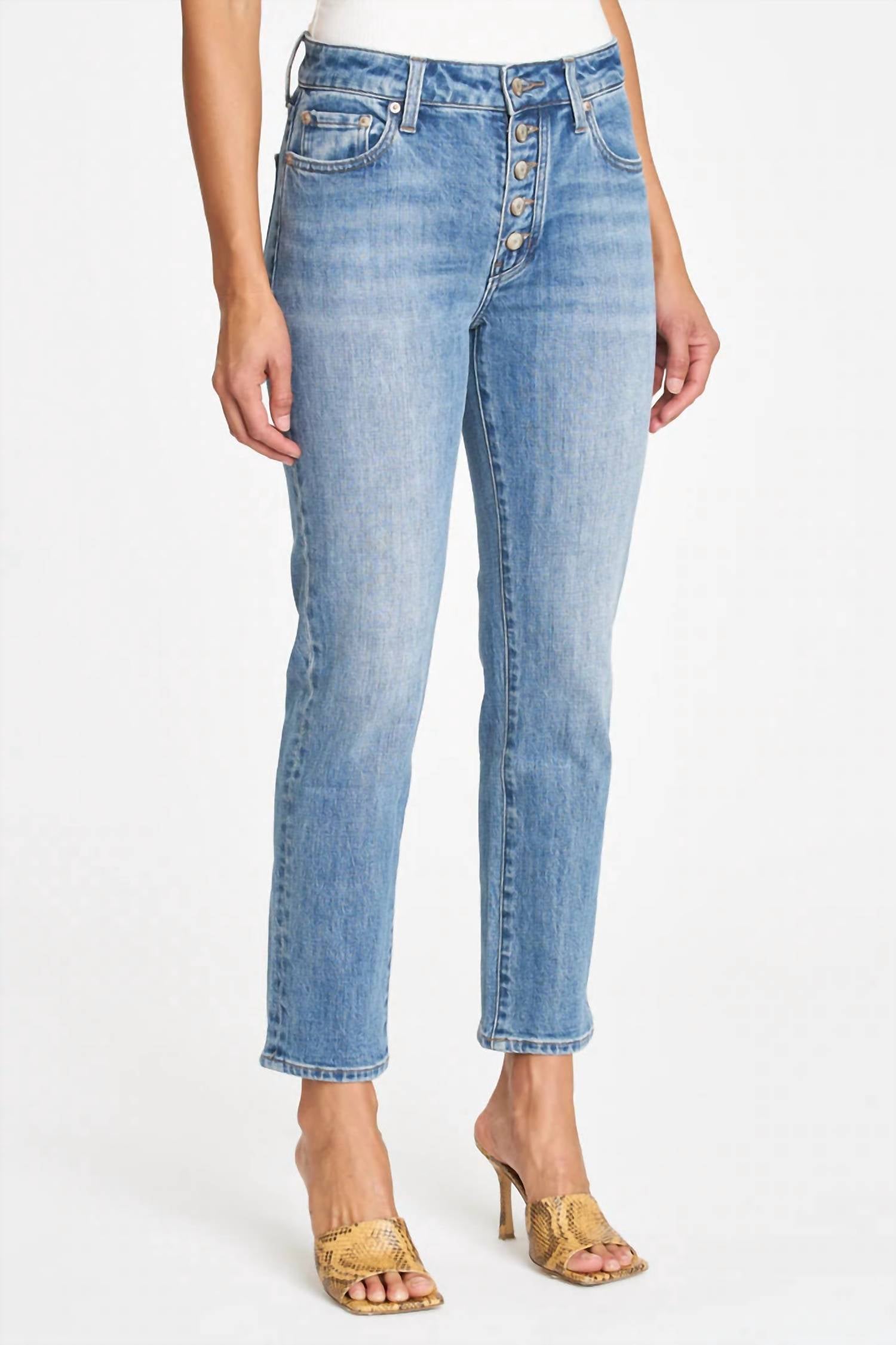 Tuck your favorite tee into these high-waist jeans for a more casual-cool feel. The Monroe is the perfect high-rise, comfort stretch slim cigarette jean. This style hits at the ankle and comes in a deep medium blue wash with a clean finish and contrast stitching. Rise: 10" | Inseam: 31" | Leg Opening: 13 1/2".