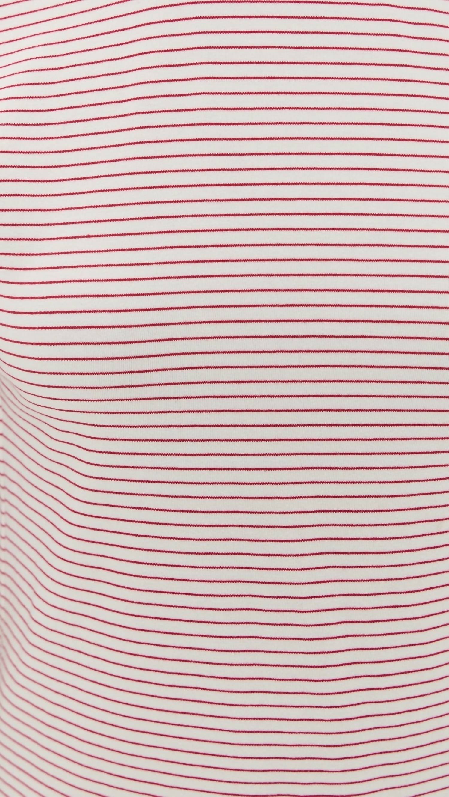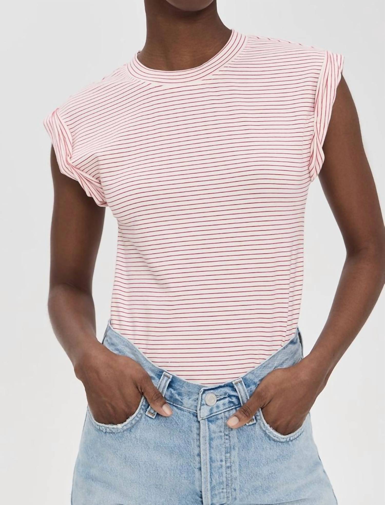 This muscle tee isn't just for the gym. Pair it with your favorite jeans for the perfect casual-cool vibe. Discover the Pistola Olivia Rolled Sleeve Tee in an eye-catching White/Ruby Stripe, perfect for adding a chic touch to your summer wardrobe. This women's muscle tee features cap sleeves with ruffled details and a classic crewneck, making it ideal for music festivals or a relaxed 90s fashion vibe. Crafted from a comfortable cotton blend of 95% cotton and 5% spandex, this top offers a lightweight feel for warmer days. Originating from China with a convenient pull-on closure, it is easy to maintain with a machine wash cold. The garment length is 22 inches, ensuring a flattering fit for any occasion.