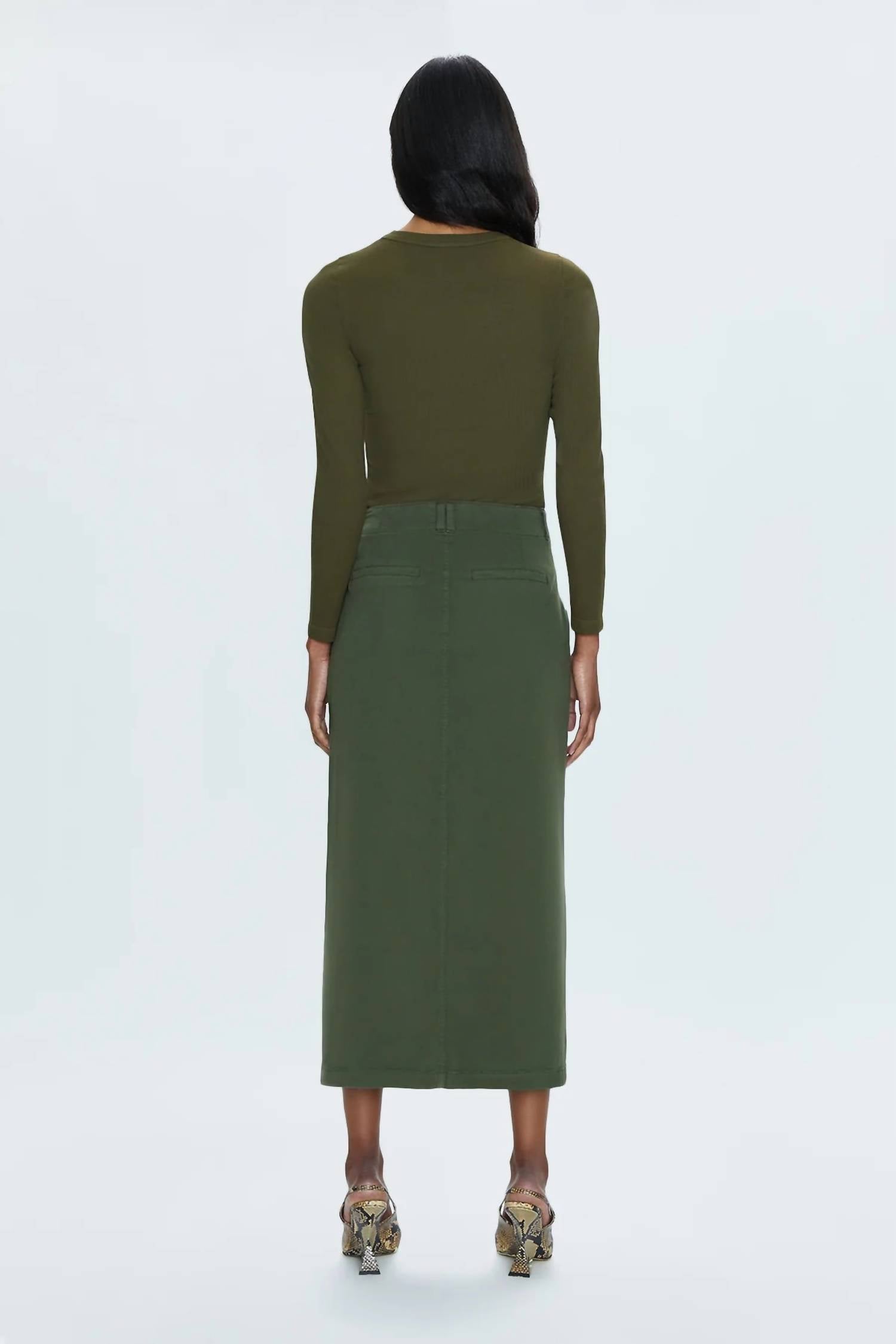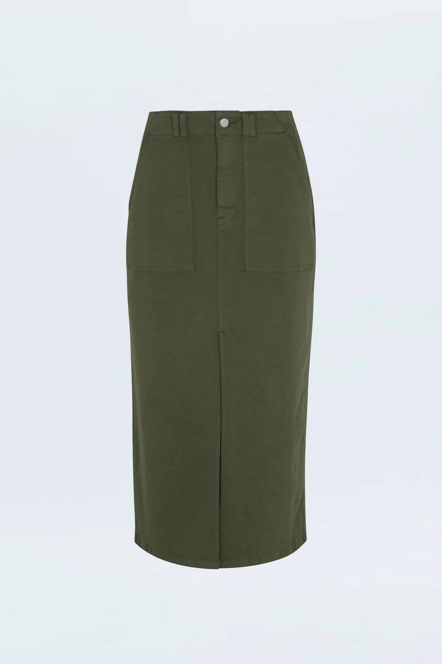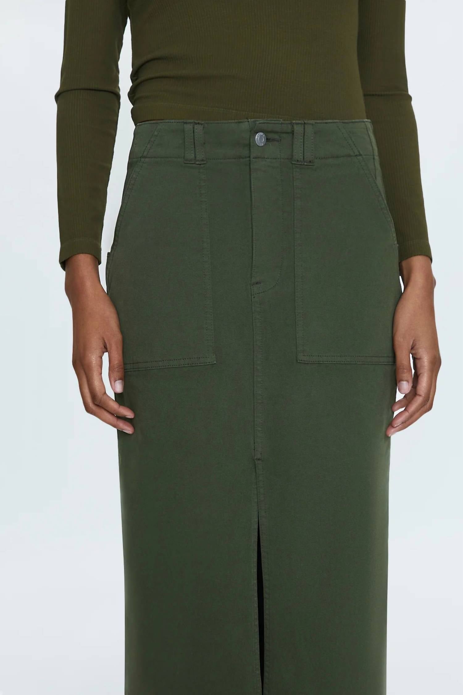 Tuck your favorite tee into this midi length skirt for an effortlessly cool look. This stunning skirt in an elevated Admiral military green colorway features a comfort stretch composition with 99% Cotton and 2% Spandex. With a chic high rise waist and practical patch front pockets, it showcases a thoughtfully designed front slit for easy movement. Originating from China, it closes with a button for a polished finish.